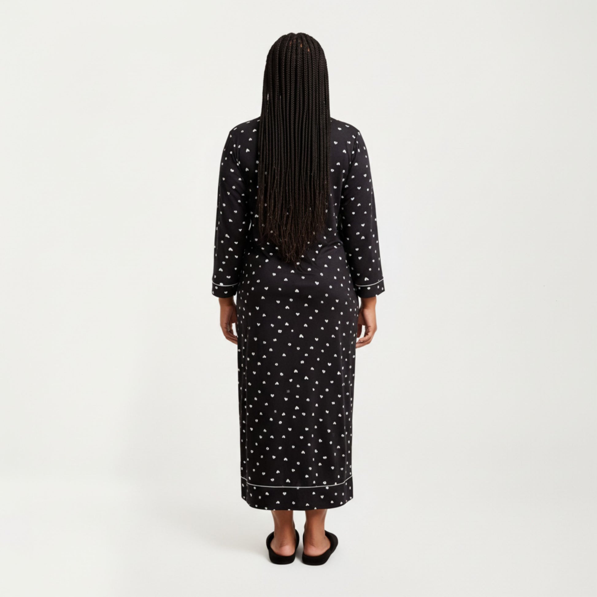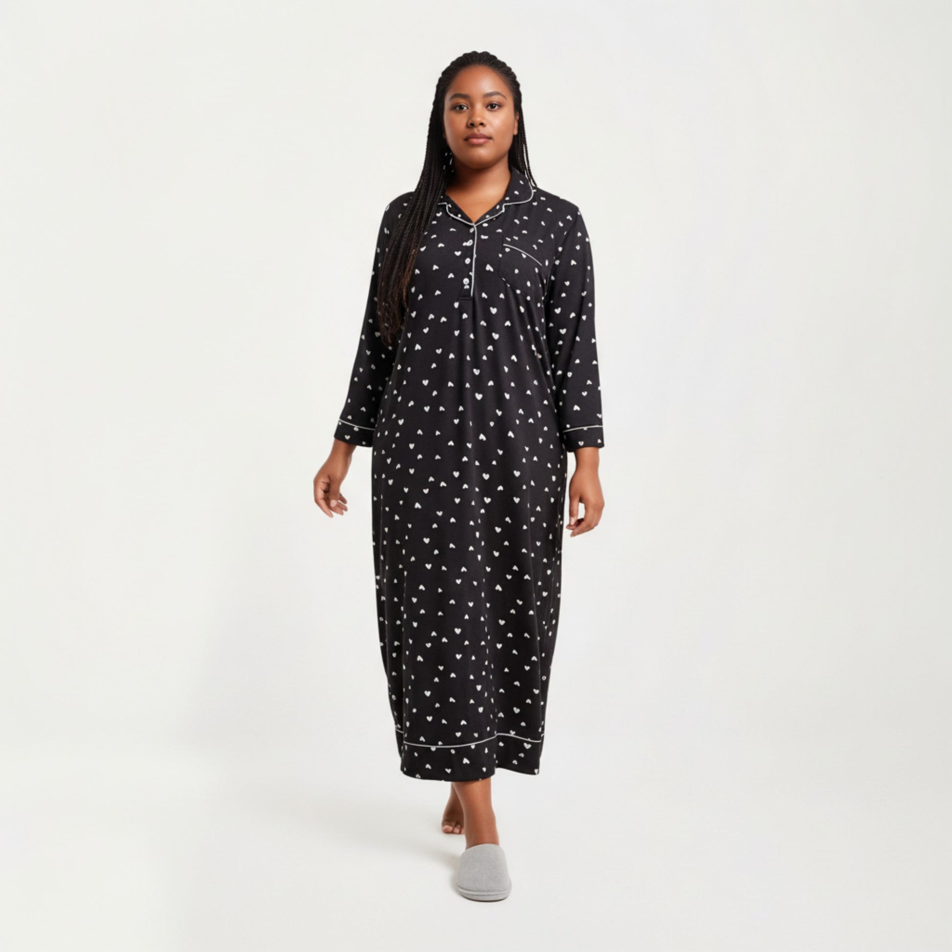 This Anna-Kaci Women¡¯s maxi nightgown features a soft stretch fabric printed with delicate heart motifs that create a charming, cohesive look. The long sleeves and piped collar add classic sleepwear detailing, while the relaxed flowing silhouette provides ease and comfort. A chest pocket and partial button placket enhance the design with subtle structure. Crafted for softness and movement, this nightgown offers a smooth, breathable feel.