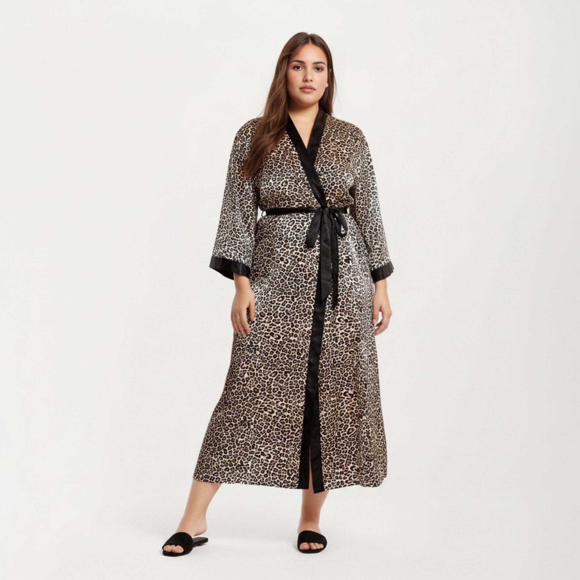 Anna-Kaci Lounge Women' s Leopard Print Satin Robe with Contrast Trim Soft Silky Fabric Waist Tie Closure and Flowing Longline Silhouette