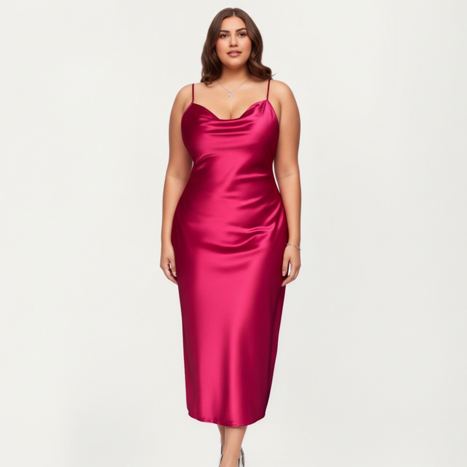 Anna-Kaci Lounge Women' s Satin Slip Midi Dress with Draped Neckline Adjustable Straps and Soft Body-Skimming Flowing Silhouette