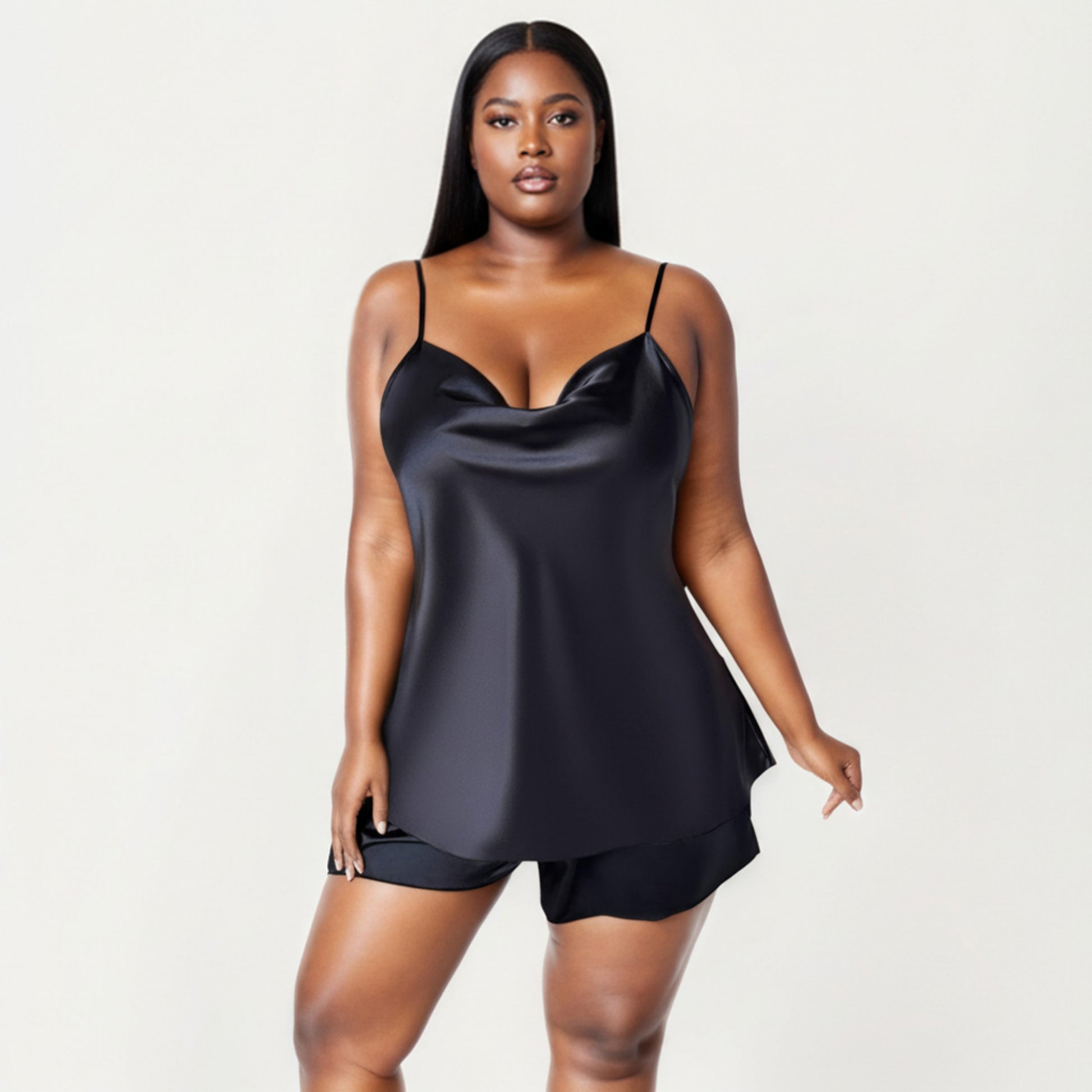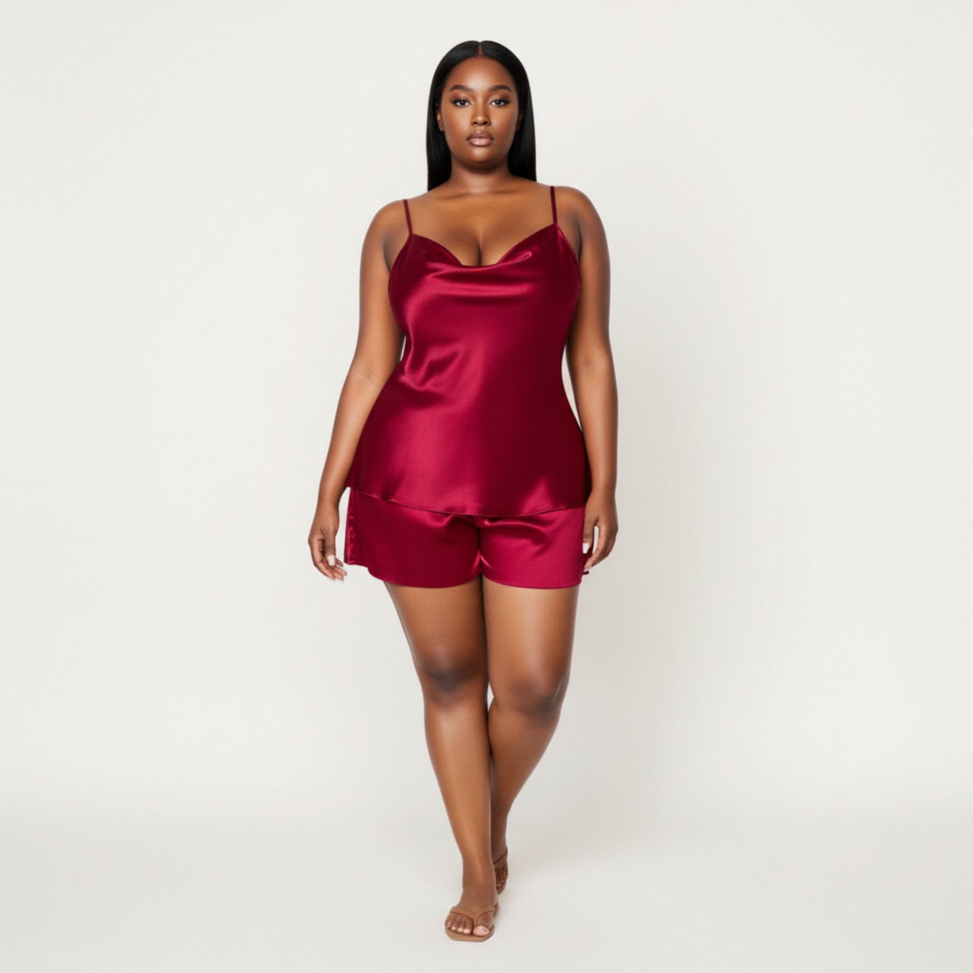 Anna-Kaci Lounge Women' s 2-Piece Satin Cami and Shorts Set with Draped Neckline Silky Fabric and Lightweight Relaxed Fit