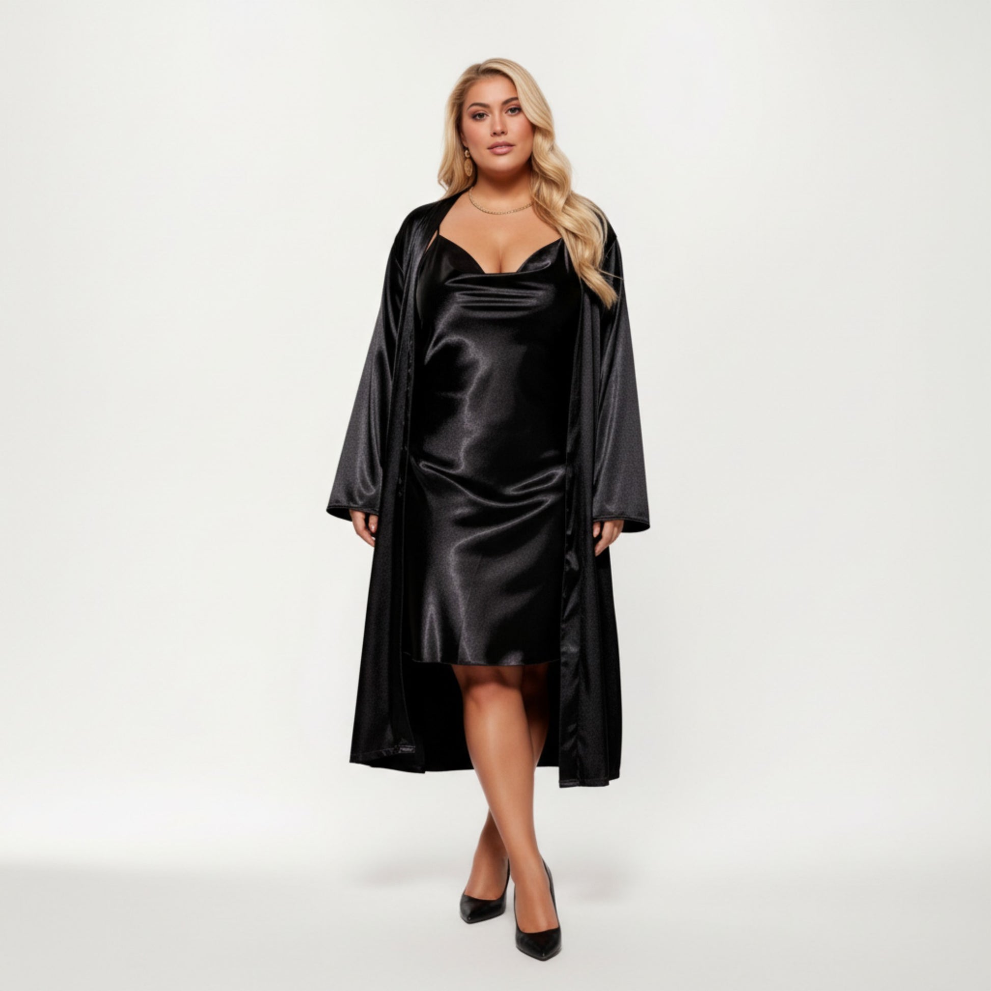 Anna-Kaci Lounge Women' s Satin Slip Dress and Long Robe Set with Soft Draped Silhouette and Elegant Flowing Layered Design