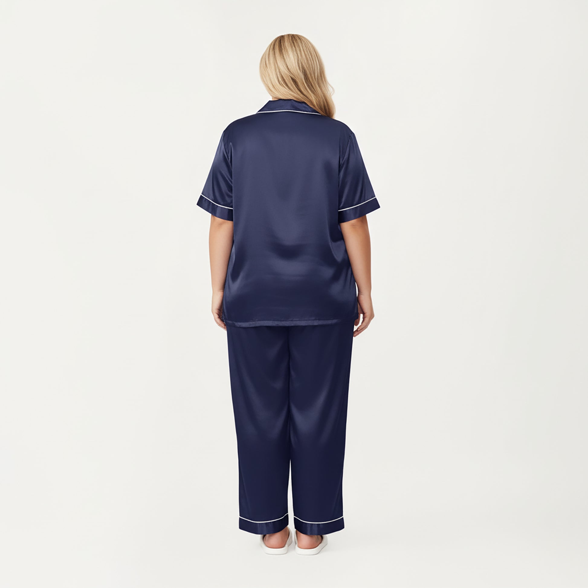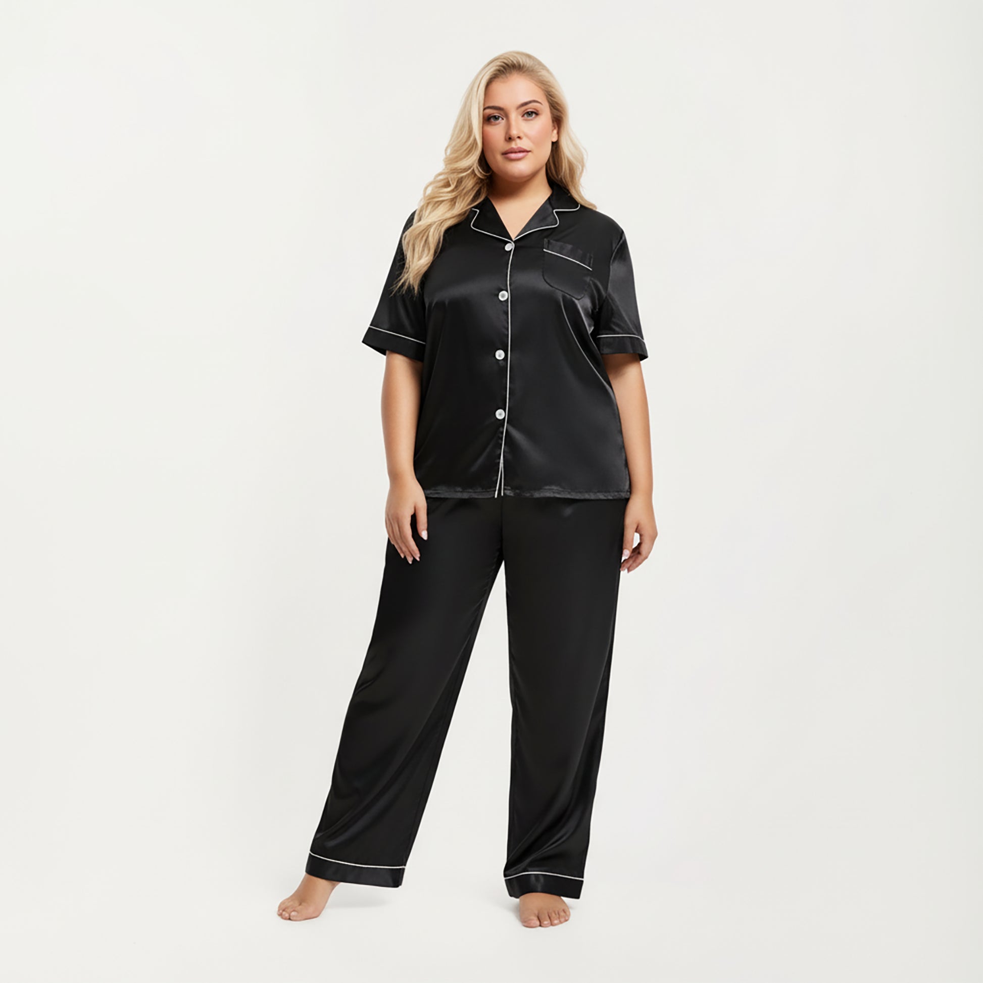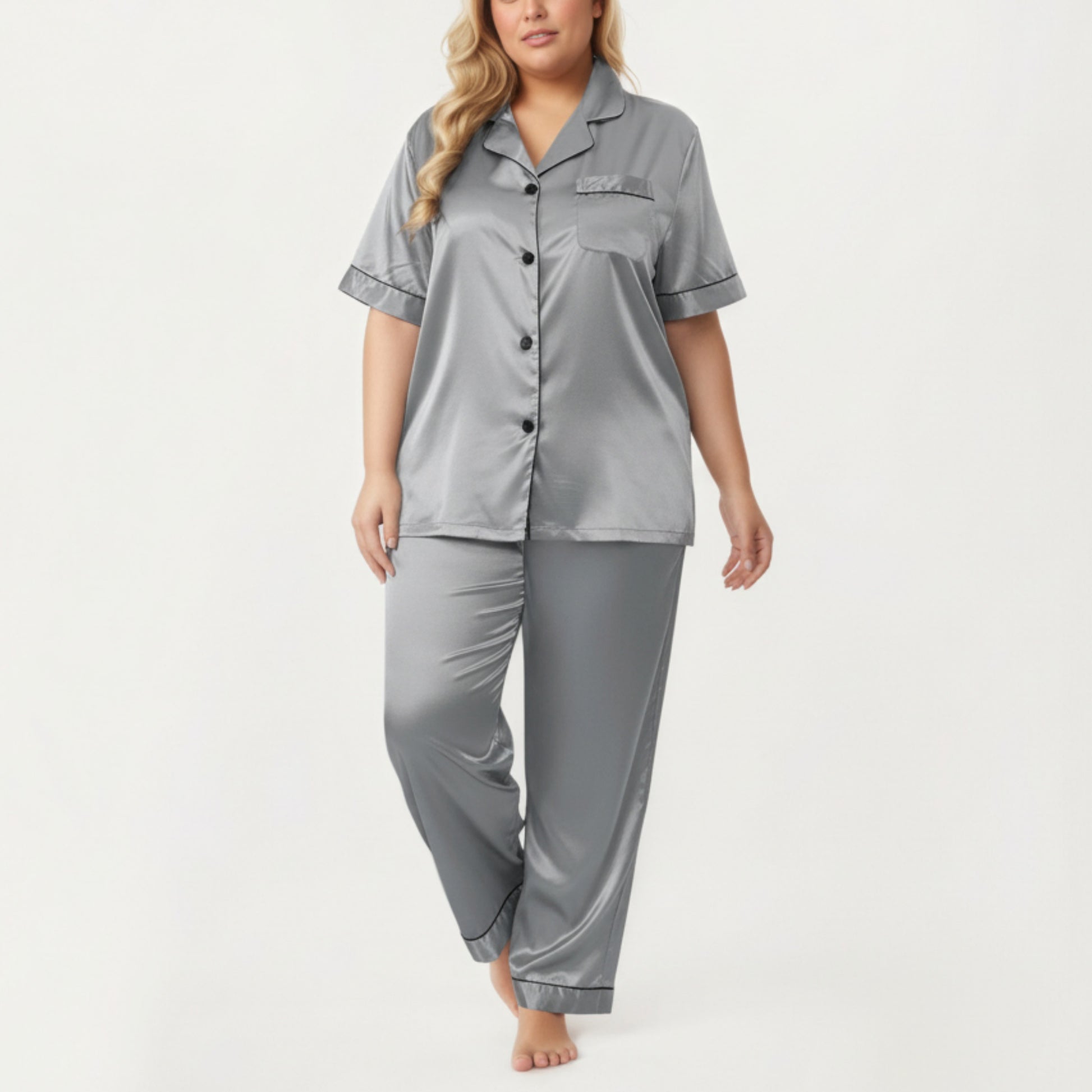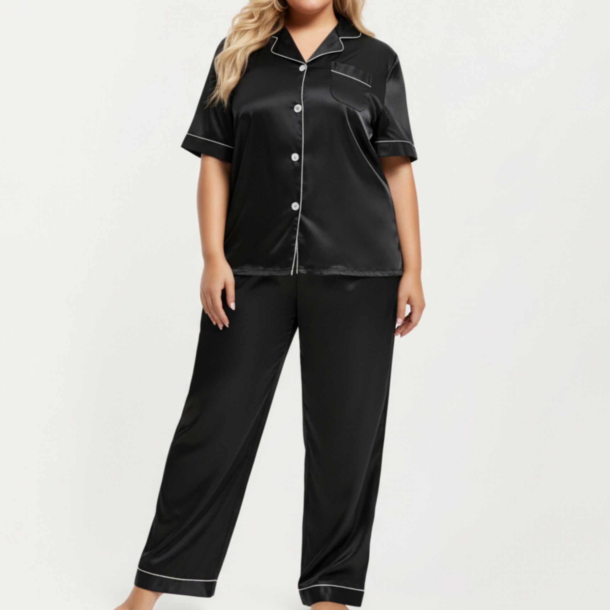 Anna-Kaci Lounge Women's PLus Size Satin Pajama Set with Short Sleeve Button Front Top and Relaxed Straight Leg Pants