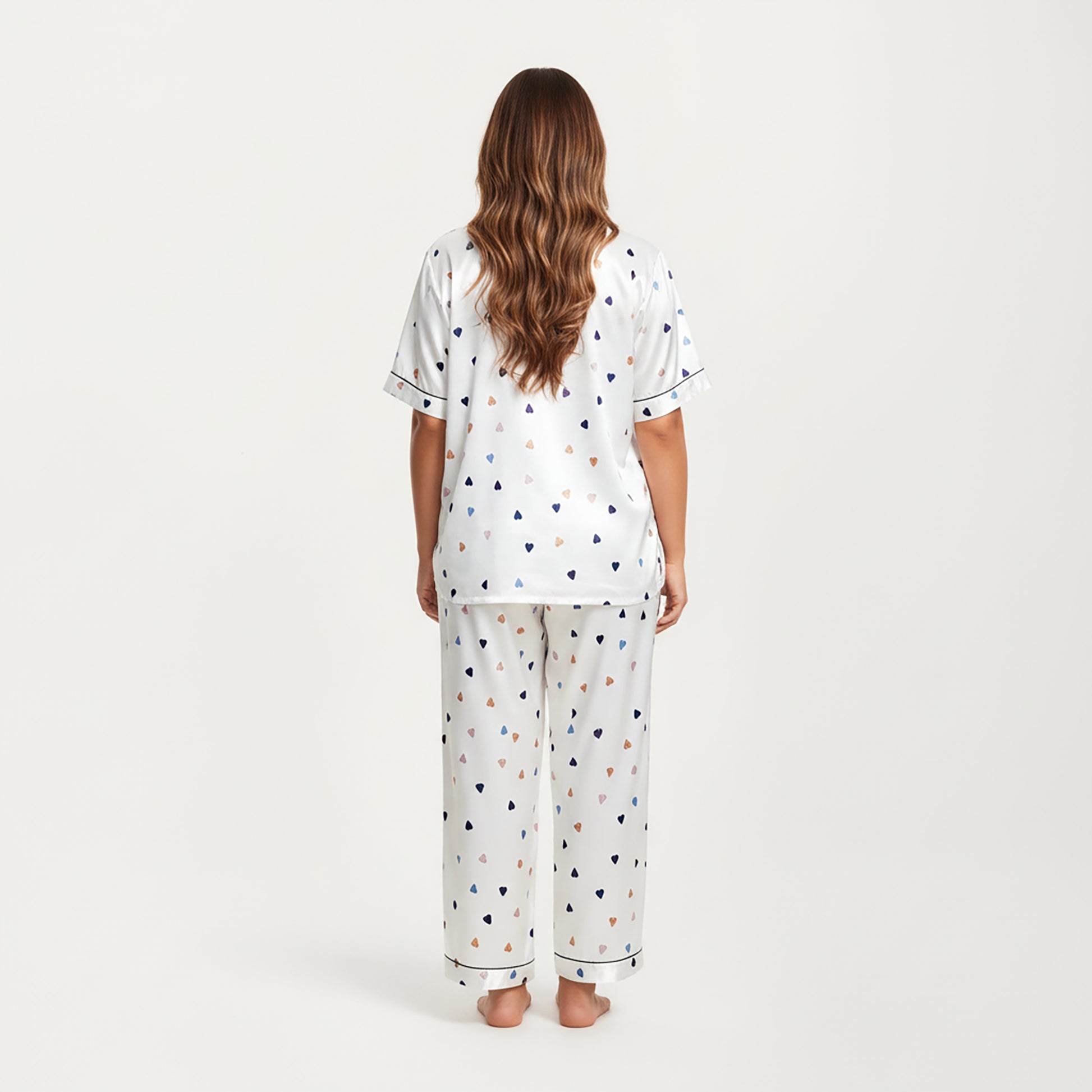 This Anna-Kaci Women's pajama set features a charming heart print on smooth satin fabric for a soft, silky feel against the skin. The short sleeve button-front top offers relaxed comfort with classic piping details, while the straight-leg pants provide an easy, breathable fit. Designed with a gentle drape and polished finish, this coordinated set brings playful style and luxurious comfort to your loungewear collection.
