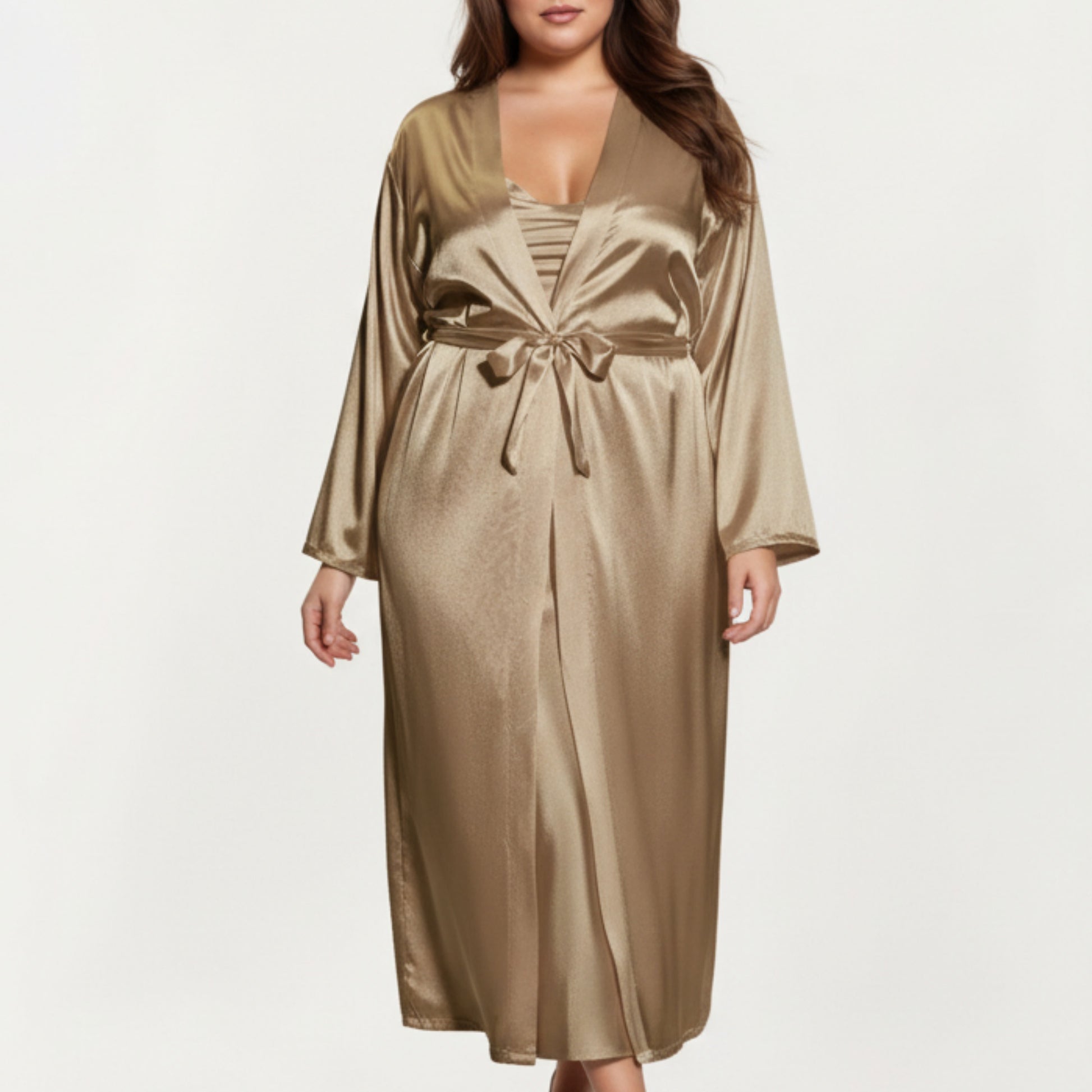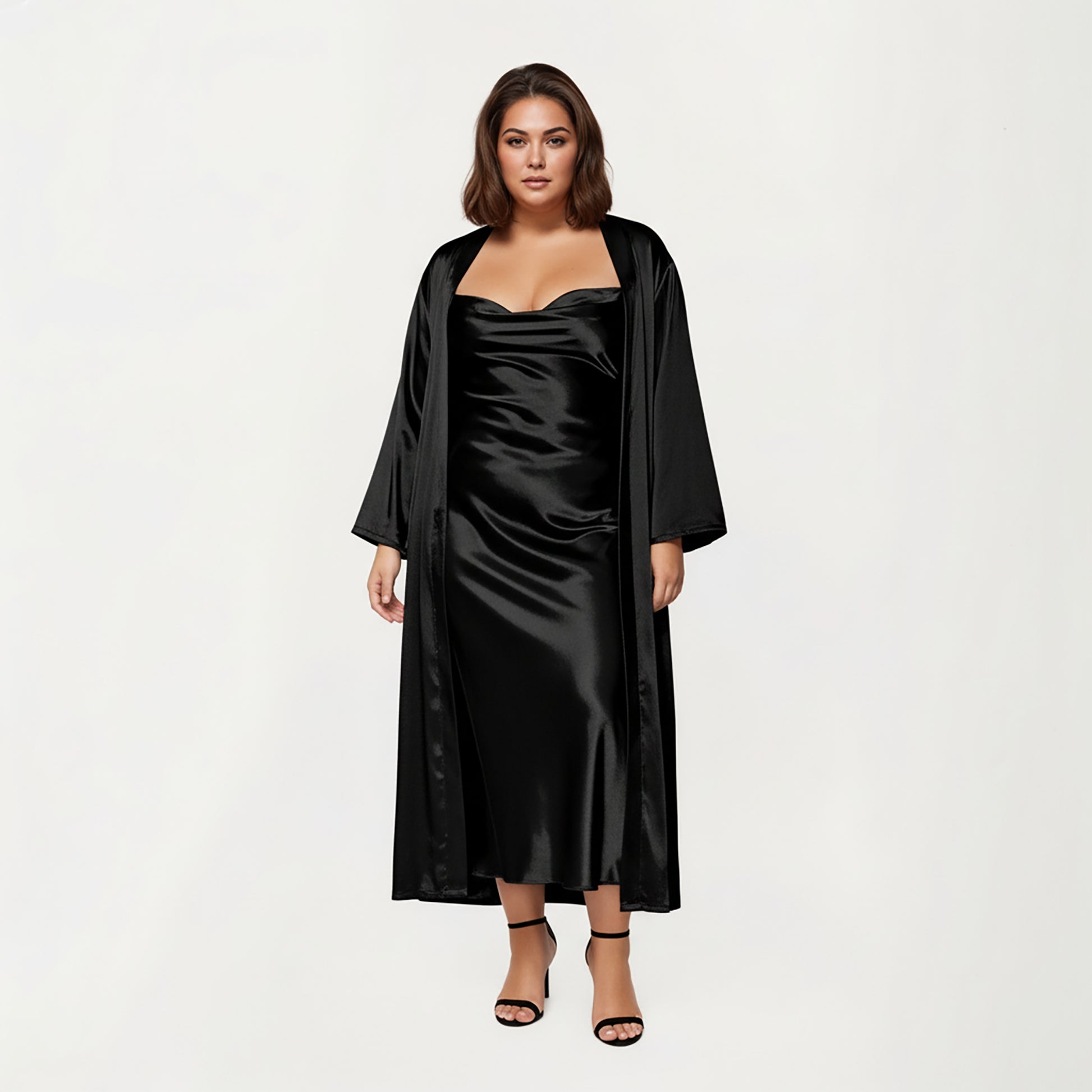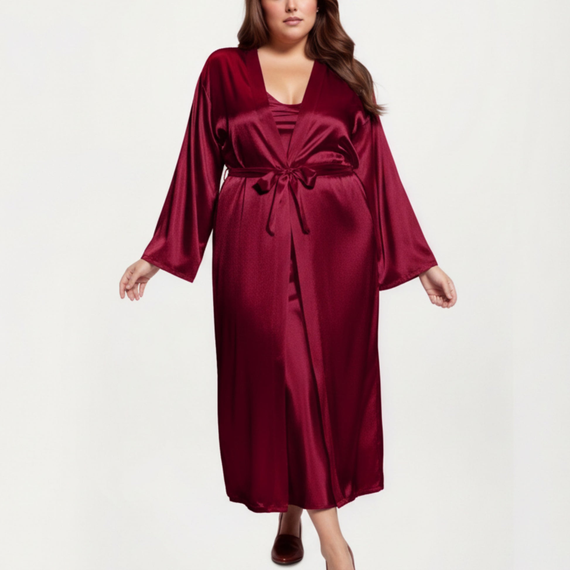 Anna-Kaci Lounge Women's PLus Size Satin Robe and Slip Set with Smooth Draping Fabric and Elegant Silhouette