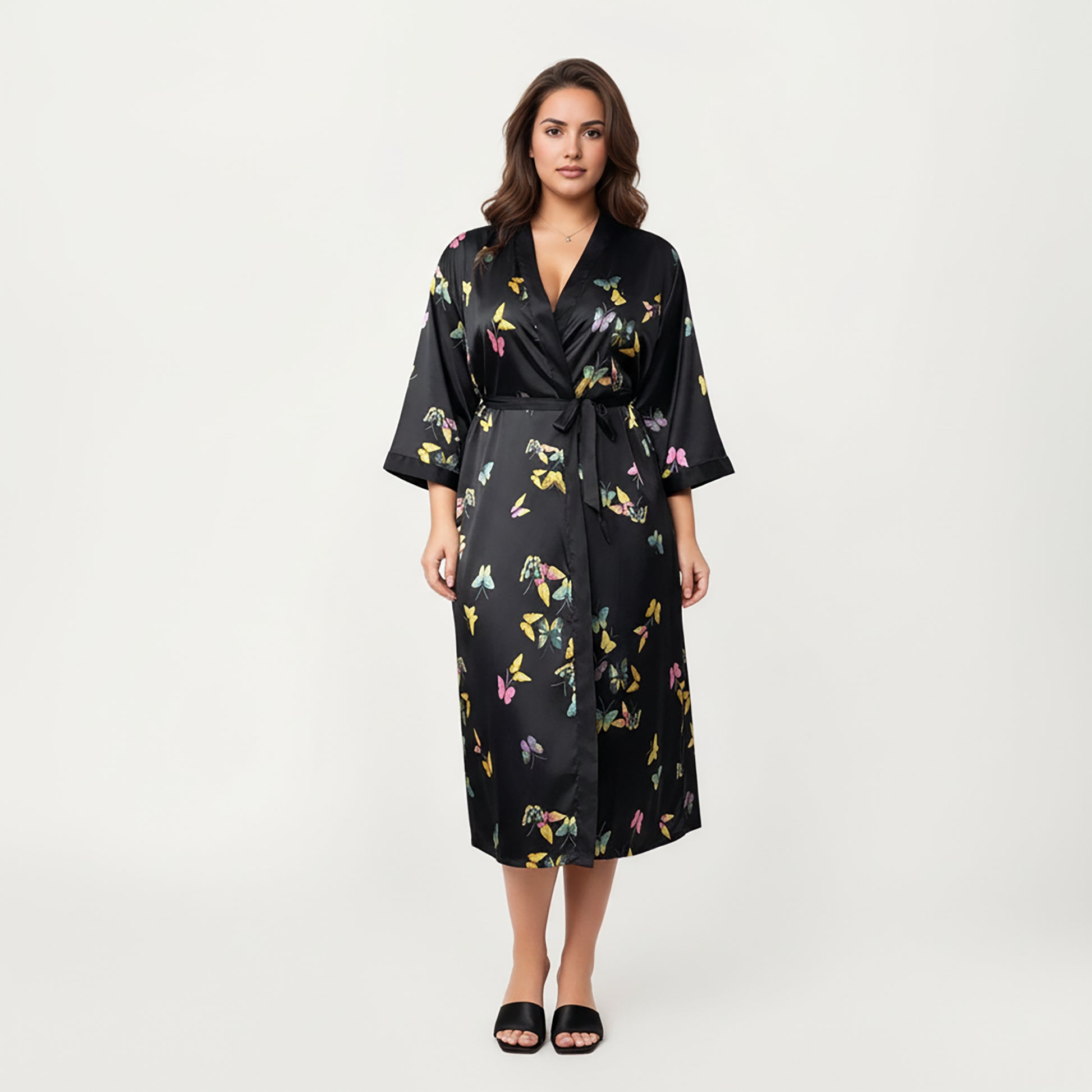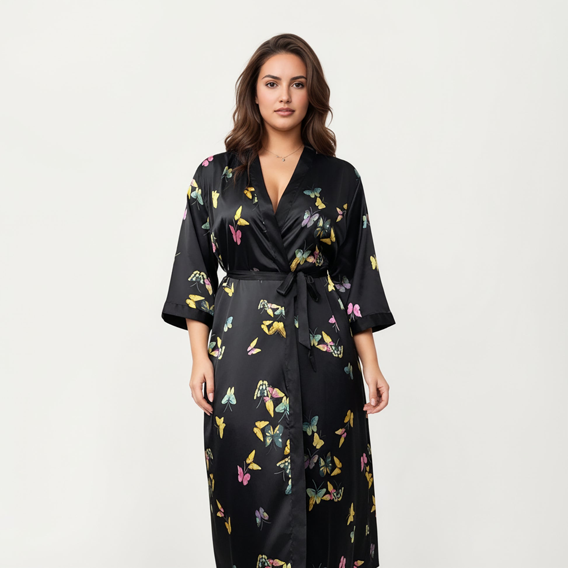 Anna-Kaci Lounge Women's PLus Size Butterfly Print Satin Robe with Wrap Front Design, Wide Sleeves, and Adjustable Tie Waist Belt
