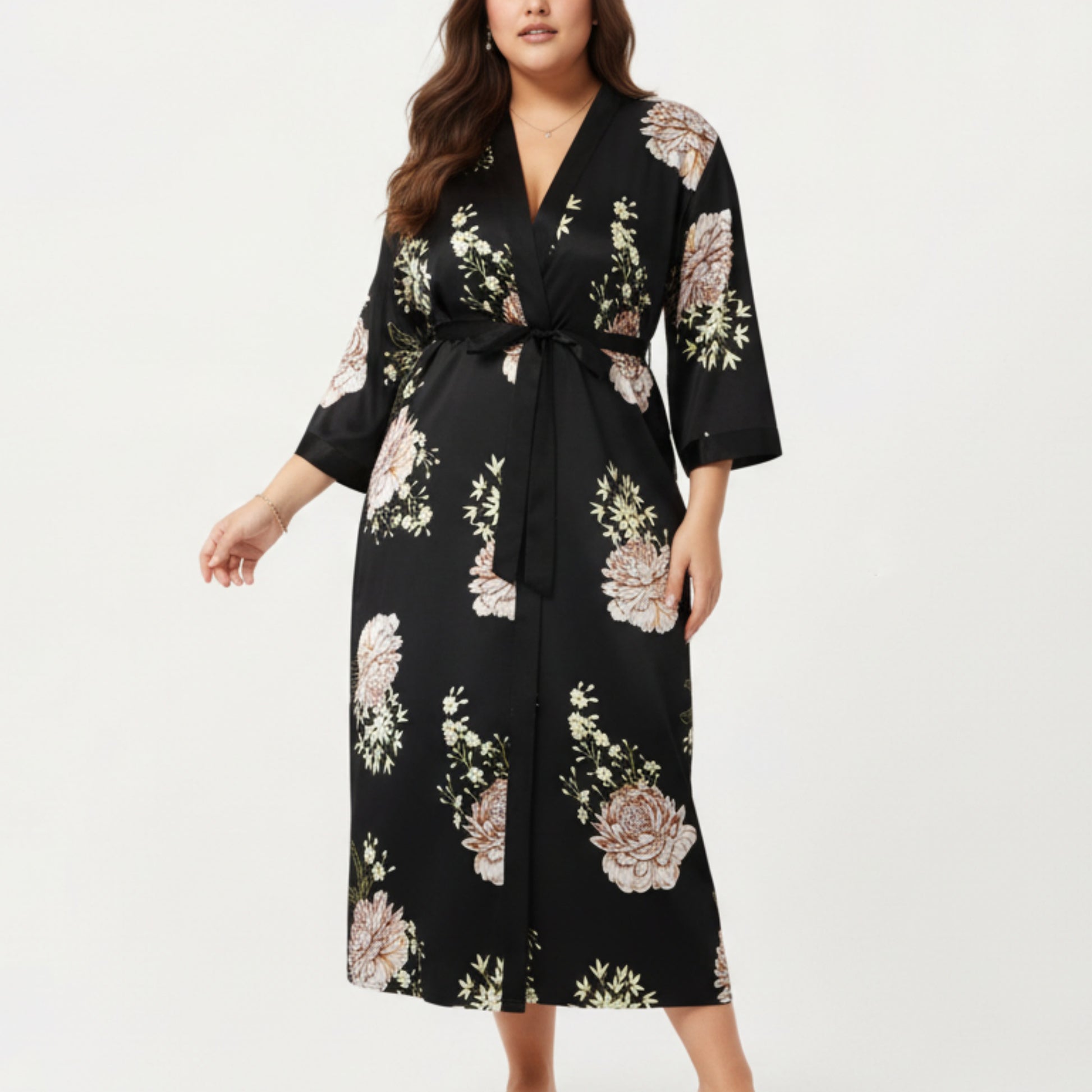 Anna-Kaci Lounge Women's PLus Size Floral Satin Long Robe with Contrast Trim, Wrap Front Silhouette and Waist Tie Belt