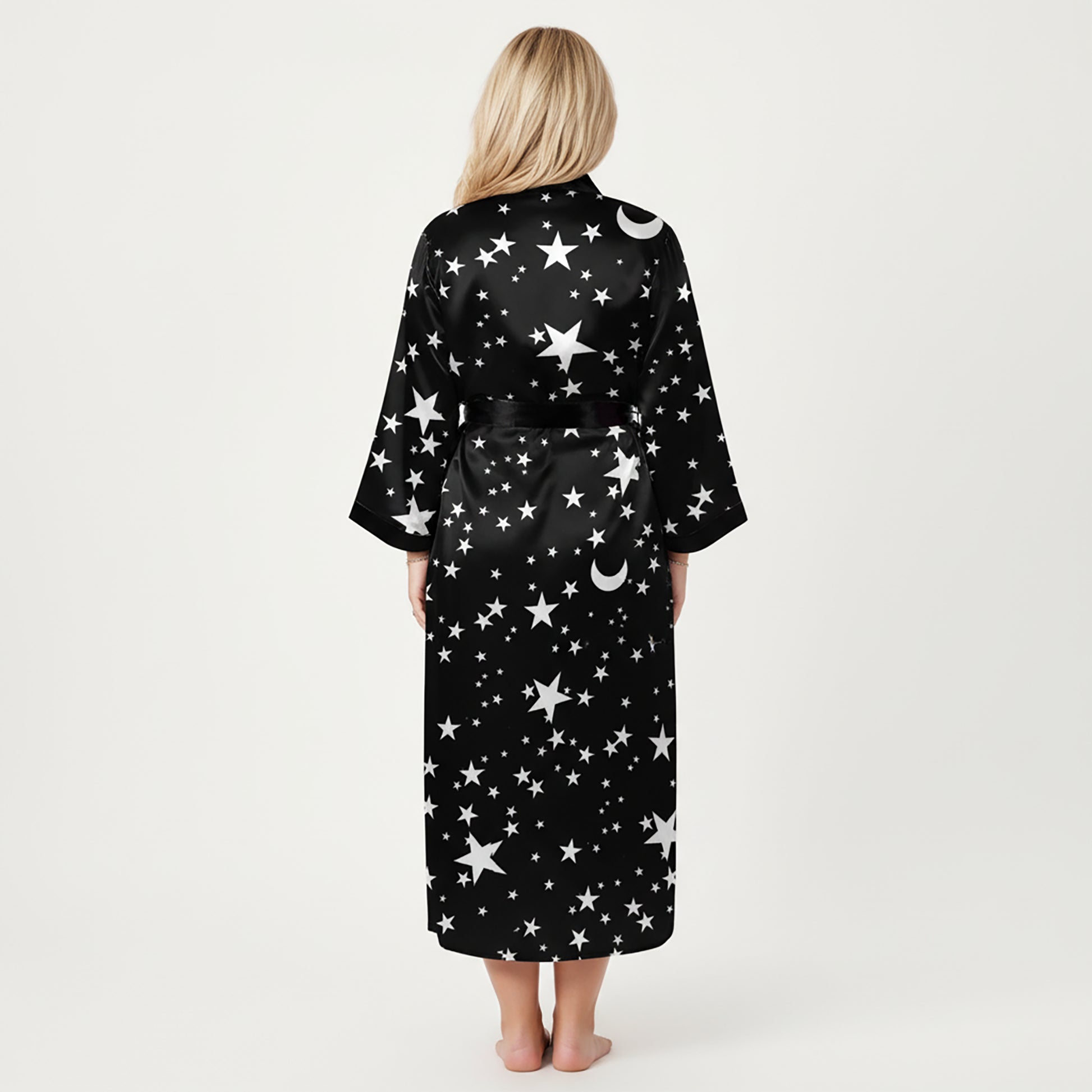 This Anna-Kaci Women's robe features a playful star print on a smooth satin-feel fabric that glides comfortably over the skin. The open-front silhouette includes a matching waist tie for adjustable coverage and a flattering fit. Long sleeves and a full-length drape create a relaxed, elegant feel perfect for unwinding. Crafted with a lightweight, silky texture, this robe adds ease and comfort to any cozy moment at home.