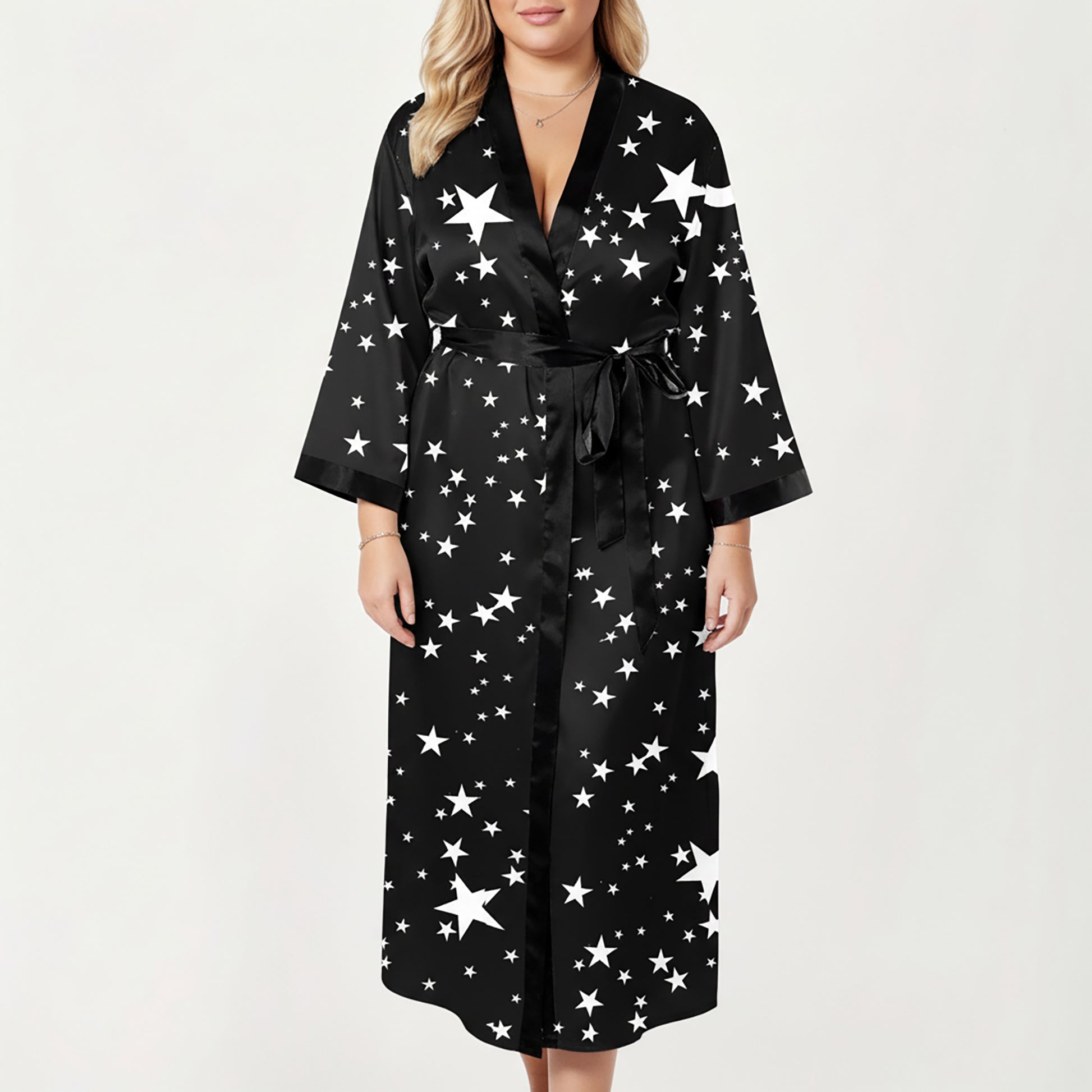 Anna-Kaci Lounge Women's PLus Size Star Print Long Robe with Soft Satin Feel, Open Front Design, and Adjustable Waist Tie
