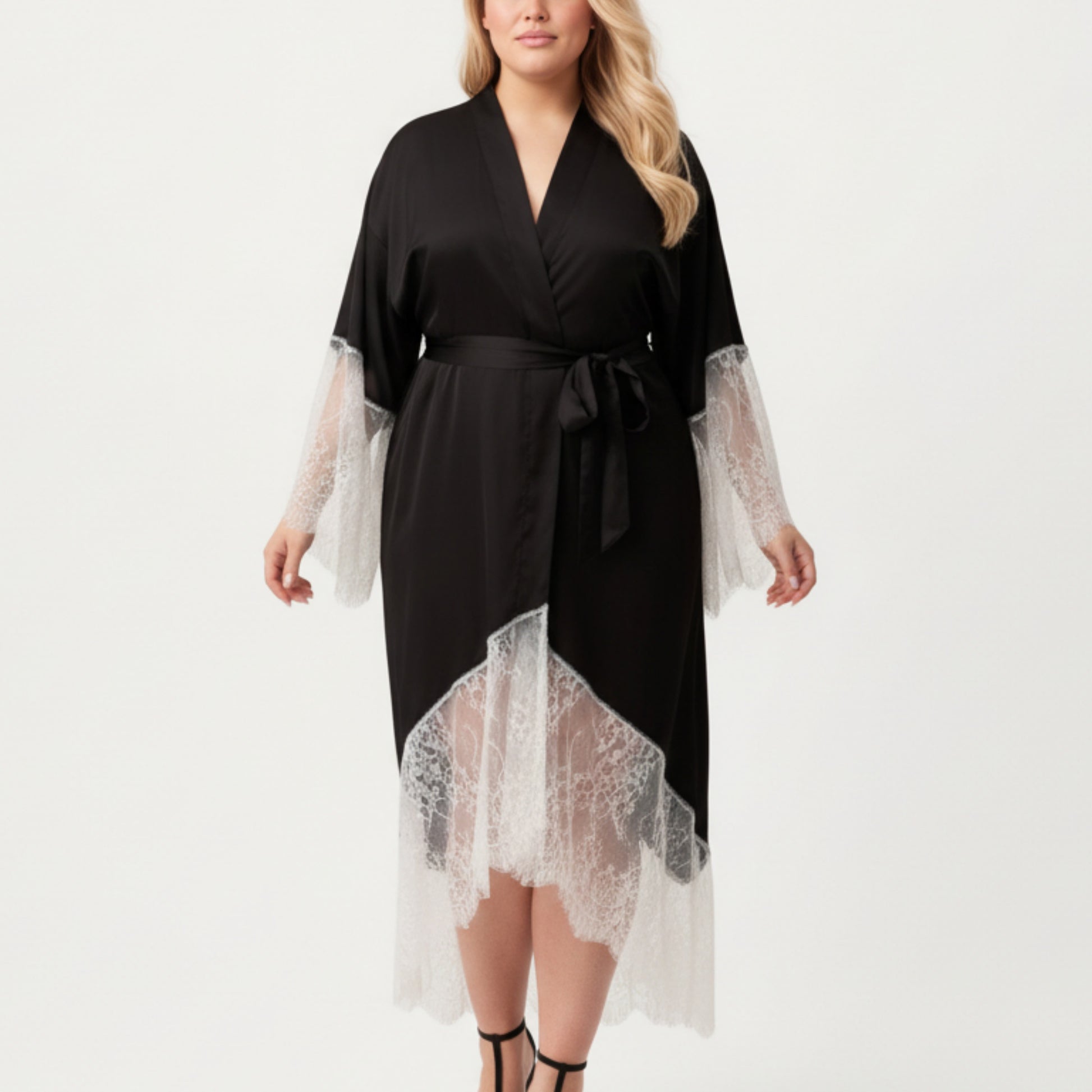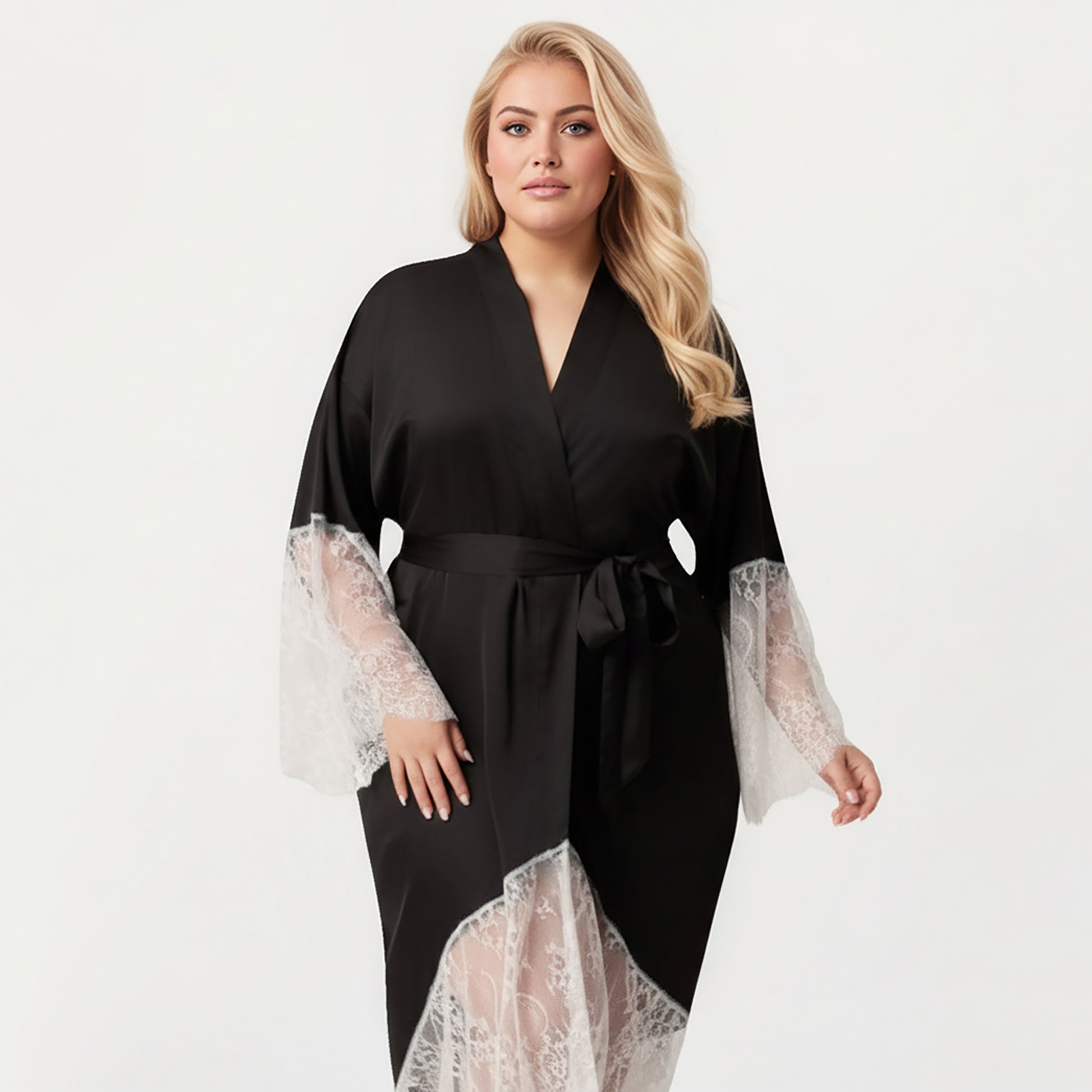 This Anna-Kaci Women's plus size robe features a flowing silhouette with intricate sheer lace detailing along the hem and sleeves, creating a soft, feminine finish. The smooth fabric drapes beautifully, providing comfort and elegant movement. Designed with wide sleeves and a matching belt, it allows customizable shaping while maintaining ease. Perfect for relaxing moments, this robe offers breathable softness and elevated style in every wear.