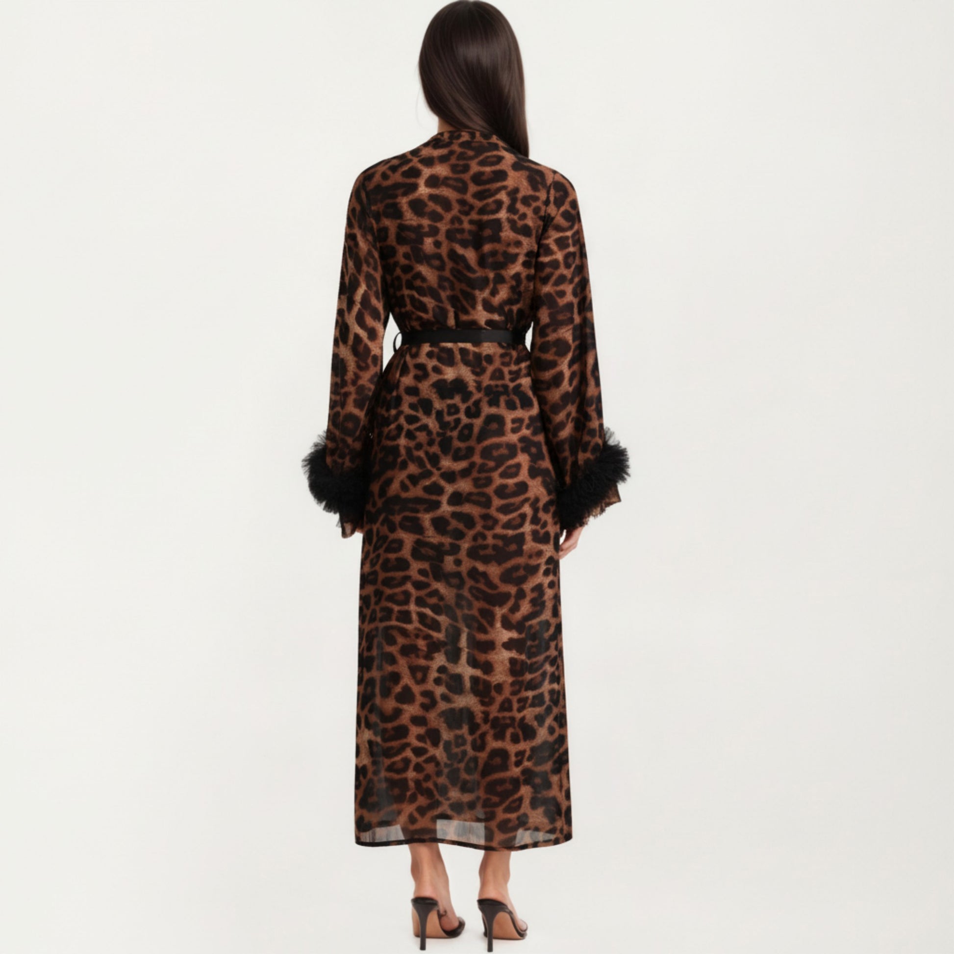 Anna-Kaci Lounge Women's Leopard Print Mesh Robe Dress with Feather Sleeves and Satin Tie Waist in Longline Silhouette