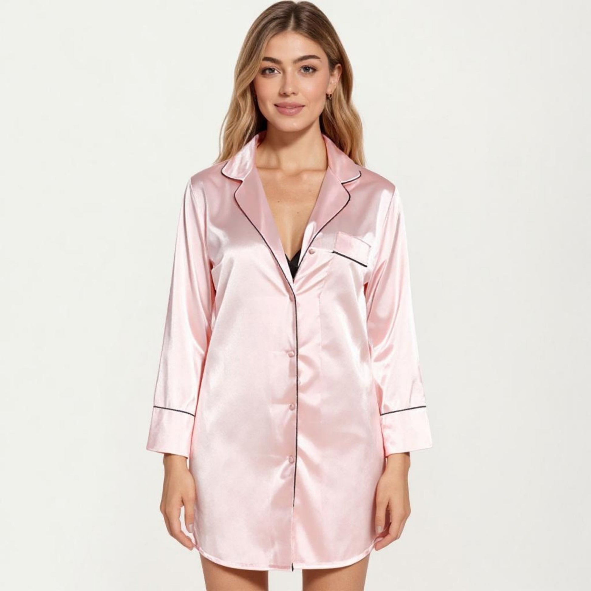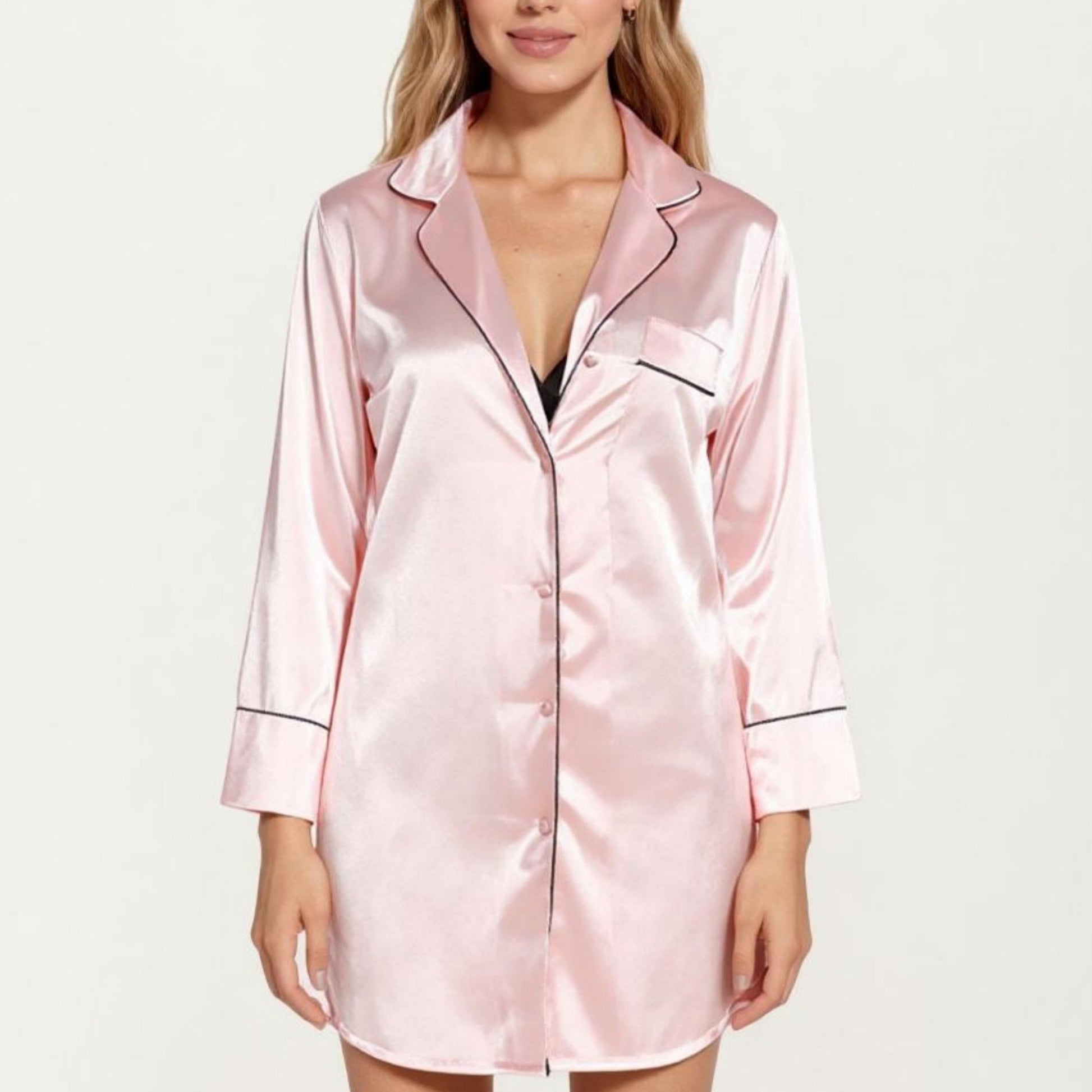 Anna-Kaci Lounge Women's Satin Button-Front Sleep Shirt with Contrast Piping Trim and Relaxed Long Sleeve Silhouette