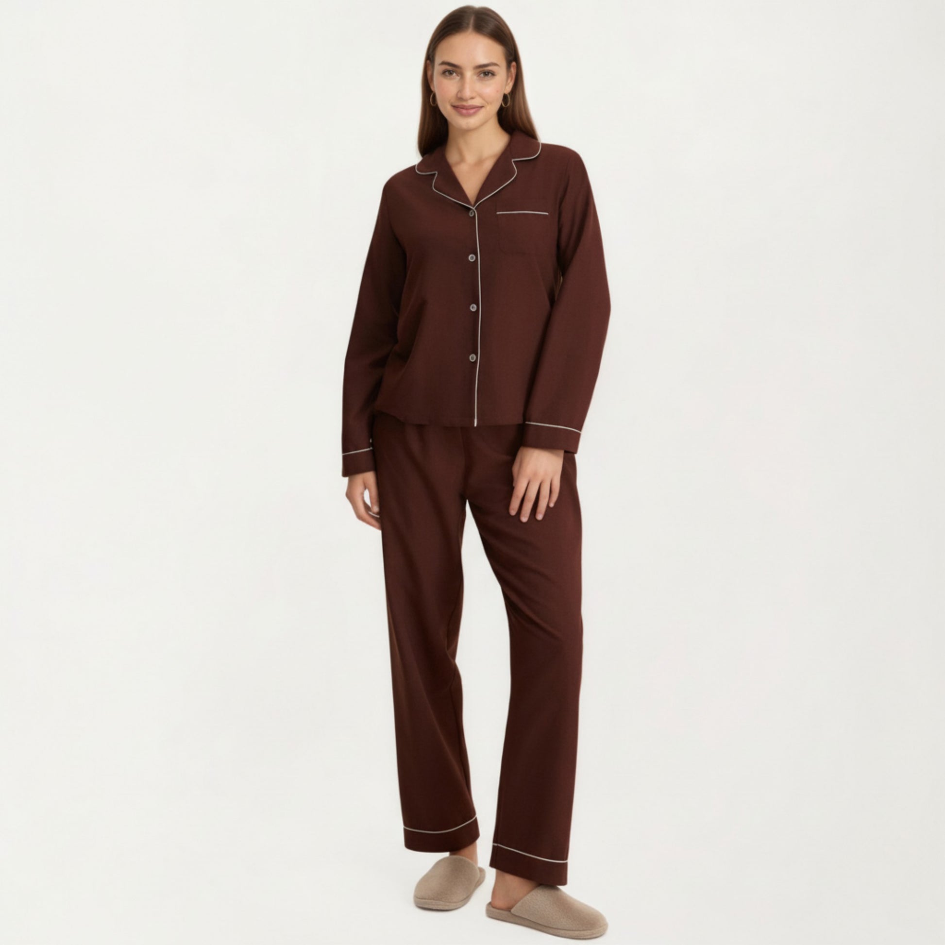 The Anna-Kaci Women's Long Sleeve Pajama Set features a soft, smooth fabric that delivers all-day comfort with a breathable feel. The button-front top includes a classic notched collar and subtle piping that elevates the clean, minimal design. Matching straight-leg pants provide a relaxed fit that moves easily without feeling restrictive. This coordinated set blends simplicity, comfort, and refined detailing for an effortless everyday lounge look.