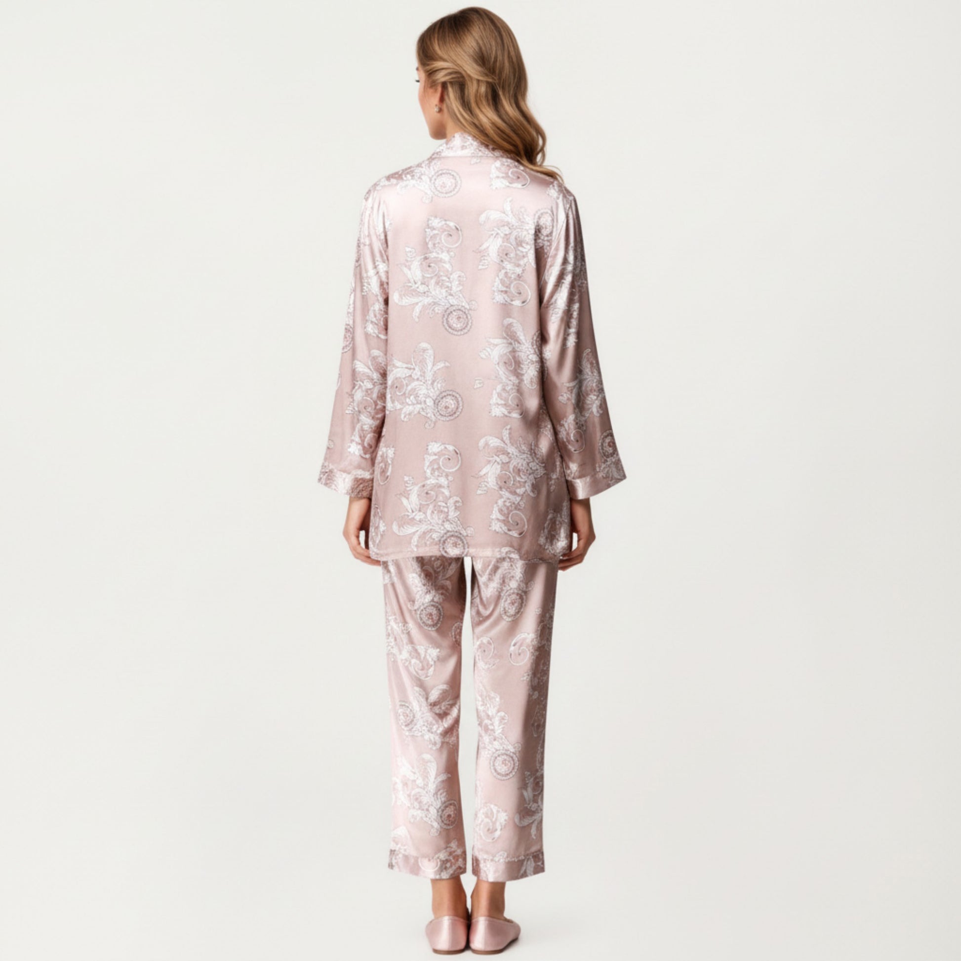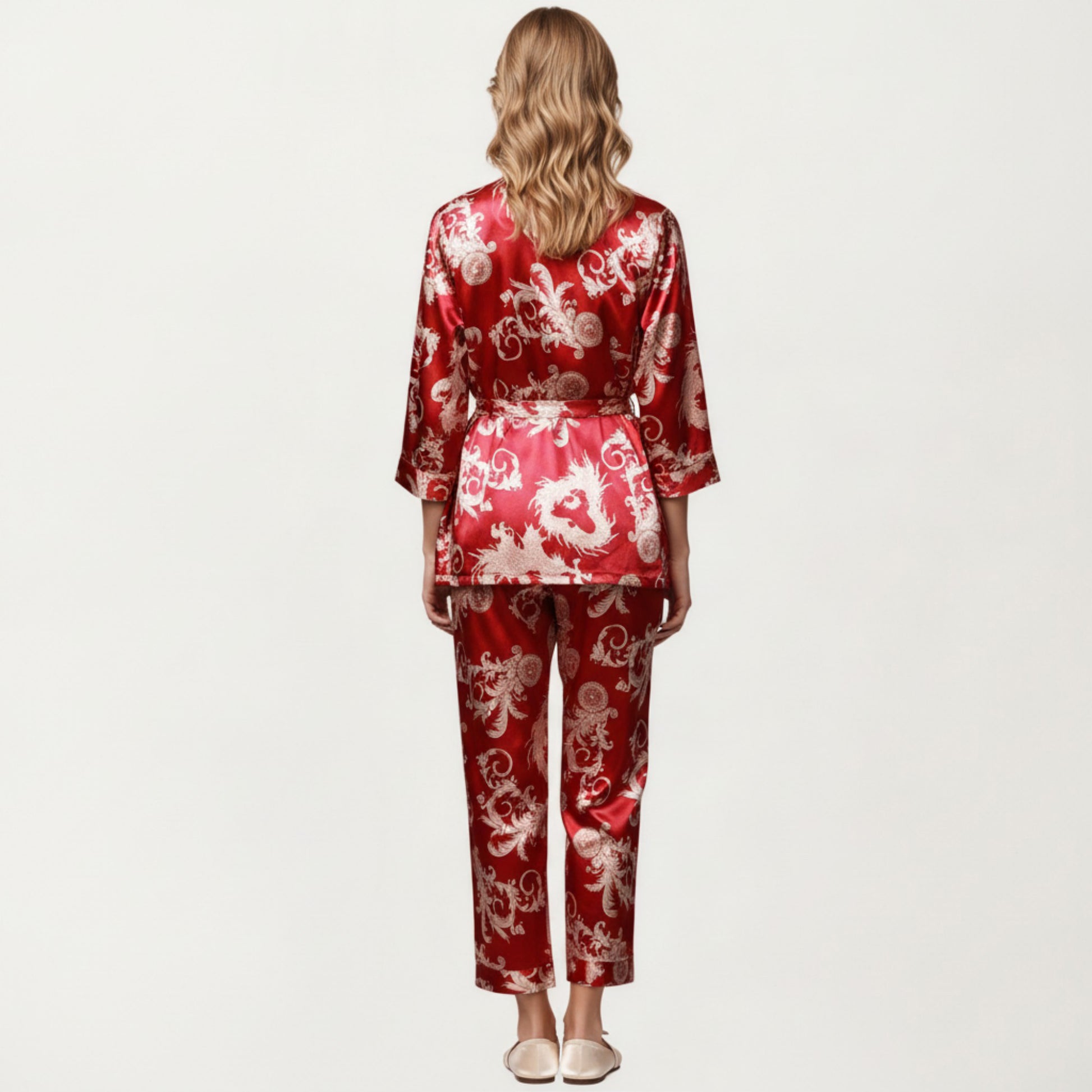 Anna-Kaci Lounge Women's 3-Piece Set Satin Baroque Print Pajama Cami with Matching Robe and Relaxed Straight-Leg Pants
