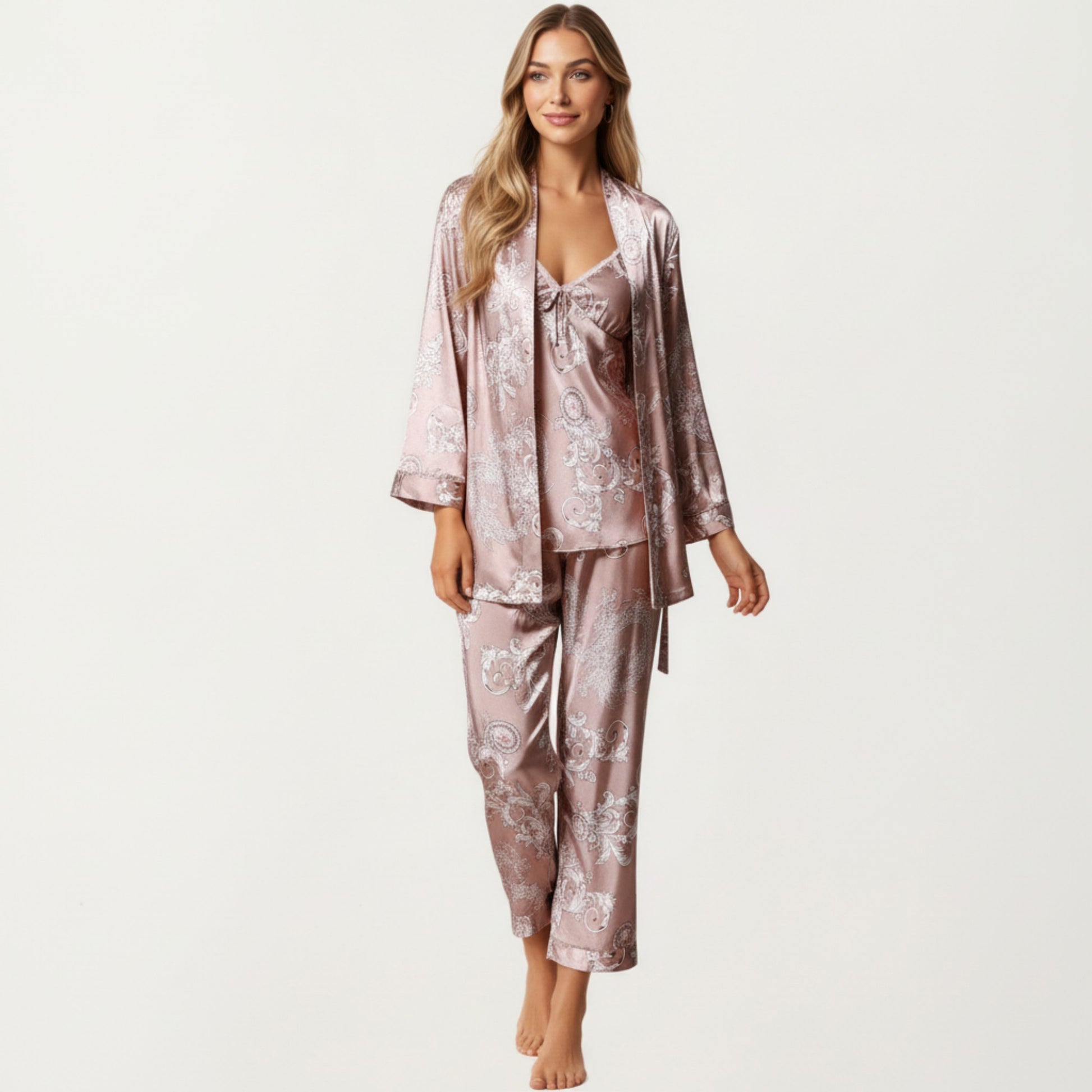 The Anna-Kaci Women's 3-Piece Satin Pajama Set features a smooth, lightweight fabric with a striking baroque-inspired print that adds a sophisticated touch. The soft cami drapes comfortably with adjustable straps, while the relaxed straight-leg pants provide easy movement and a polished satin finish. The matching robe ties at the waist and completes the coordinated look with flowing sleeves and a smooth, elegant texture. This set blends refined detailing with breathable comfort for elevated everyday lounging.