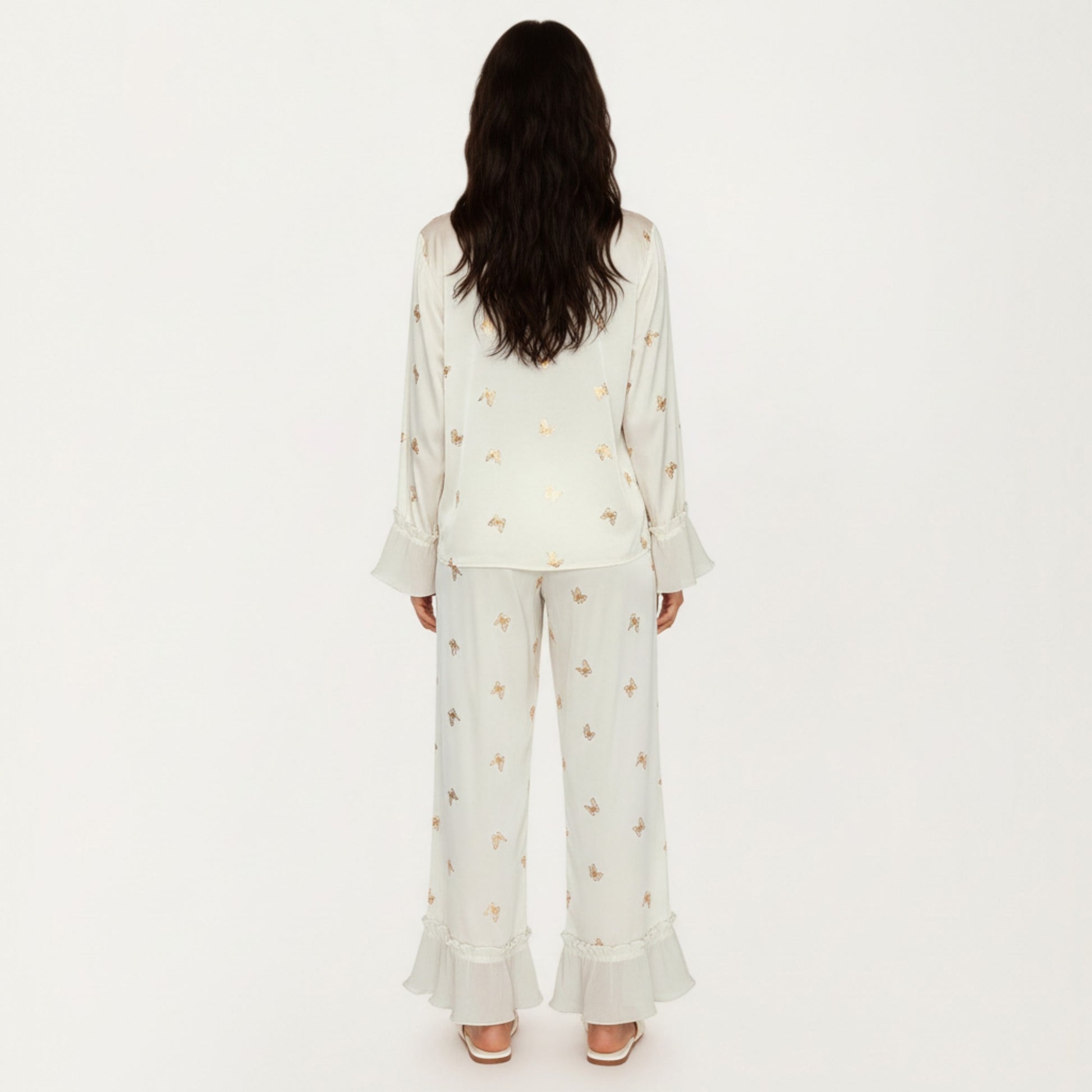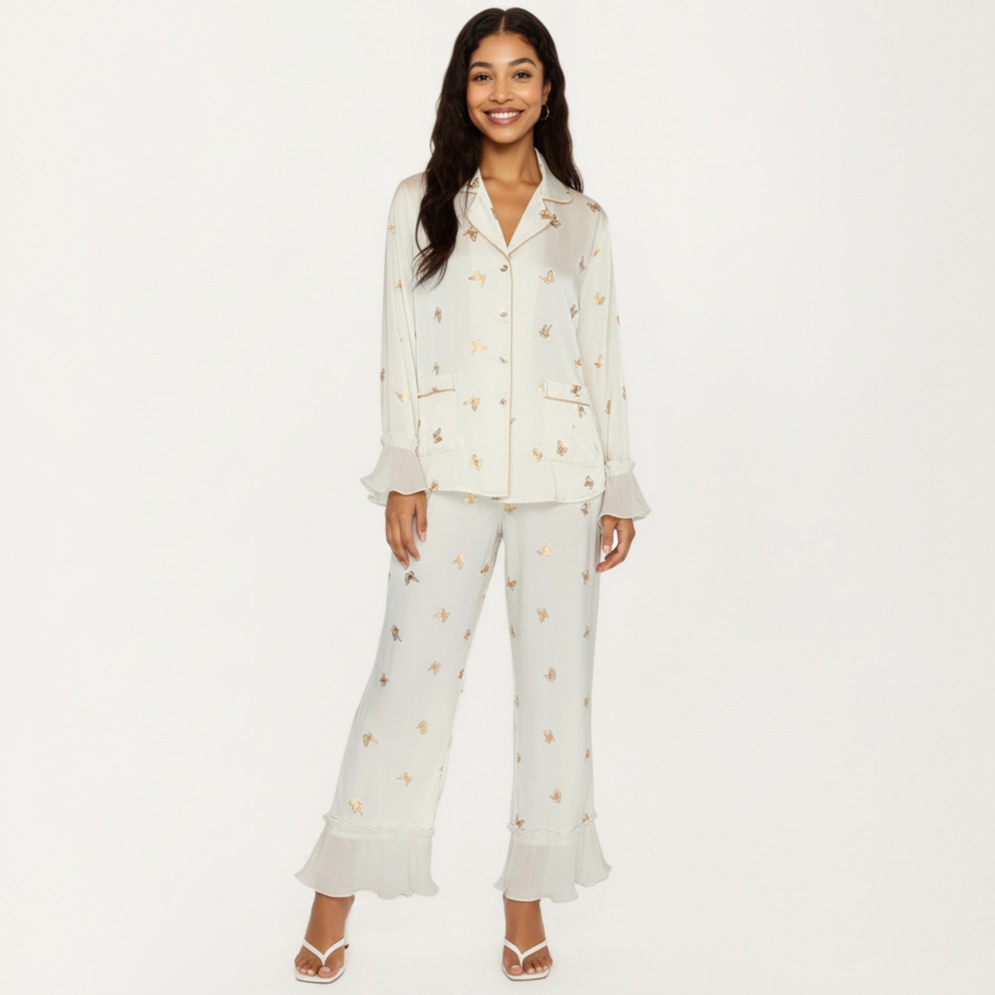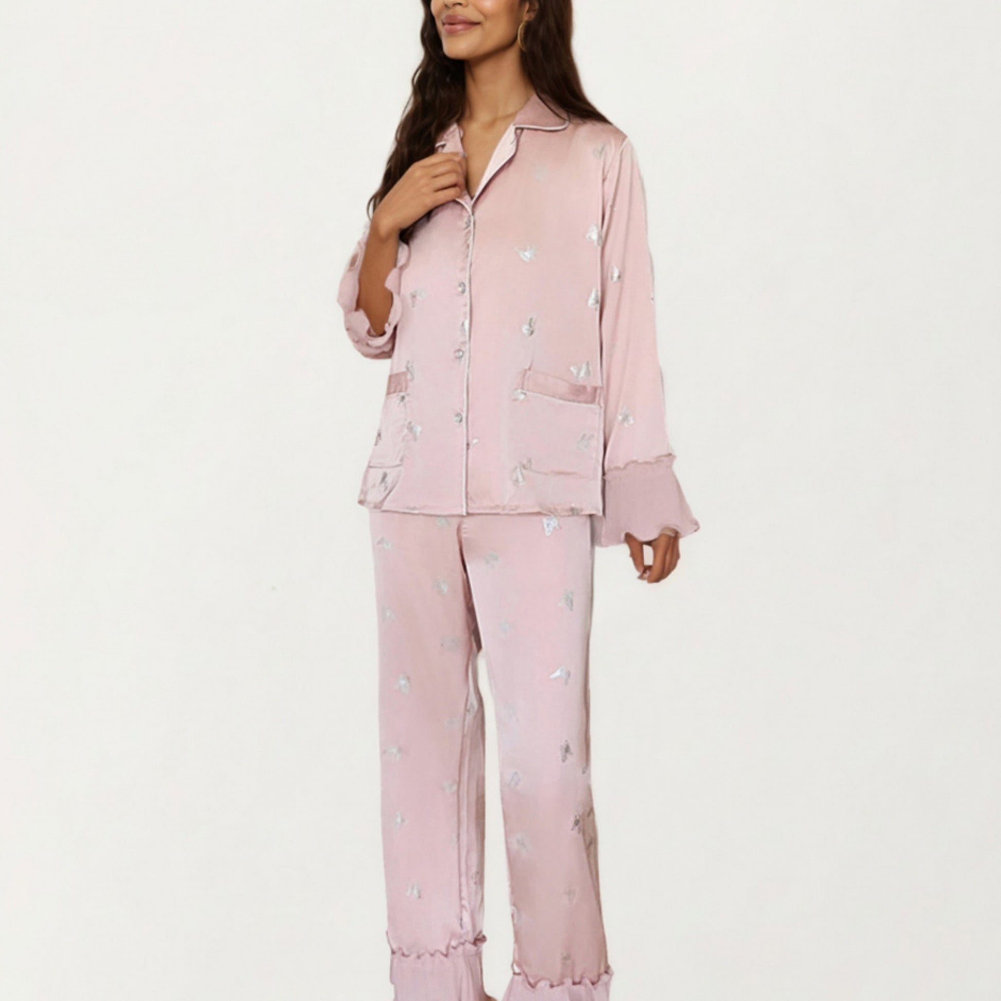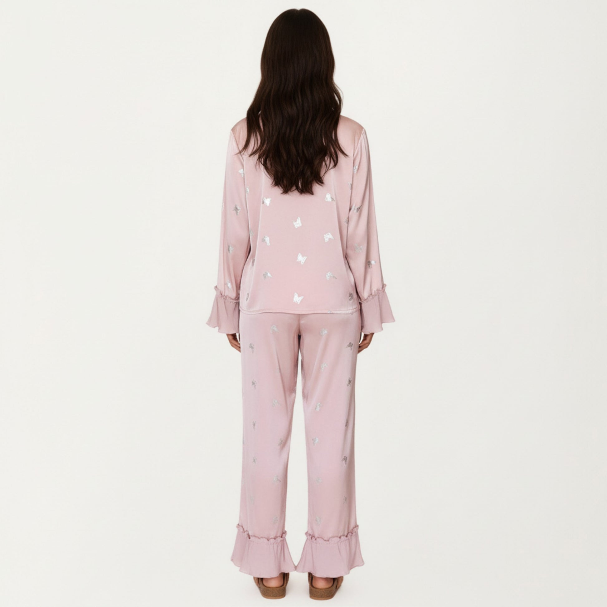The Anna-Kaci Women's 2-Piece Satin Pajama Set features a smooth, lightweight fabric that drapes softly while offering a refined sheen. The button-front top includes contrast piping, functional pockets, and ruffled cuffs that add a feminine touch. The matching pants provide a relaxed, easy fit with coordinated ruffle accents for a cohesive look. This satin set blends delicate detailing with breathable comfort for stylish everyday lounging.
