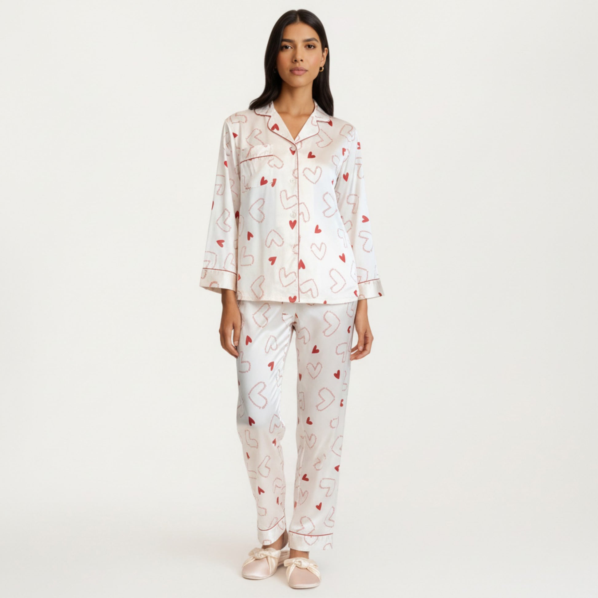Anna-Kaci Lounge Women's 2-Piece Set Heart Print Satin Button Front Pajama Top with Contrast Piping and Matching Relaxed Fit Pants