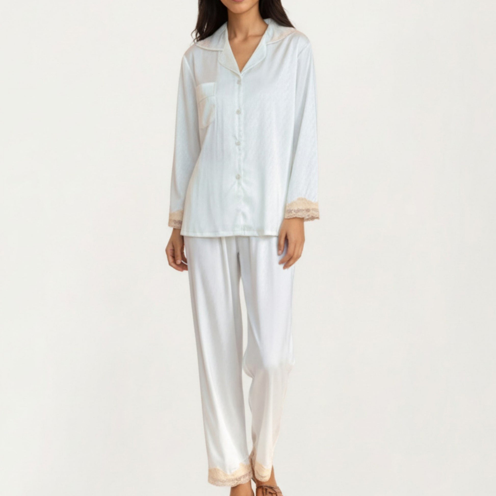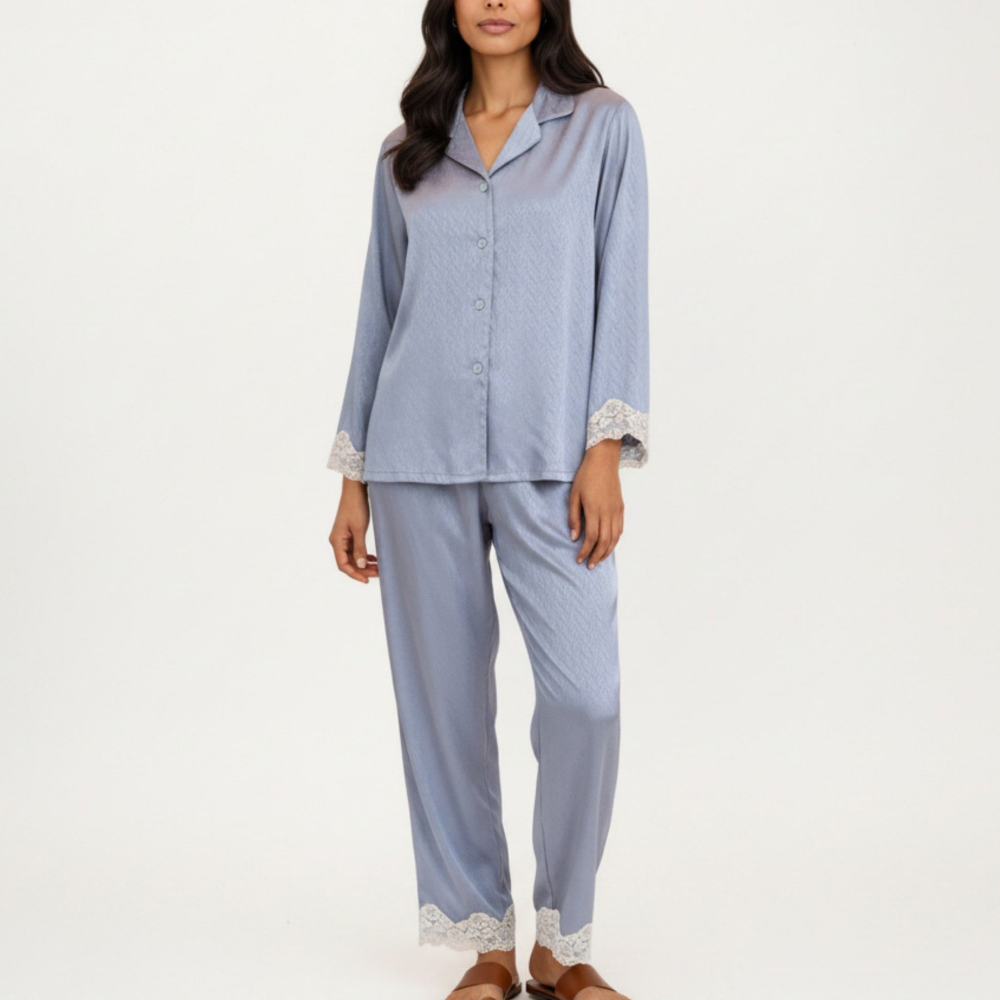 This Anna-Kaci Women's 2-Piece Set features a satin pajama top paired with coordinating relaxed fit pants for a smooth, elegant look. The button-front top includes delicate lace trim at the cuffs, adding a refined feminine touch to the set's sleek finish. The lightweight satin fabric drapes beautifully, offering breathable comfort with a soft sheen. Matching pants complete the cohesive design, making the set feel polished and effortless.