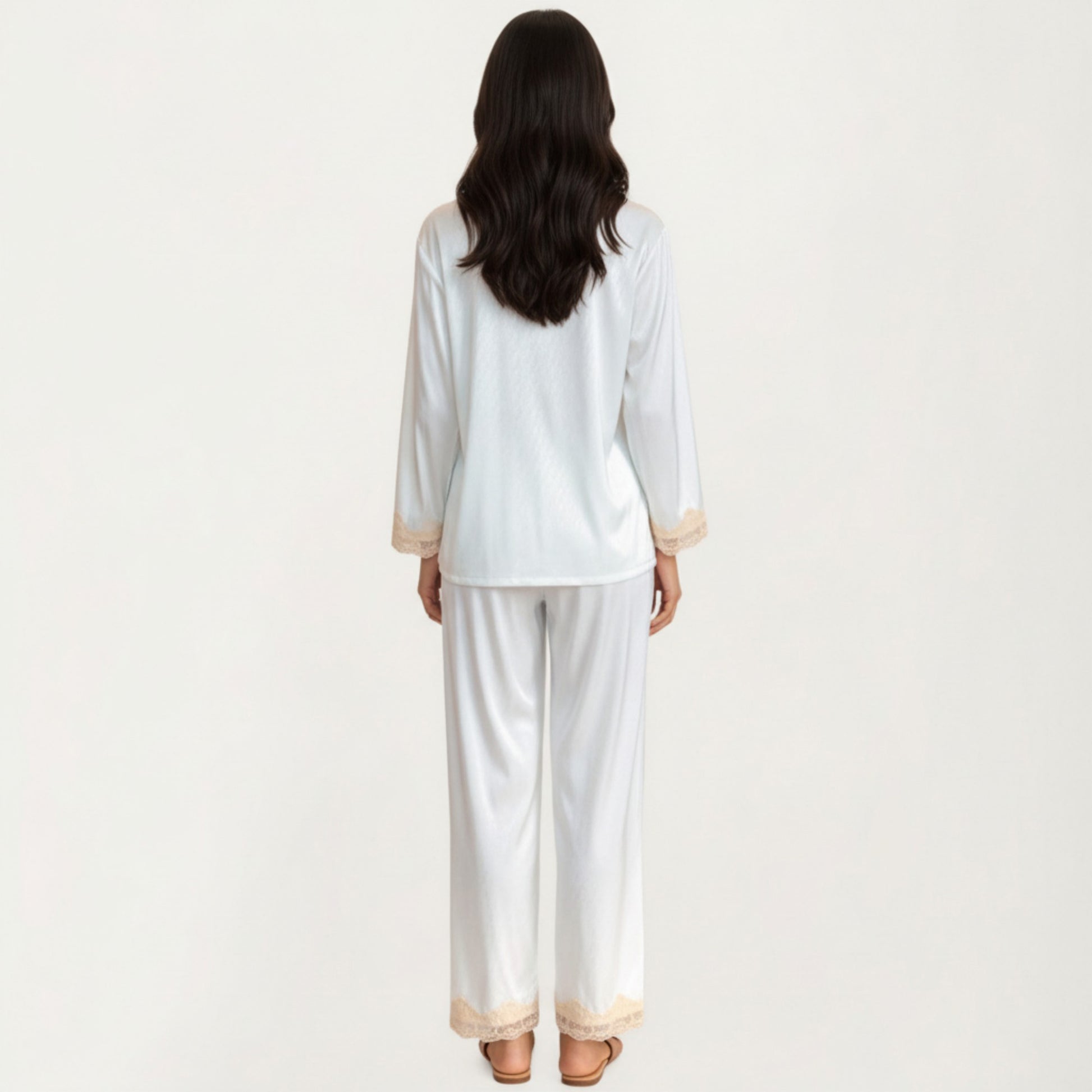 Anna-Kaci Lounge Women's 2-Piece Set Satin Button Front Pajama Top with Lace Trim Sleeves and Matching Elastic Waist Pants