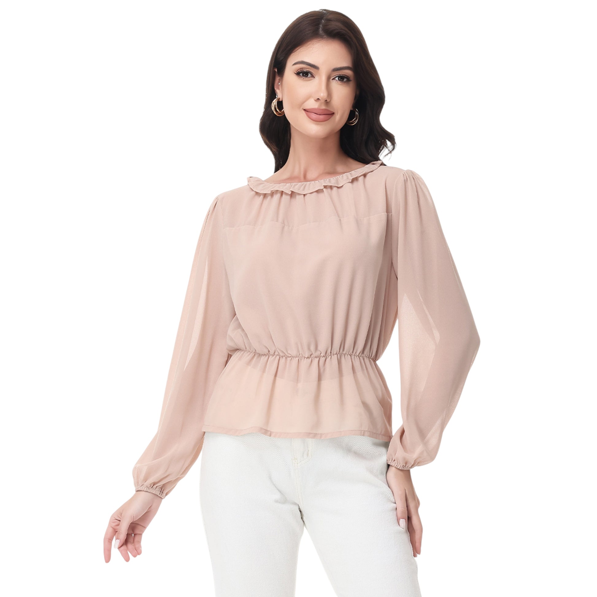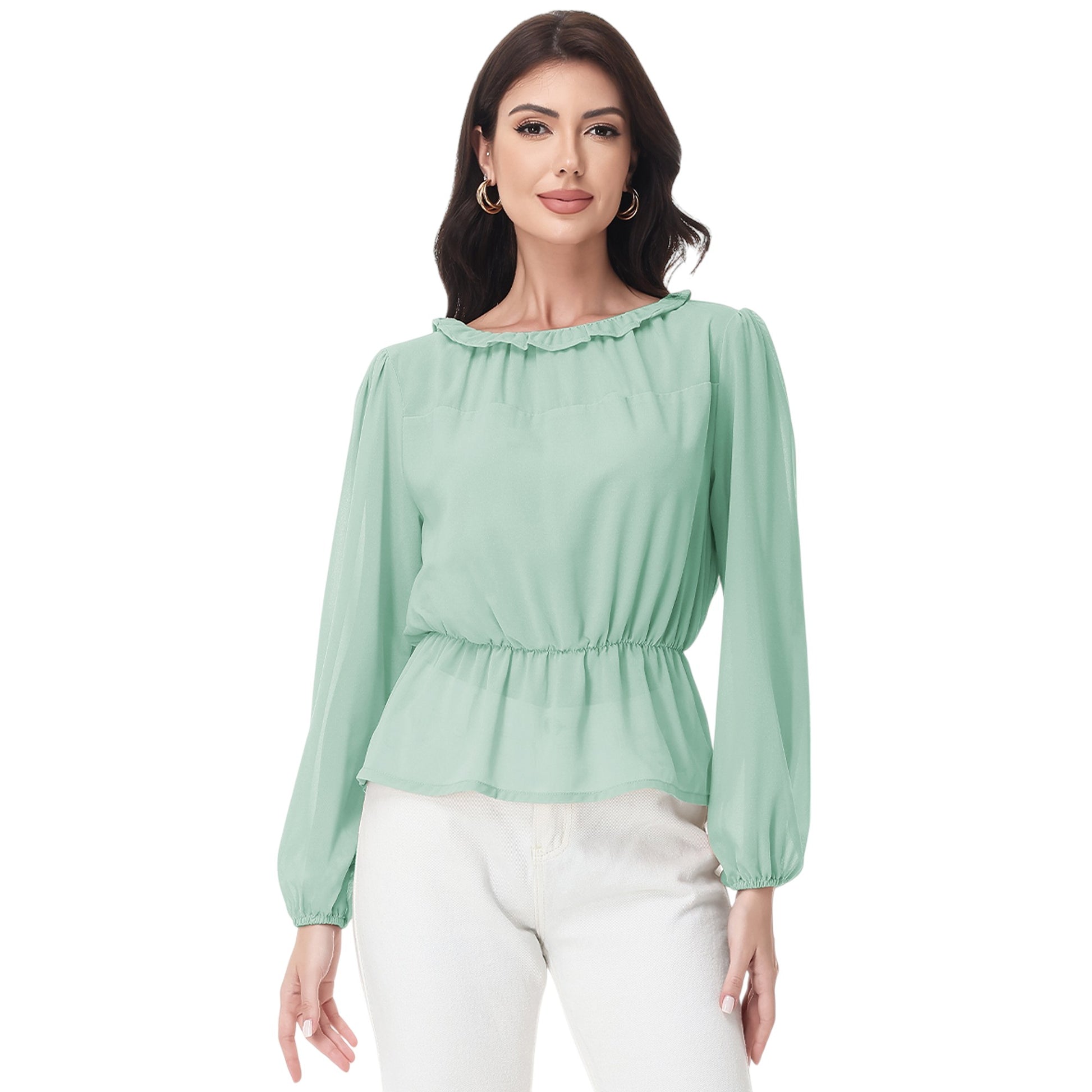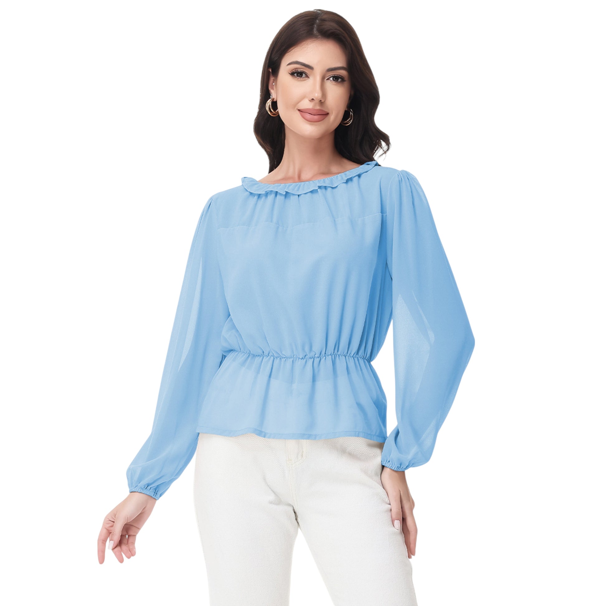 This women's blouse showcases timeless elegance with a delicate ruffle neckline and soft gathered detailing. The long sleeves feature elasticized cuffs, complementing the cinched waist that creates a flattering peplum effect. Made from lightweight, semi-sheer fabric, it drapes beautifully and adds a romantic touch to your wardrobe. Easy to style with jeans or dress pants, it¡¯s a versatile piece for elevating everyday outfits.