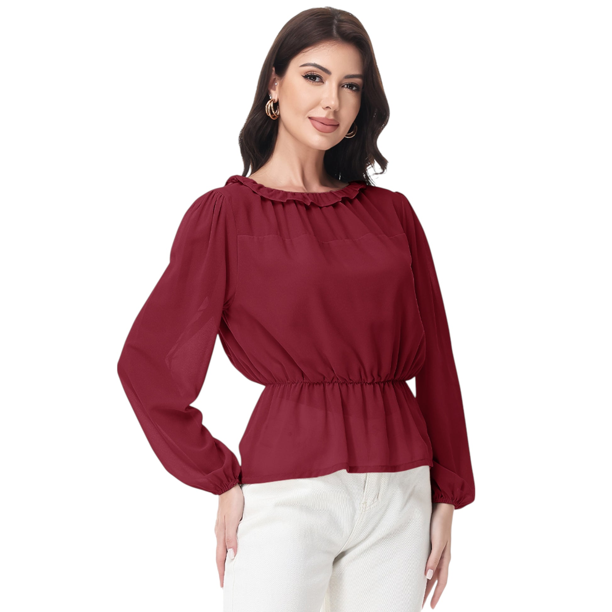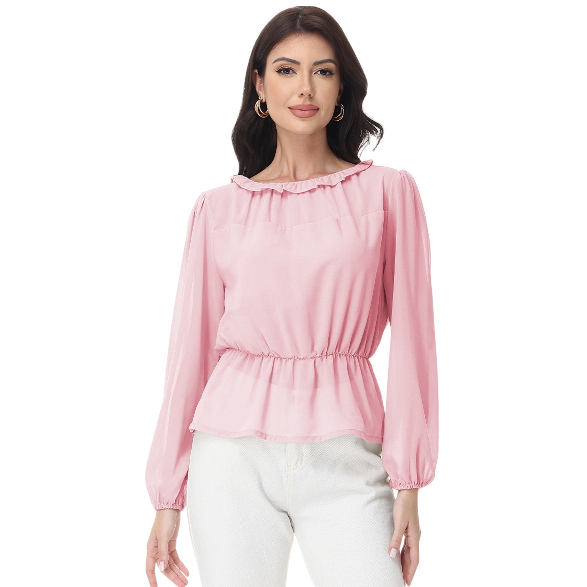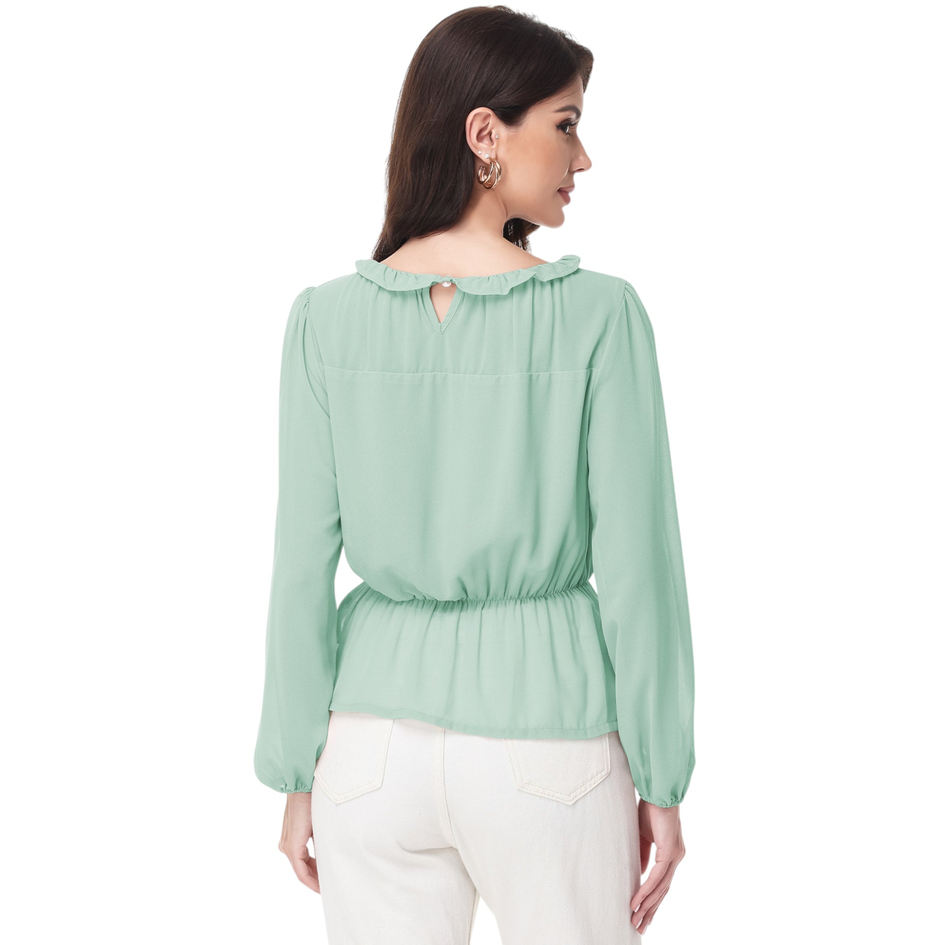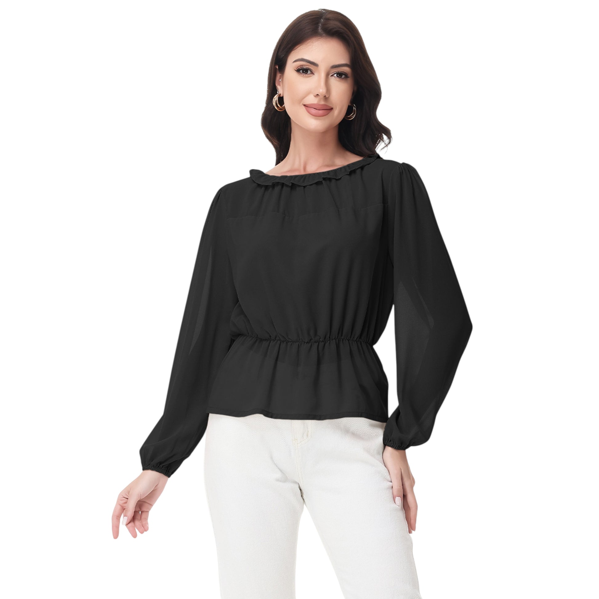 This women's blouse showcases timeless elegance with a delicate ruffle neckline and soft gathered detailing. The long sleeves feature elasticized cuffs, complementing the cinched waist that creates a flattering peplum effect. Made from lightweight, semi-sheer fabric, it drapes beautifully and adds a romantic touch to your wardrobe. Easy to style with jeans or dress pants, it¡¯s a versatile piece for elevating everyday outfits.