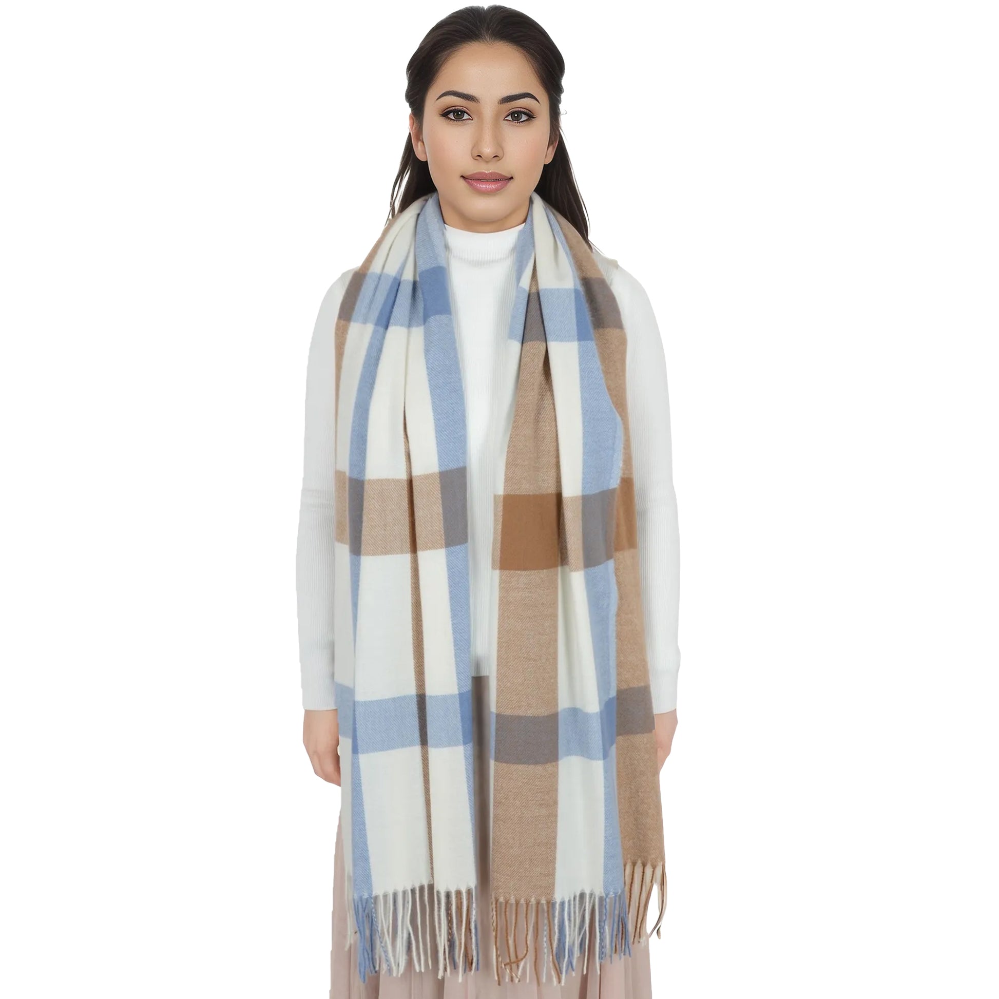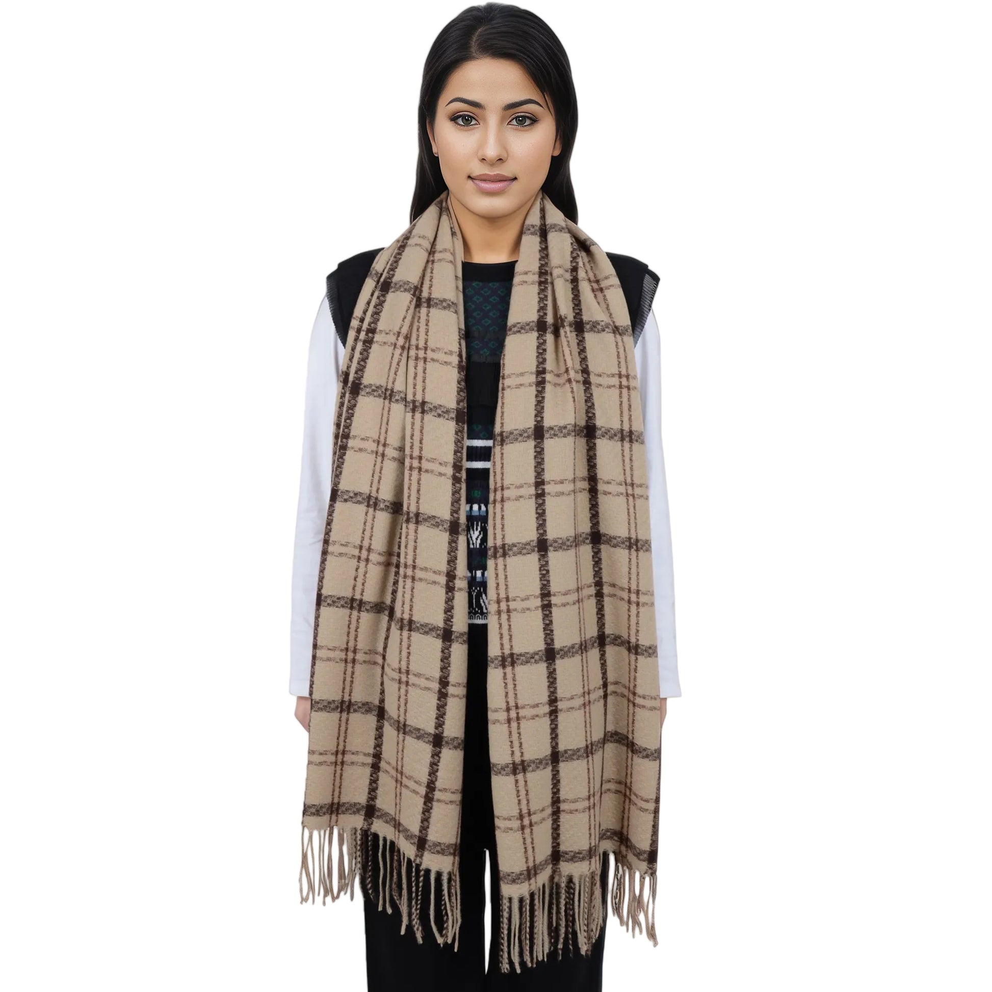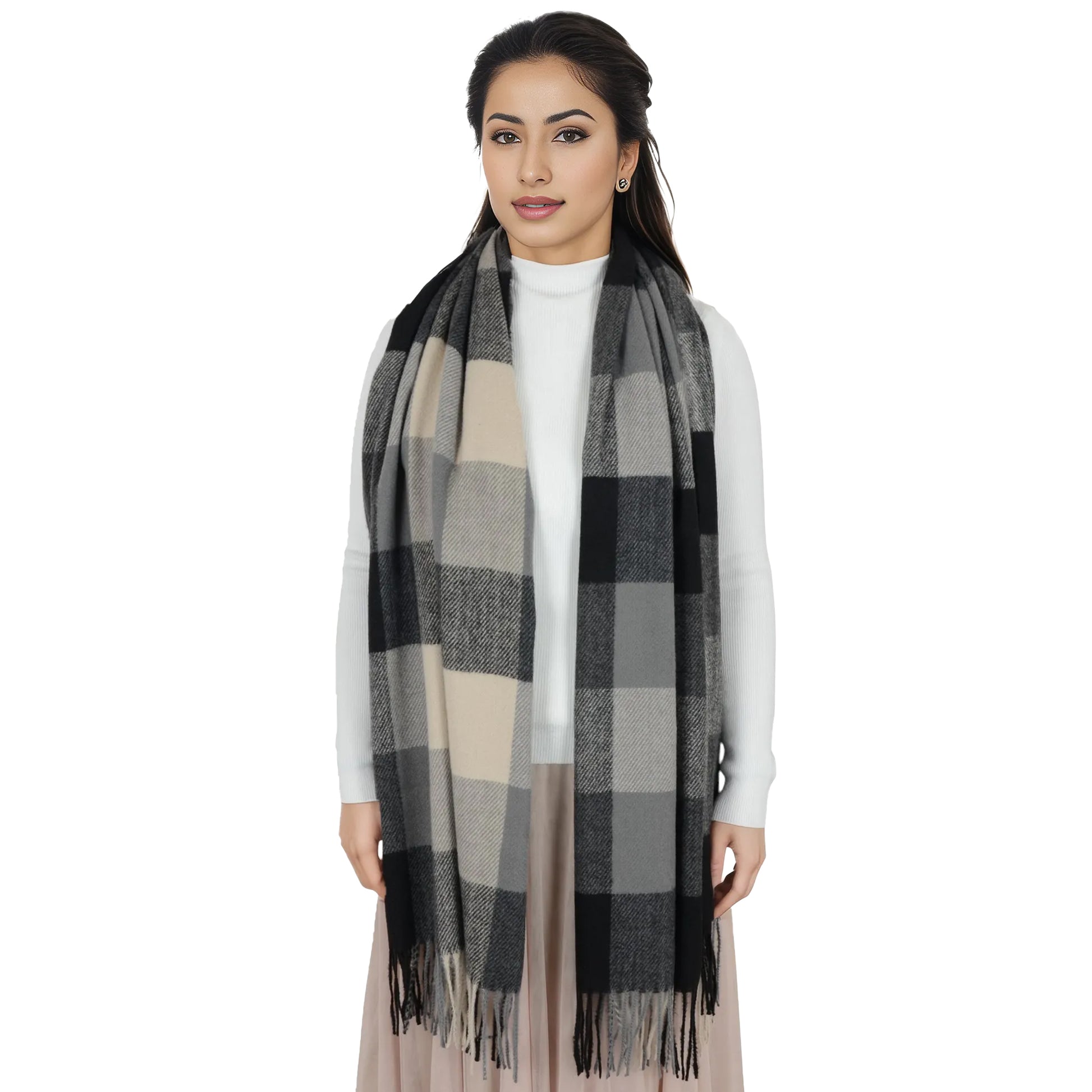 Embrace warmth and style with the classic plaid winter scarf. Crafted to deliver a luxurious cashmere-like feel, this scarf is the ultimate accessory for keeping cozy in colder months. Featuring a timeless plaid pattern, the soft fabric offers both comfort and sophistication, making it great for casual and dressy occasions alike. Whether you're wearing it as a cozy wrap, a stylish shawl, or a chic neck scarf, this scarf adds instant flair to any outfit. The classic checkered design is complemented by tassel detailing on each end, offering a touch of playful texture while maintaining a refined, elegant look. Measuring a generous size, this scarf provides ample coverage and can be worn in a variety of ways. Ideal for women who want a versatile stay warm in winter or to add an extra layer of style to their wardrobe, this scarf is an essential winter piece.