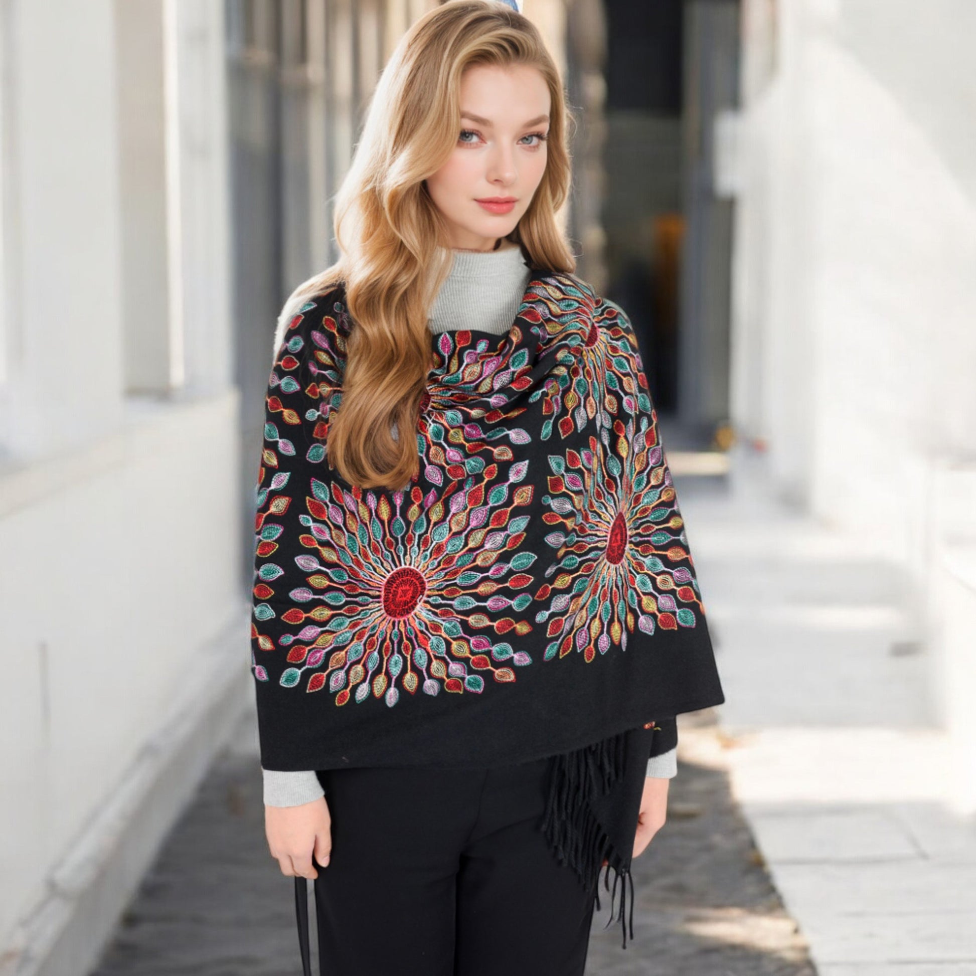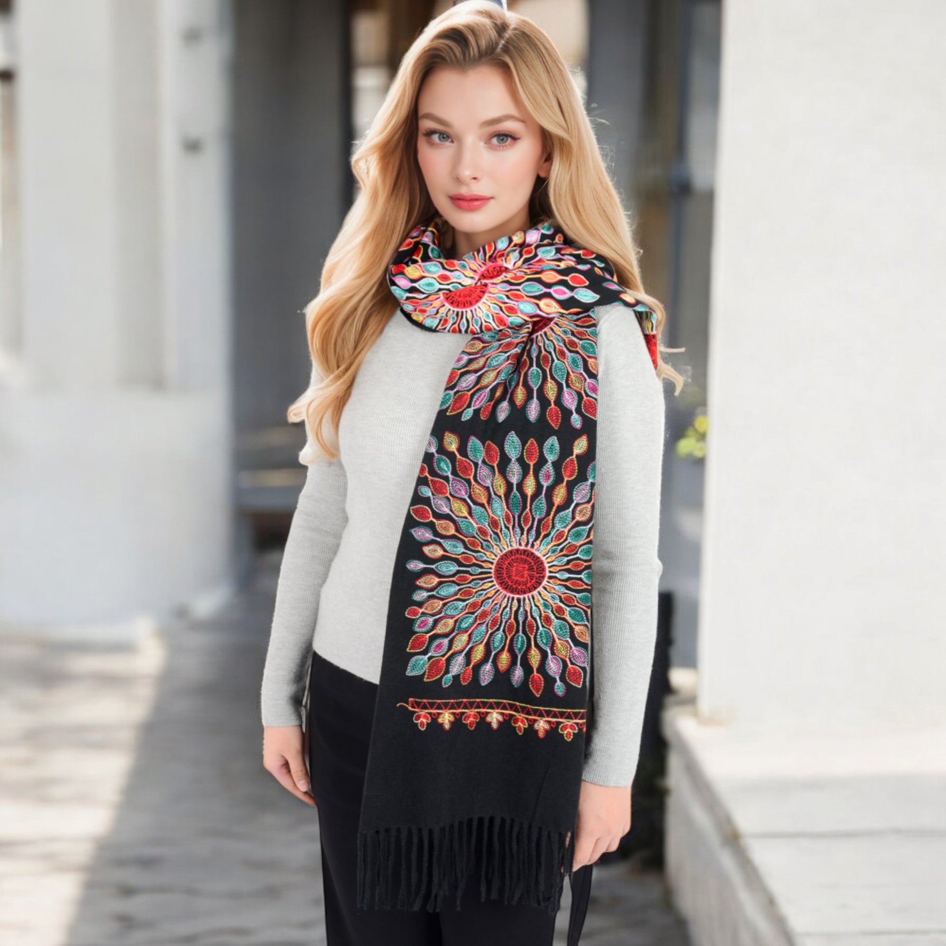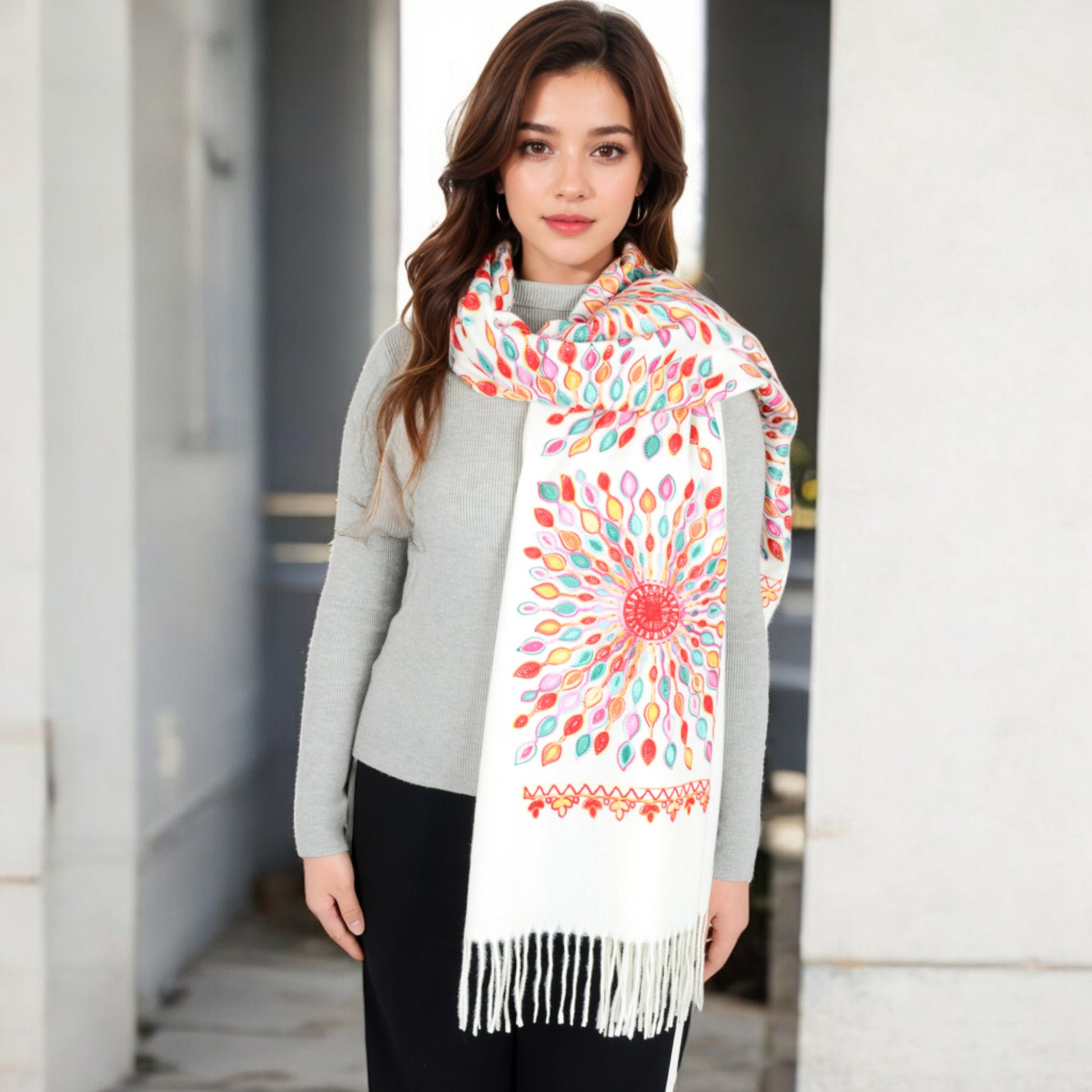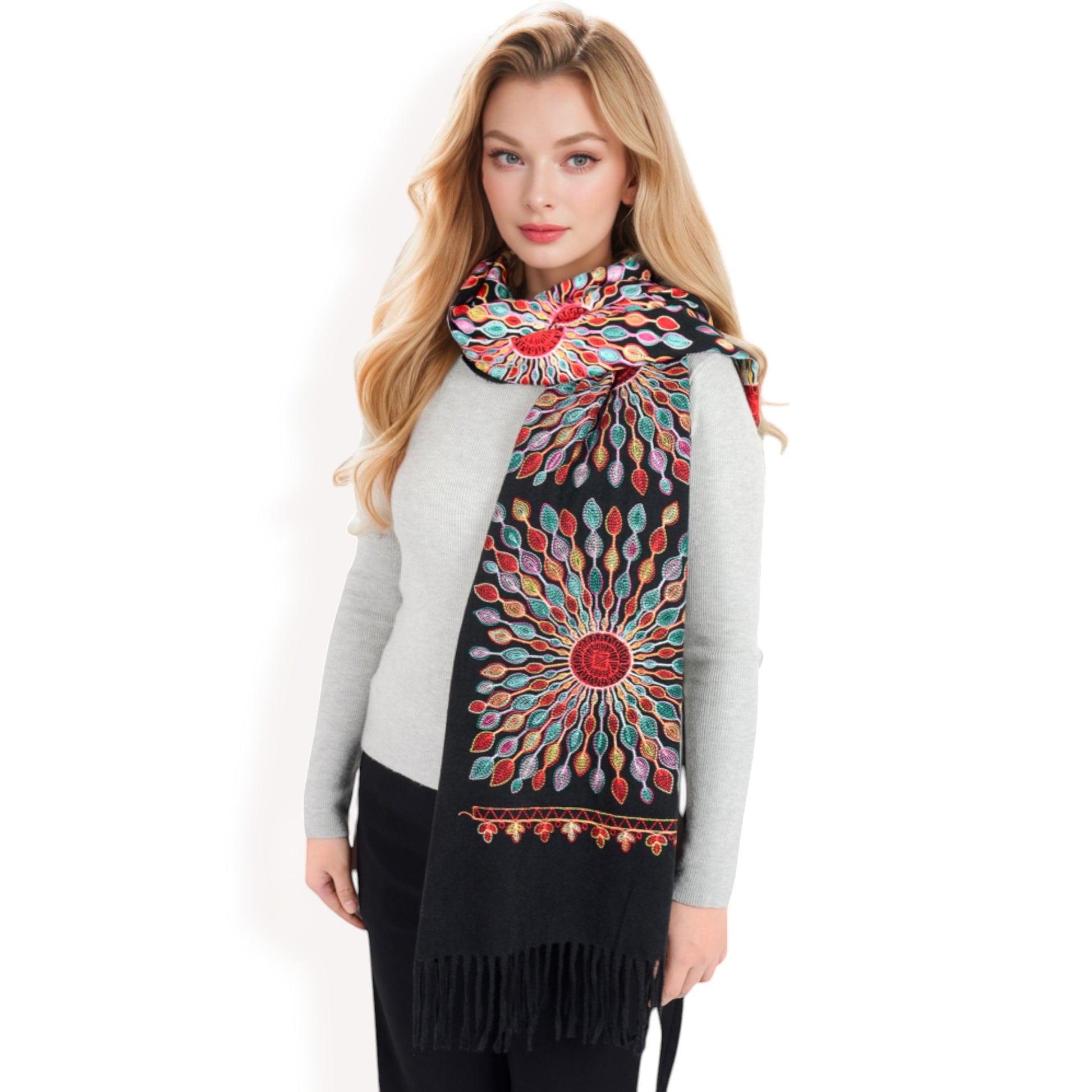 Anna-Kaci Women's Floral Mandala Embroidered Scarf with Fringed Edges and Lightweight Fabric