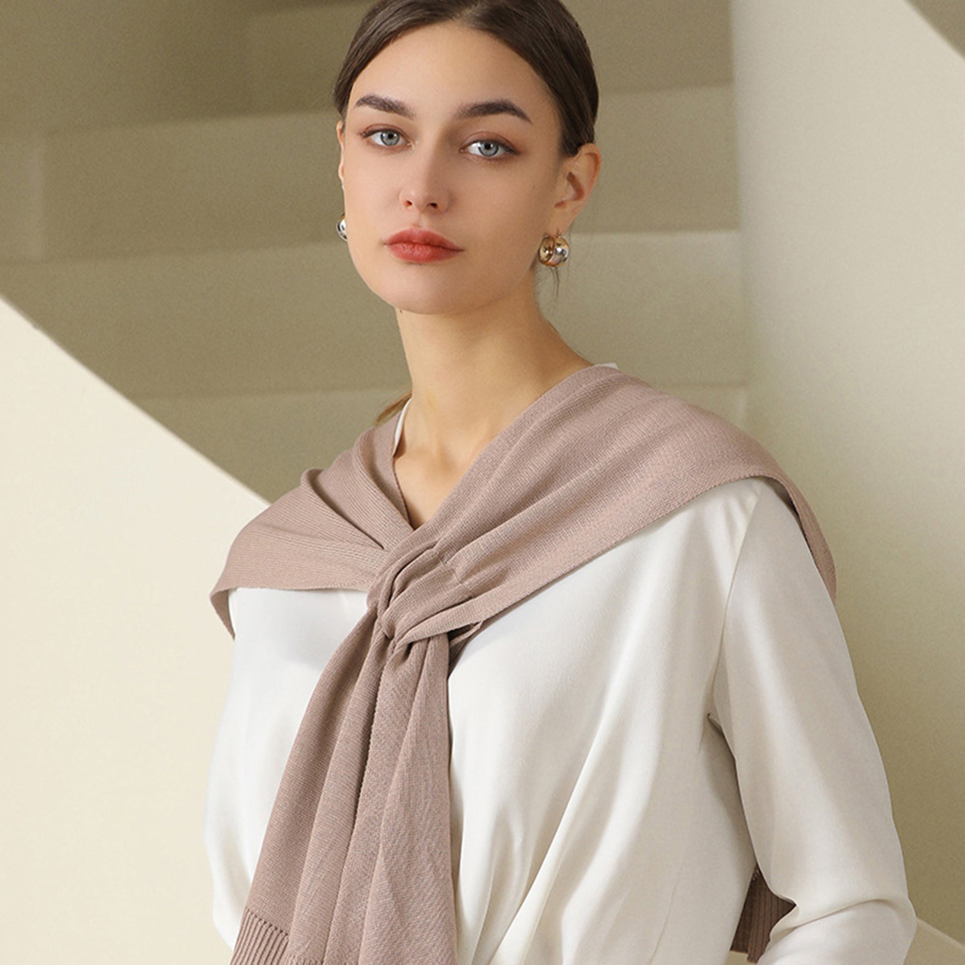 The Anna-Kaci Women's Lightweight Knit Scarf Wrap is a versatile accessory that blends comfort with modern elegance. Made from soft, breathable knit fabric, this wrap is designed to drape effortlessly and provide light coverage. Its tie-front design adds a stylish detail while allowing for customizable wear, whether layered over dresses, tops, or outerwear. Perfect for year-round use, this piece works as both a fashion scarf and a cozy layering shawl.