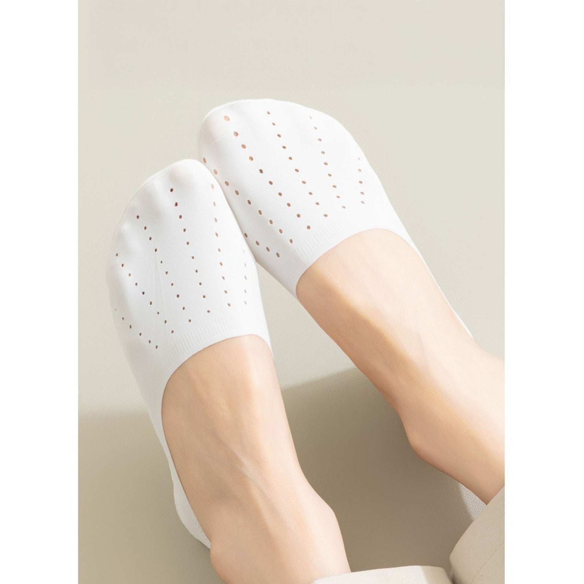 Stay comfortable and discreet with this 5-pair set of women¡¯s no show socks designed for a secure fit inside loafers, flats, and low-cut shoes. Made with breathable stretch knit fabric, these liner socks feature ventilated holes for airflow and a silicone heel grip to stay in place all day. The low-profile design ensures they stay hidden while providing soft cushioning and reliable coverage. With multiple soft-toned color options, this set offers both practicality and everyday comfort.
