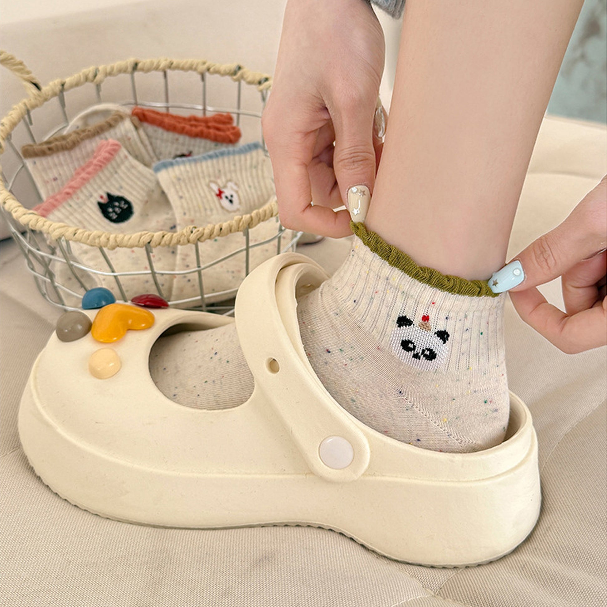 Add a touch of playful charm to your sock collection with our Women's Cute Bear Embroidered Speckled Ankle Socks. These socks feature an adorable bear with a red bow embroidered on the cuff, creating a sweet and whimsical look. The speckled design, with colorful dots scattered across the fabric, adds an extra dose of fun.