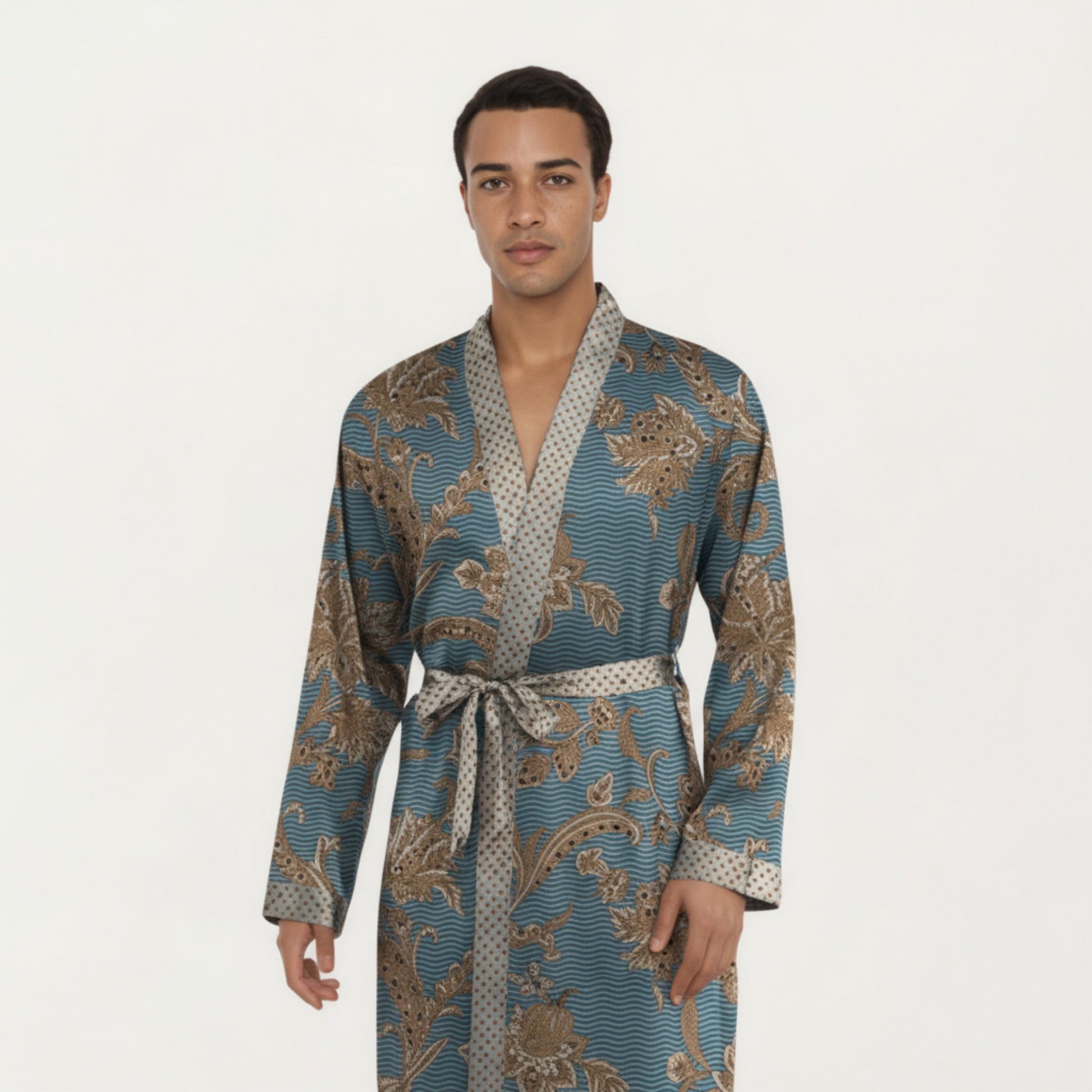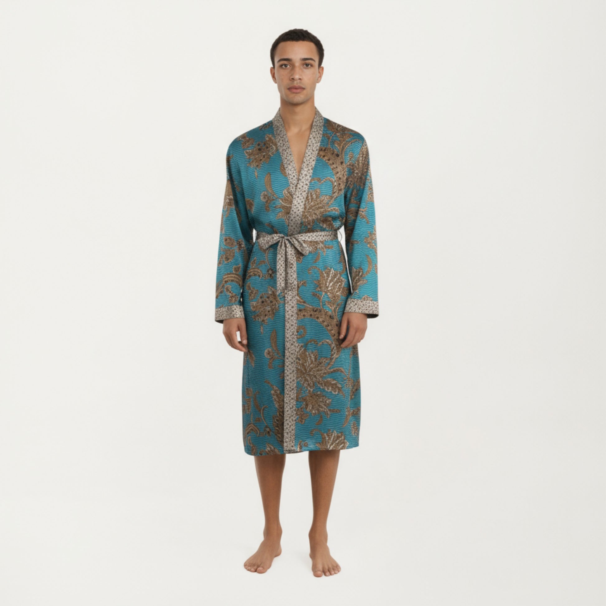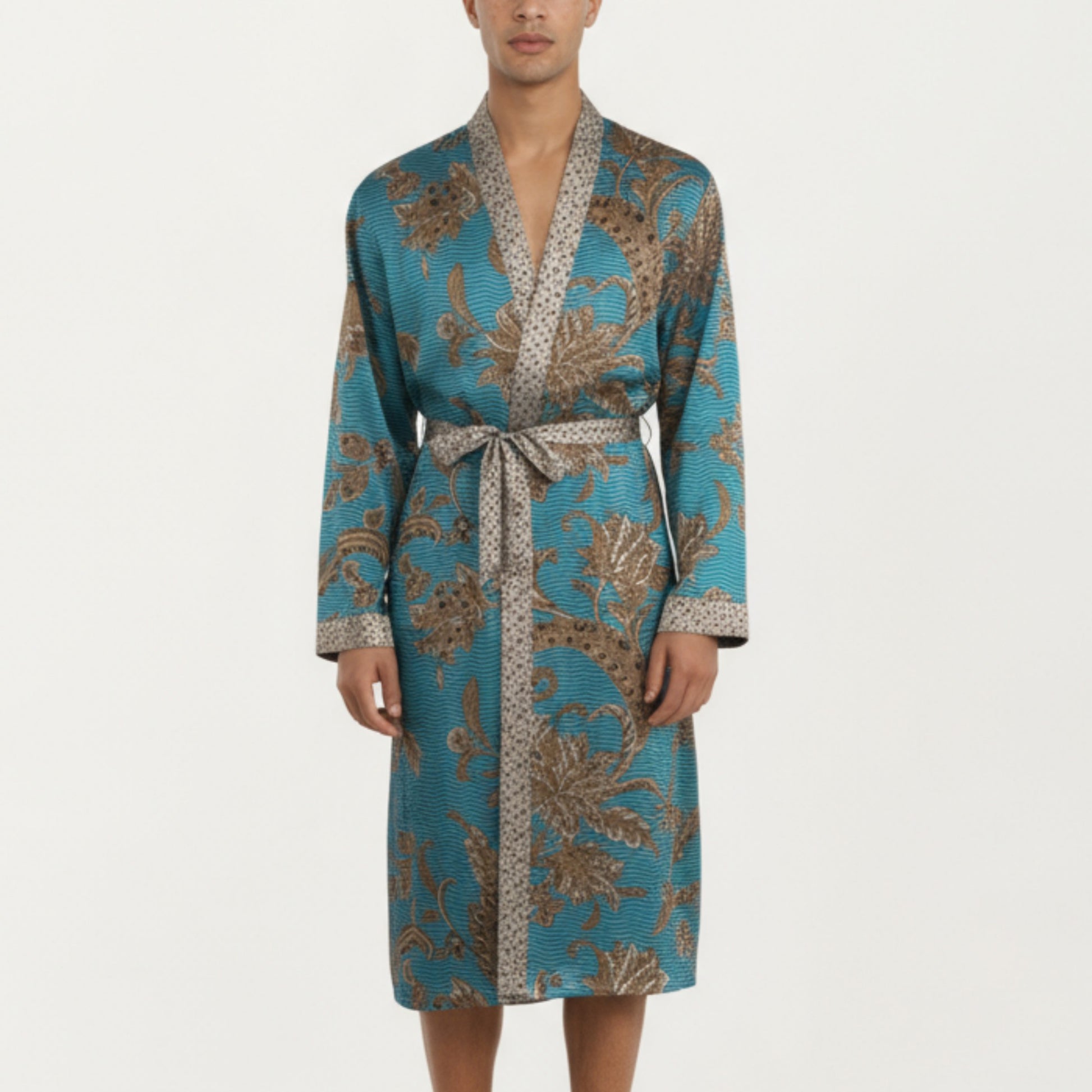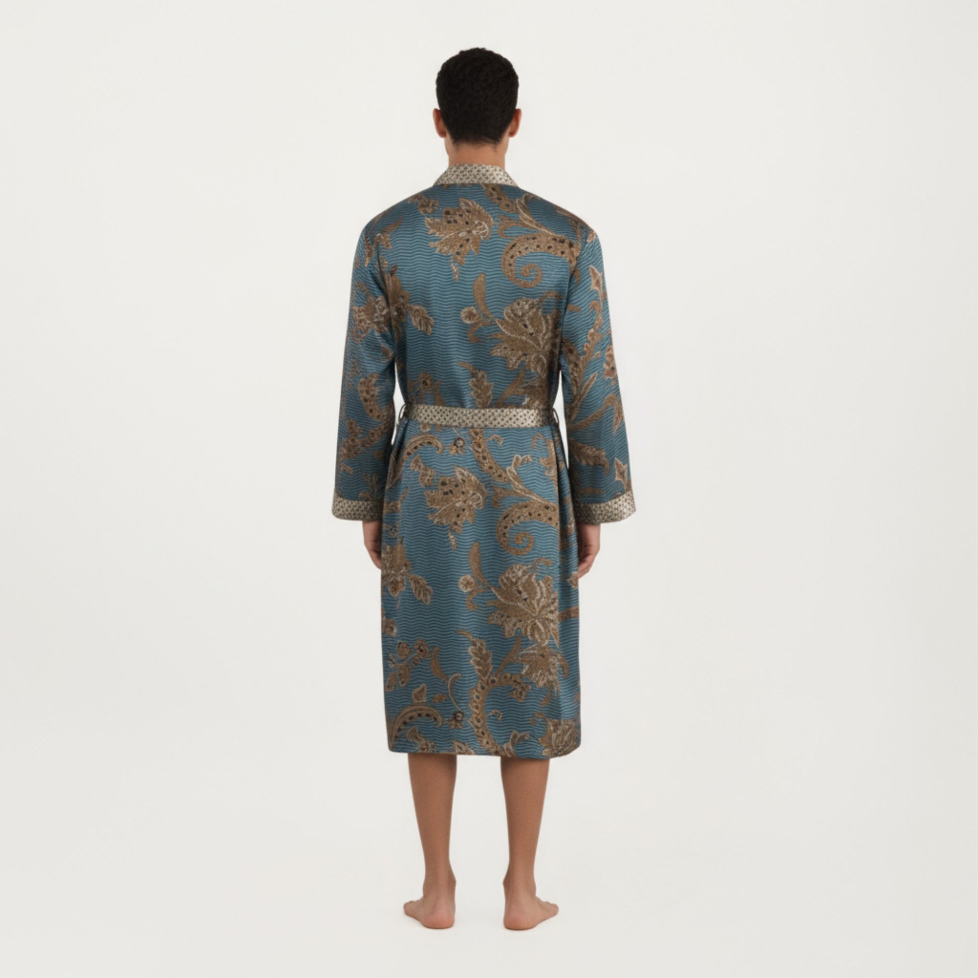The Anna-Kaci Men's Satin Robe brings a touch of sophistication with its elegant floral baroque pattern and contrasting trim details. Made from smooth satin fabric, it offers a lightweight and silky texture that feels luxurious against the skin. The robe features a self-tie belt for a personalized fit and a classic shawl collar that enhances its refined appeal. Perfectly combining comfort and timeless style, this robe is ideal for those who appreciate elevated loungewear.