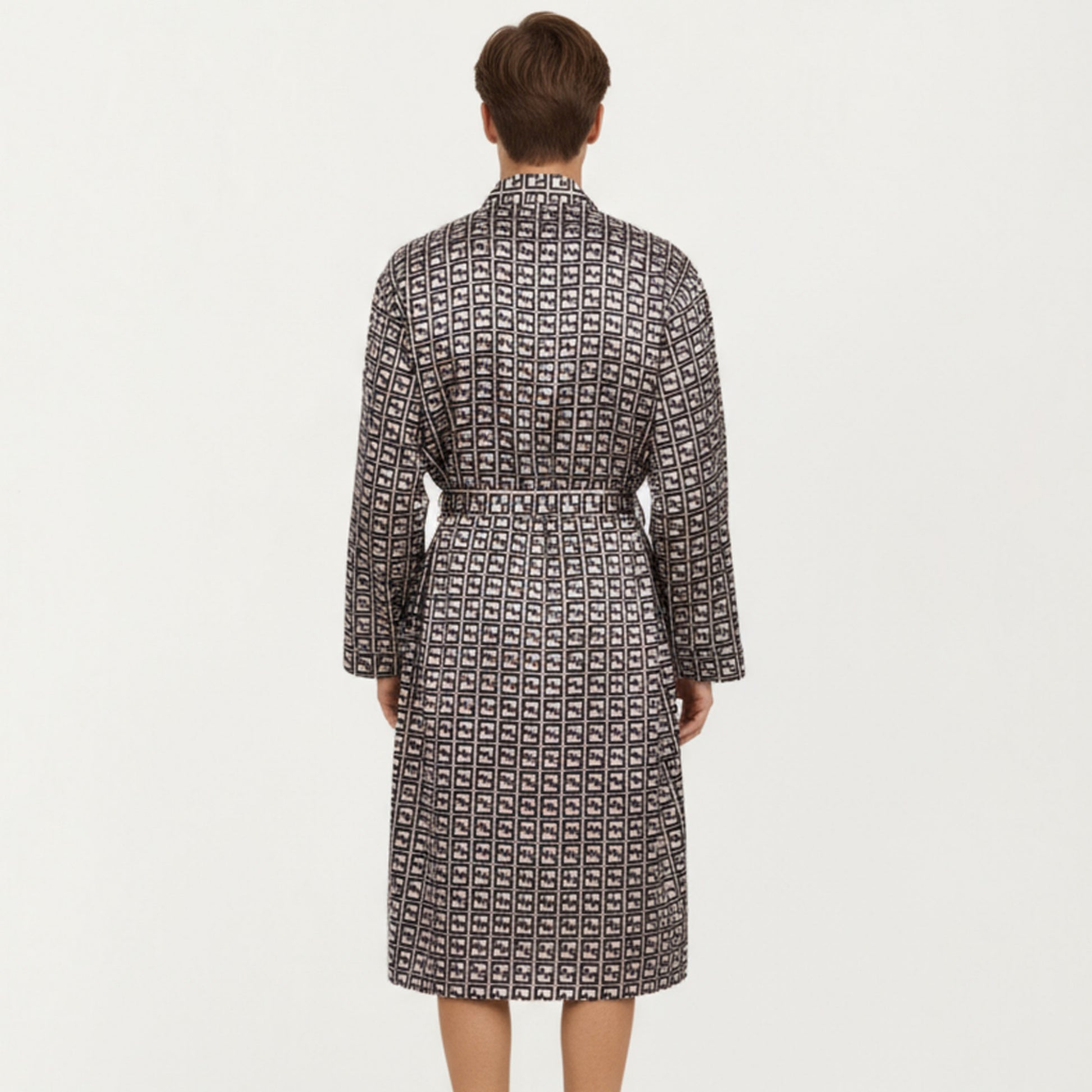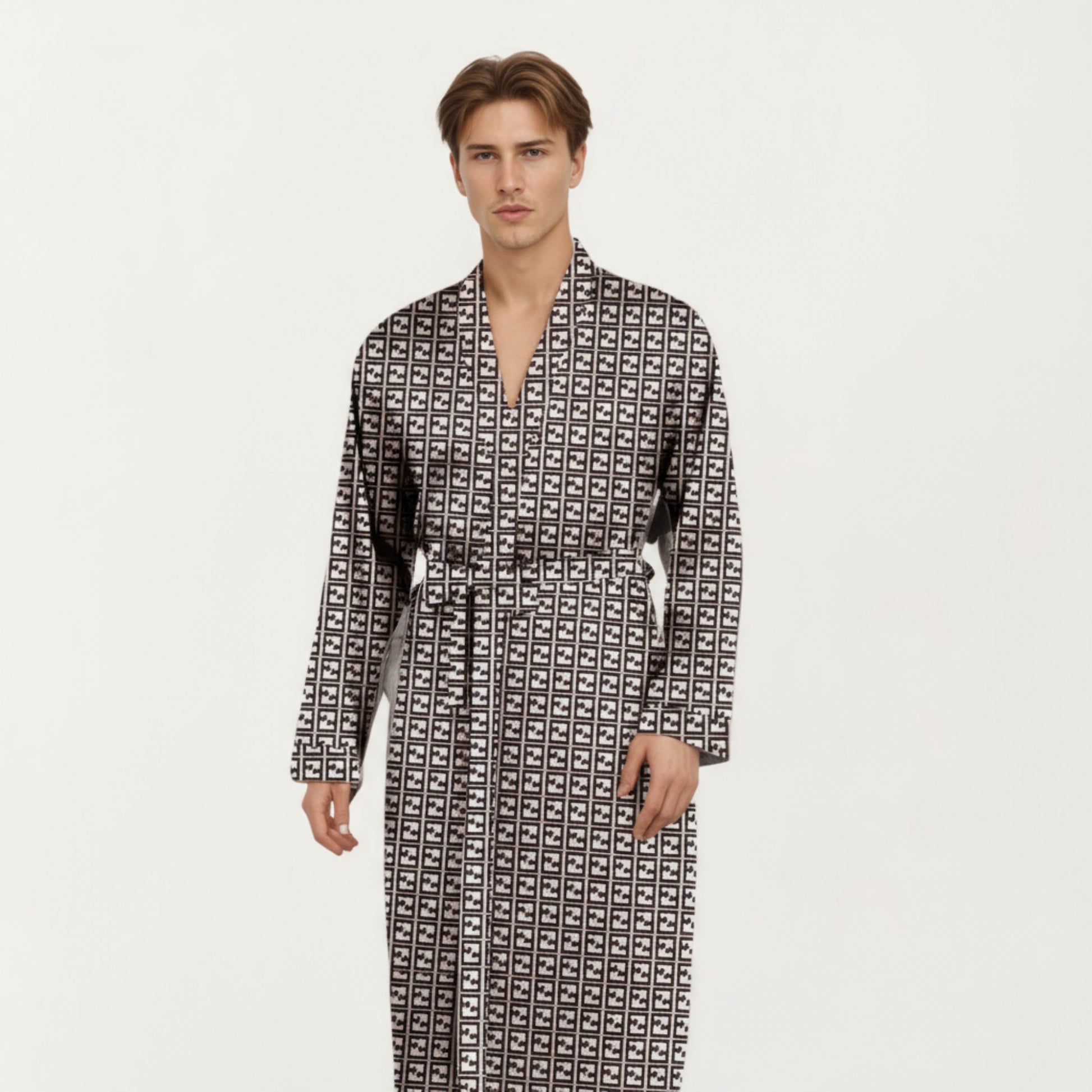 The Anna-Kaci Men's Satin Robe combines sleek sophistication with a refined geometric square pattern. Crafted from smooth satin fabric, this robe offers a luxurious feel with a lightweight, glossy finish. It features an adjustable waist tie for a secure, personalized fit and two front patch pockets for functional convenience. Designed with a modern yet timeless aesthetic, this robe is perfect for those who appreciate comfort with a touch of elegance.