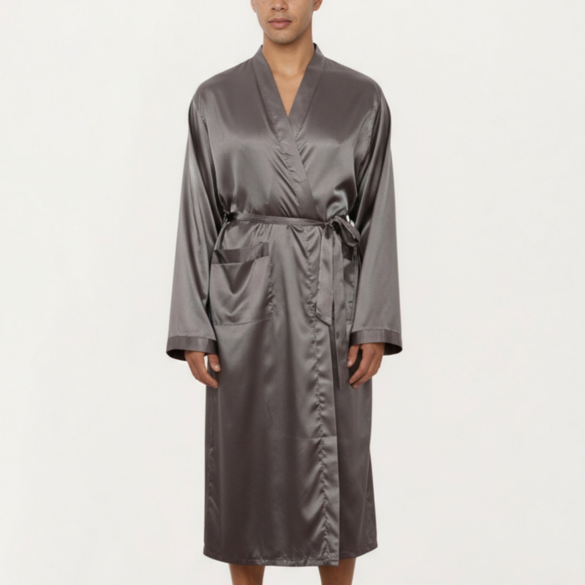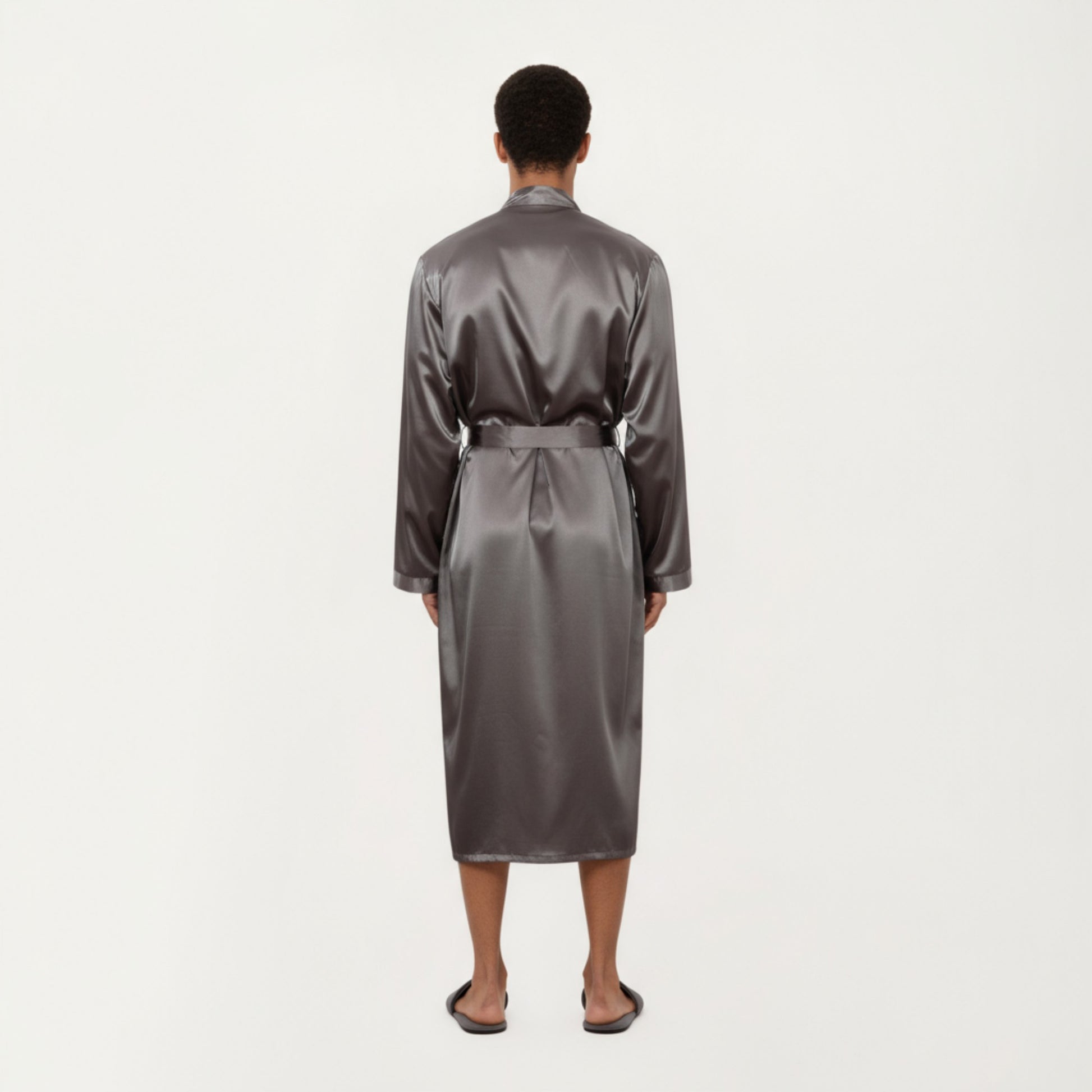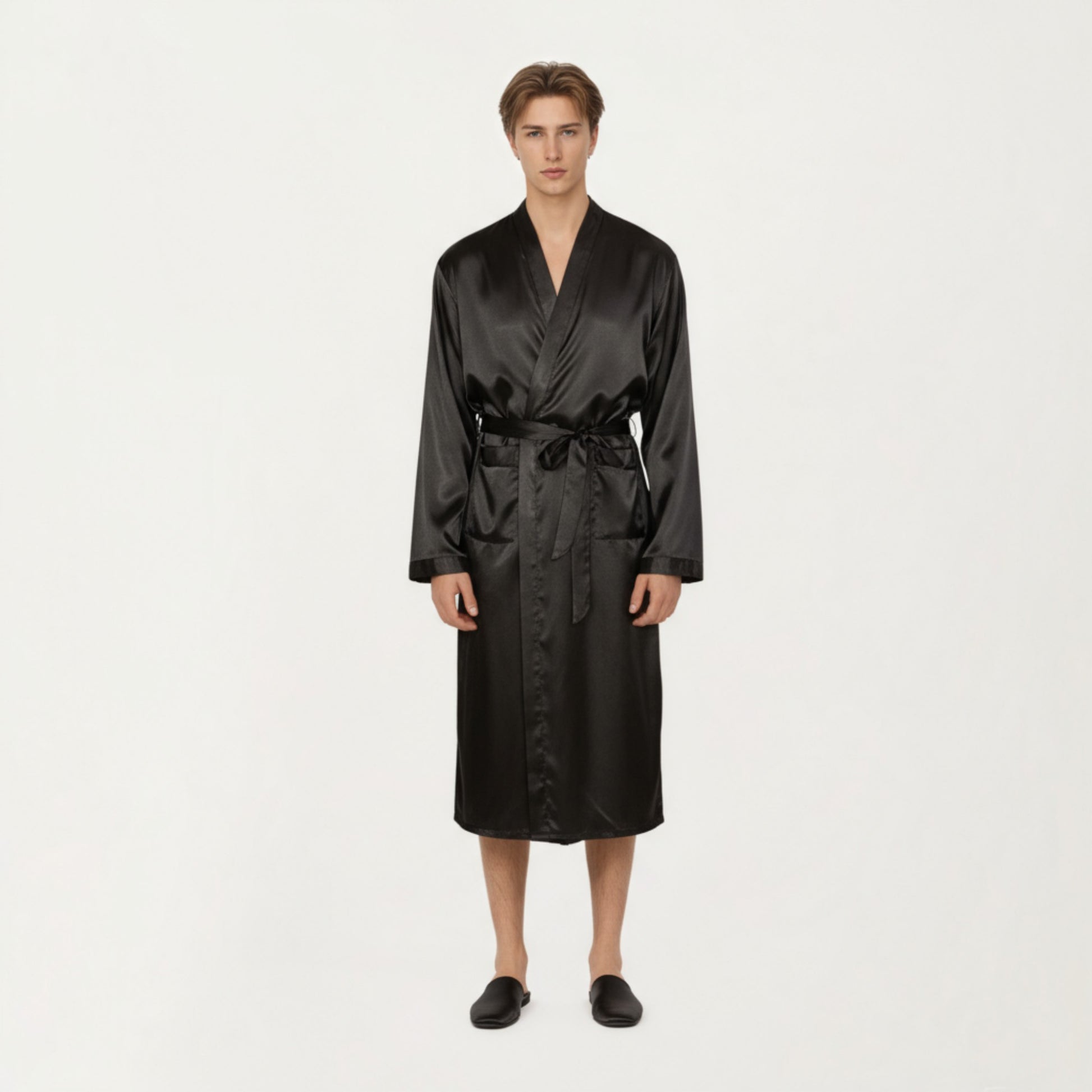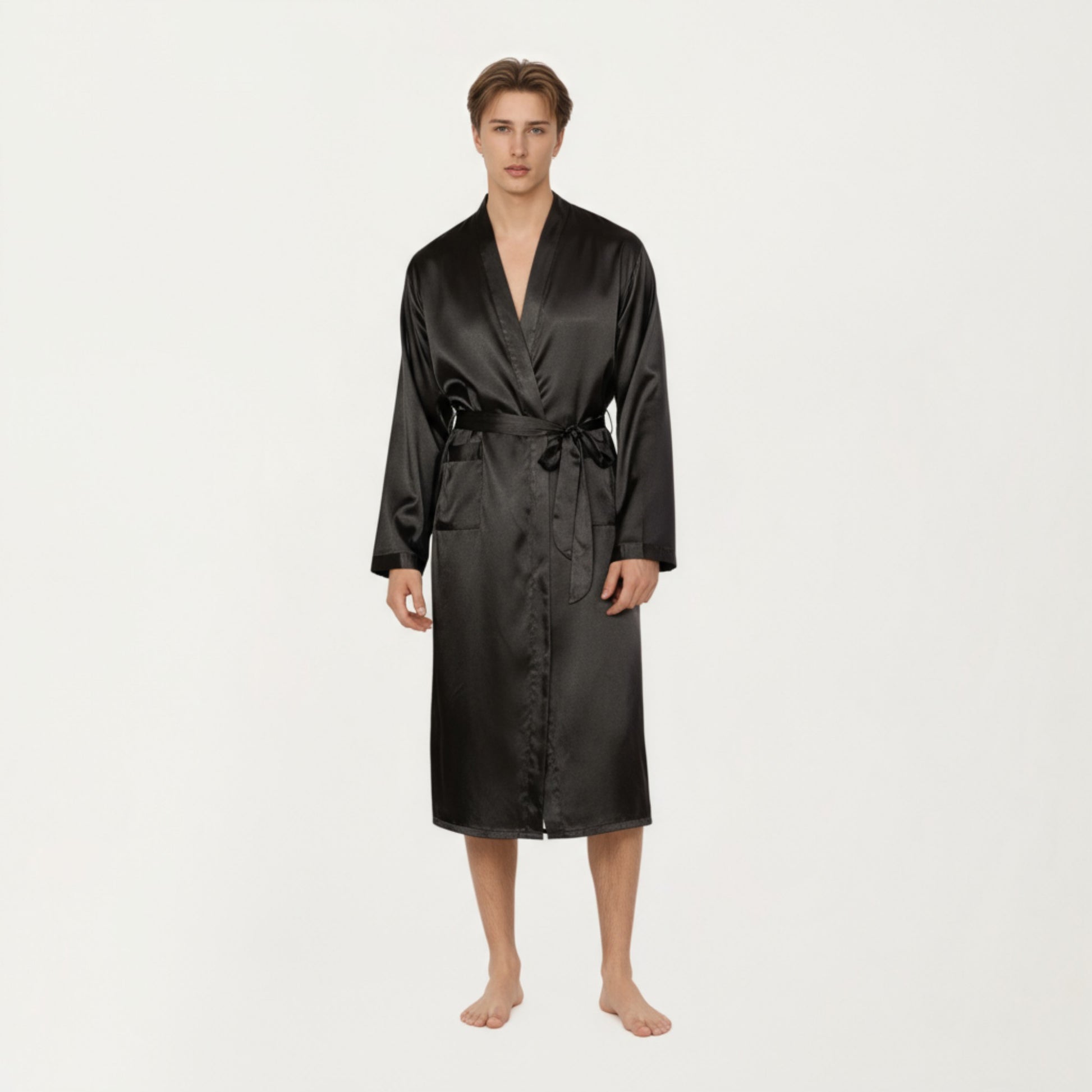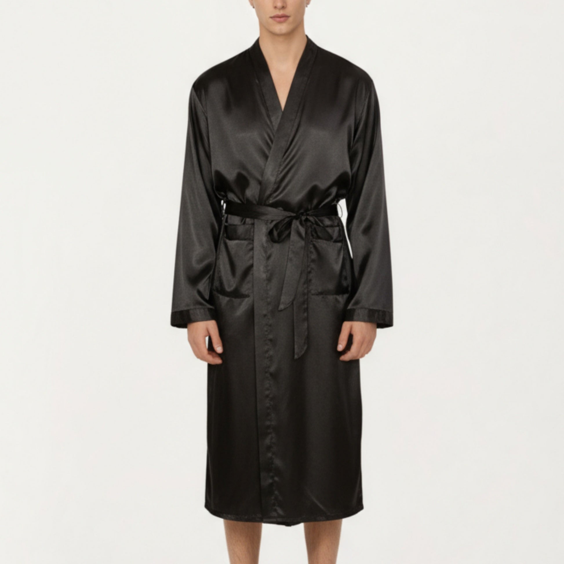 The Anna-Kaci Men's Satin Robe offers a timeless blend of comfort and sophistication. Made from smooth satin fabric, it provides a sleek, soft texture with a luxurious sheen. The design features a classic open front with a self-tie belt for a customizable fit, and two front pockets for added convenience. Lightweight and breathable, this robe drapes elegantly, making it the perfect choice for relaxing in effortless style.