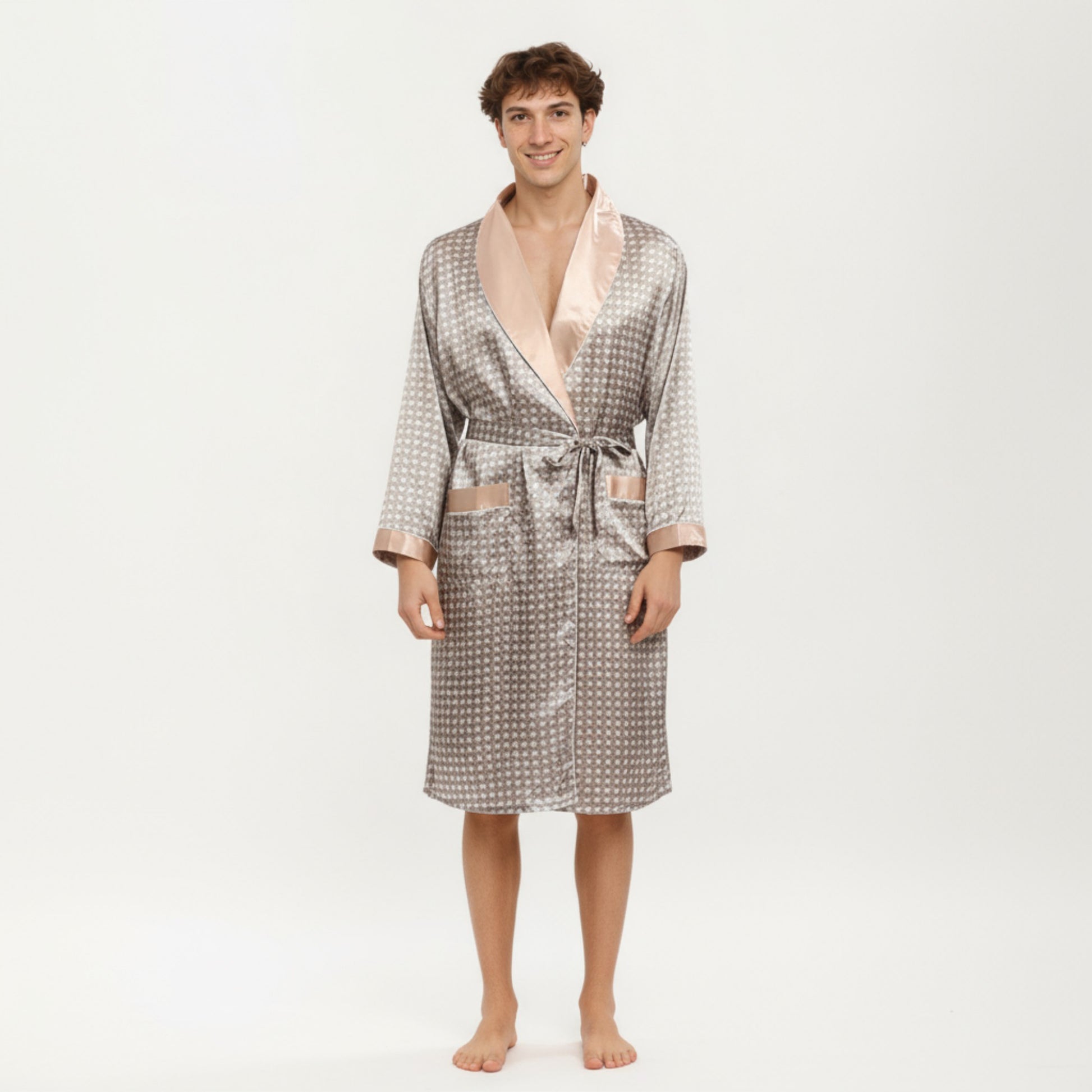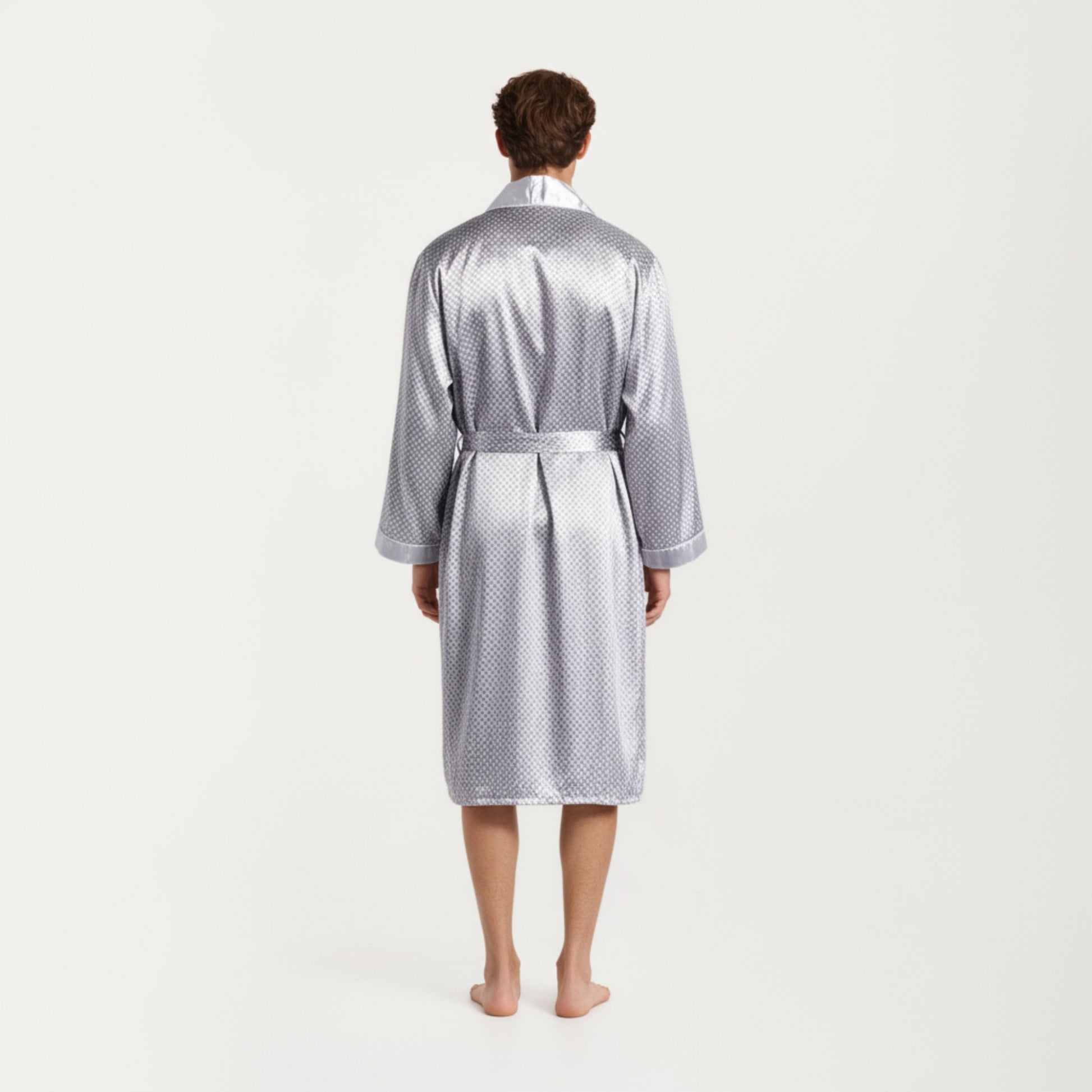 The Anna-Kaci Men's Satin Robe blends modern sophistication with luxurious comfort. Made from smooth satin fabric, this robe features an all-over geometric print and a contrasting shawl collar for a sleek, tailored appearance. The self-tie belt allows for an adjustable fit, while front patch pockets add convenience. Lightweight and silky to the touch, this robe delivers timeless elegance with a refined, contemporary edge.