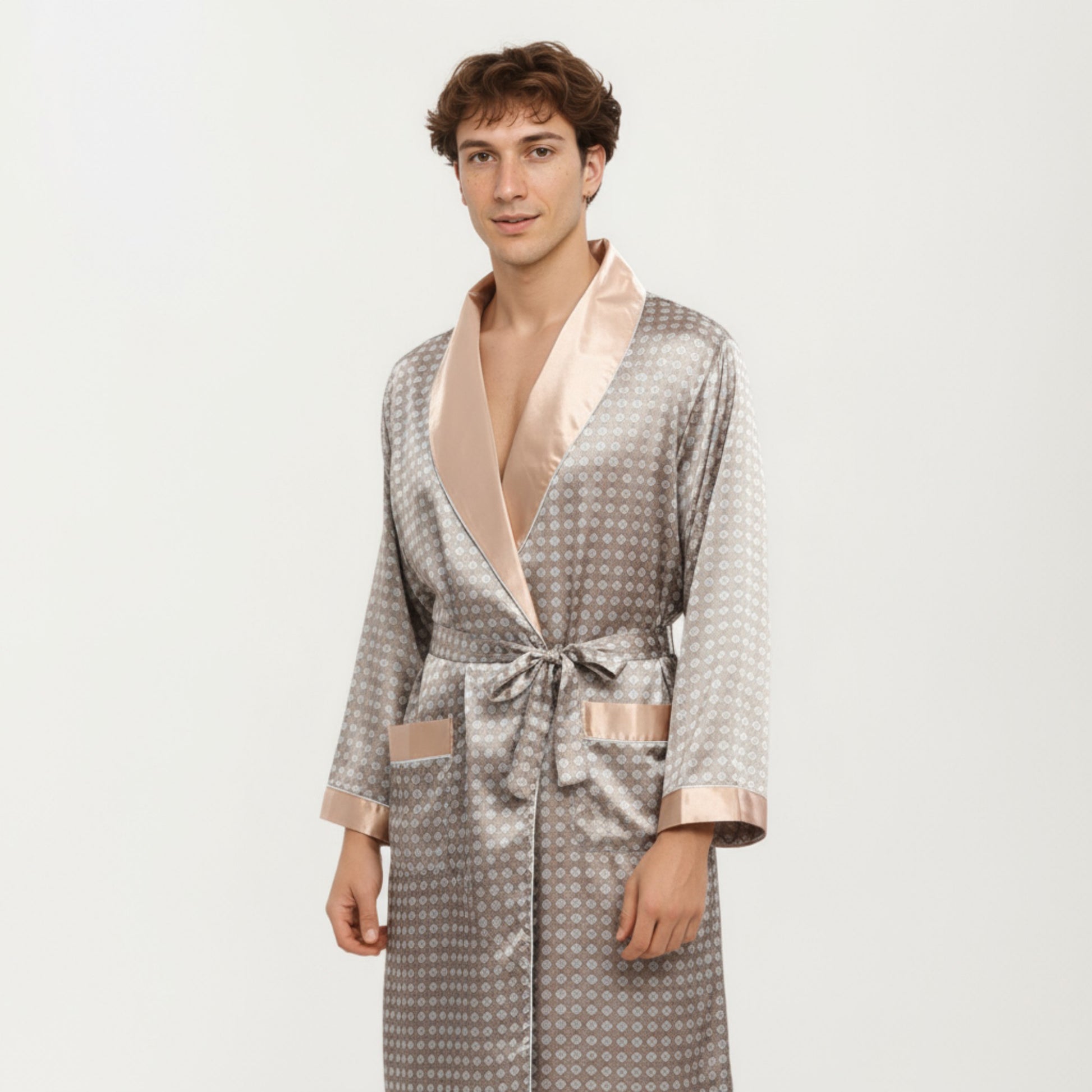 Anna-Kaci Men's Satin Robe with Geometric Print Contrast Shawl Collar and Waist Tie