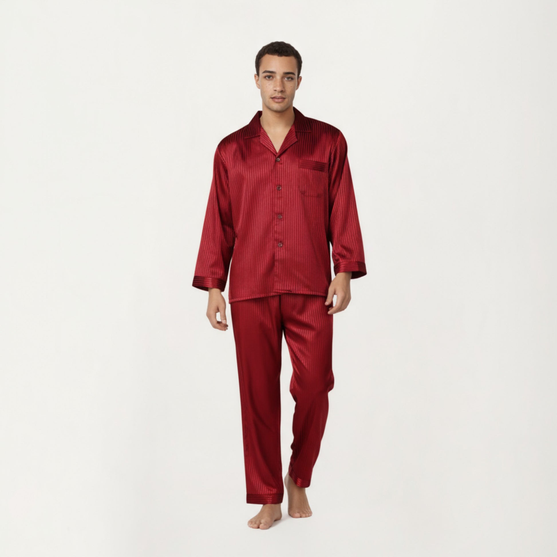 The Anna-Kaci Men's 2-Piece Set Satin Pajamas deliver a sleek and timeless look with a subtle striped design. Made from smooth satin fabric, this set includes a long-sleeve button-up top and straight-leg pants for effortless comfort and style. The notched collar and chest pocket add classic detailing, while the lightweight material ensures a soft, breathable feel. Perfect for relaxing evenings, this set combines refined elegance with everyday ease.