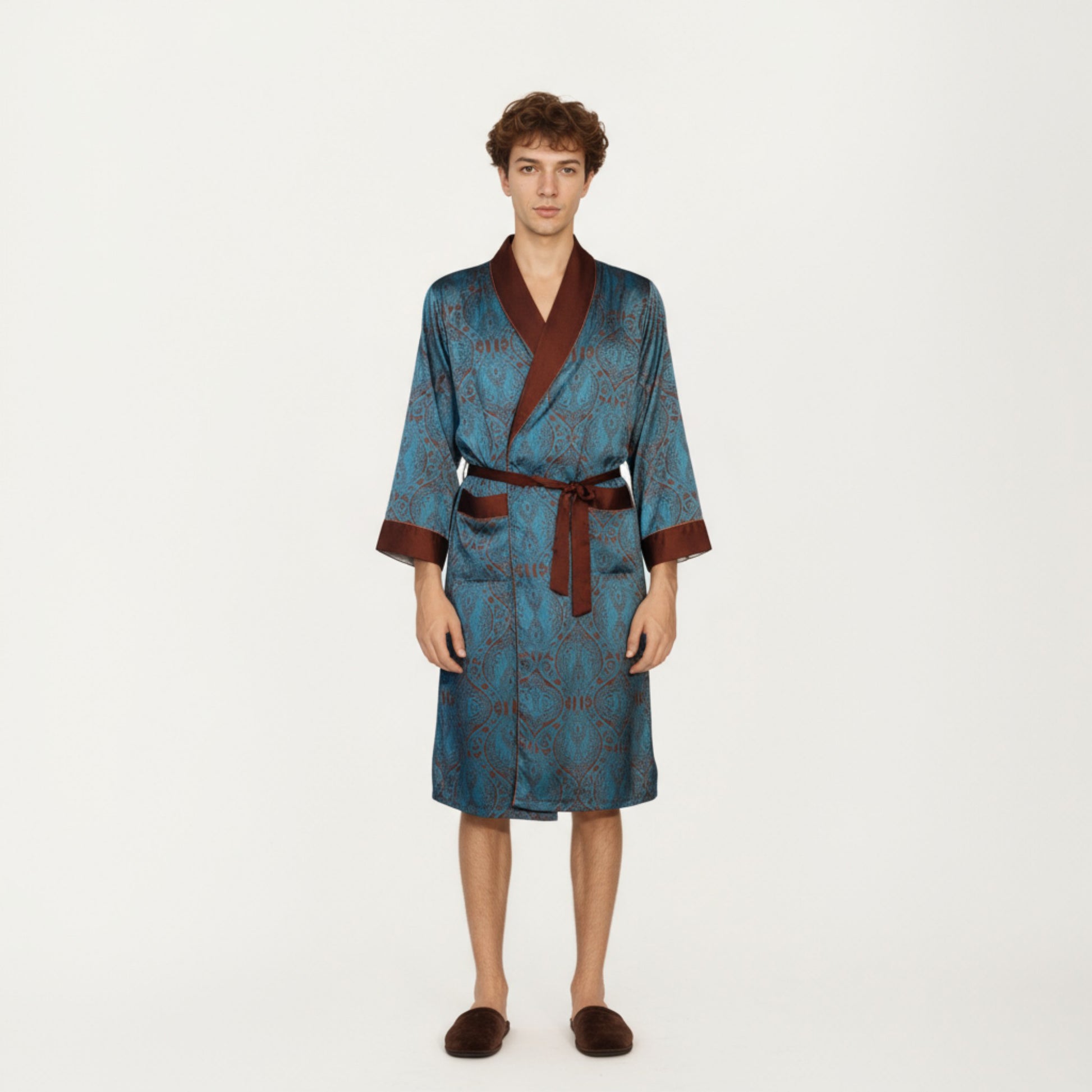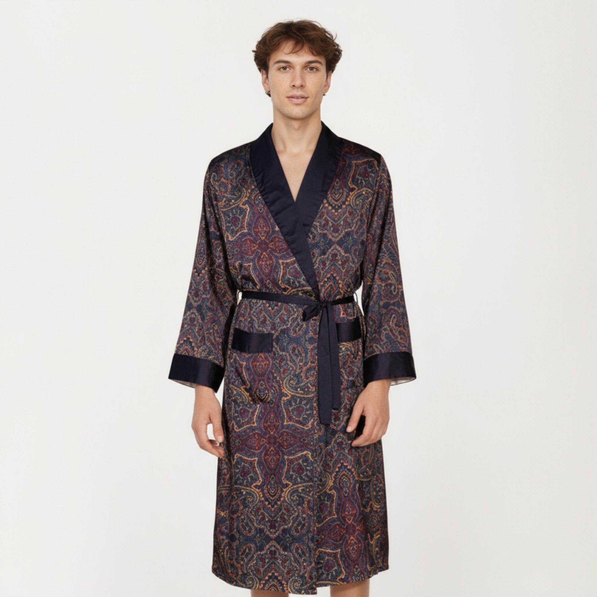 The Anna-Kaci Men's Paisley Print Satin Robe showcases a sophisticated blend of comfort and style. Crafted from smooth, lightweight satin, this robe features an intricate paisley pattern paired with rich contrasting trim on the collar, cuffs, and belt. The self-tie waist provides an adjustable fit, while the front patch pockets offer convenient storage. With its elegant design and silky texture, this robe delivers a luxurious, timeless look that feels as good as it looks.