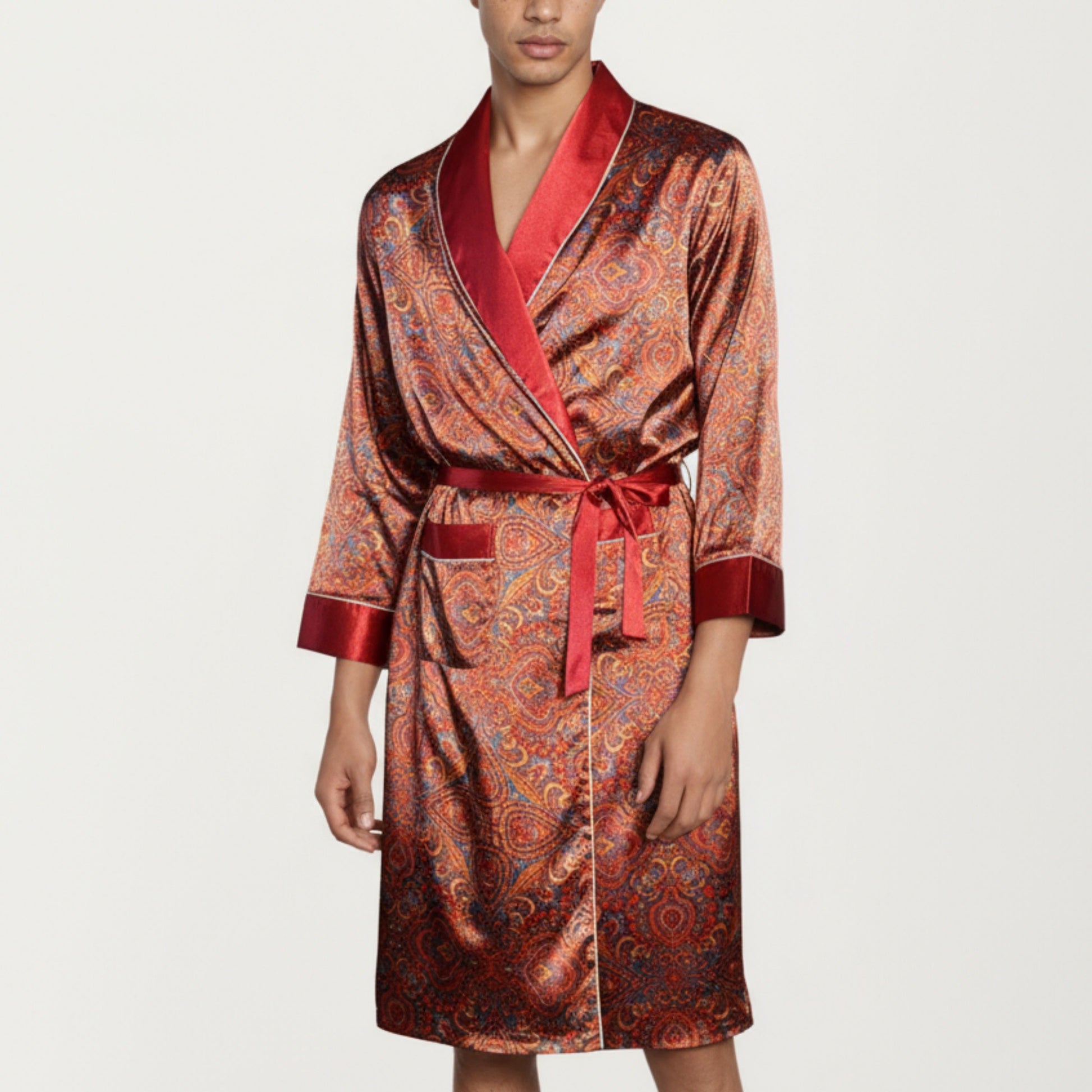 Anna-Kaci Men's Paisley Print Satin Robe with Contrast Shawl Collar and Waist Tie