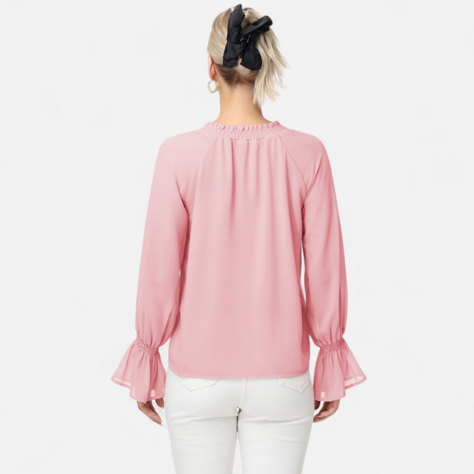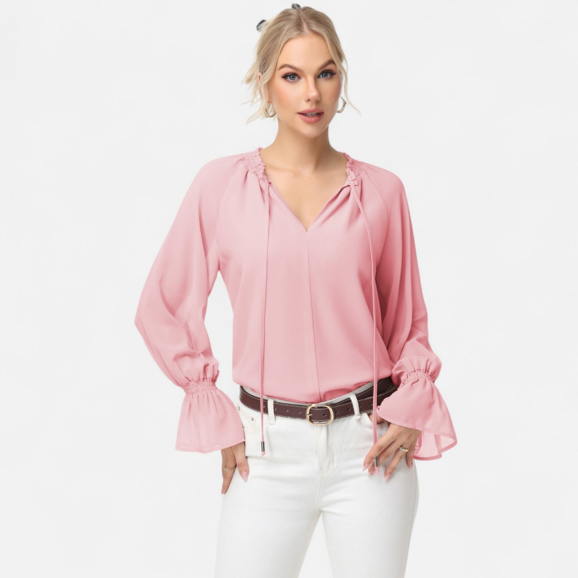 The Anna-Kaci Women's Long Sleeve Blouse features an elegant V-neckline with a delicate ruffle trim and tie detail for a soft, feminine touch. The flounce cuffs add a charming accent to the flowy long sleeves, while the lightweight woven fabric ensures all-day comfort. Designed with subtle texture and graceful lines, this blouse offers an effortlessly chic silhouette. Pair it with jeans or trousers for a polished and versatile look.