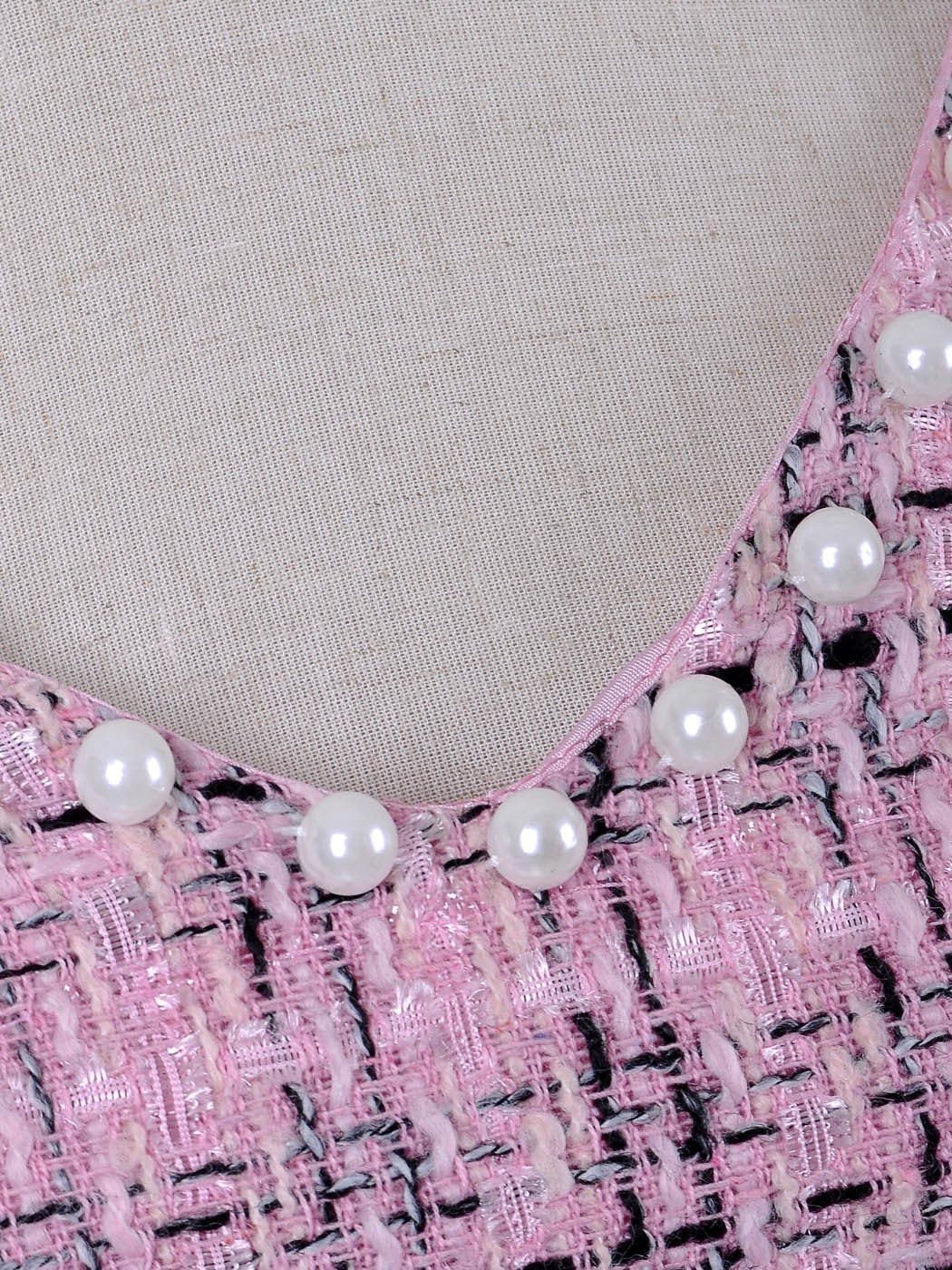 Vestido estilo patinador sobre hielo de tweed rosa con hombros abullonados y ribete de marabú, talla S/M