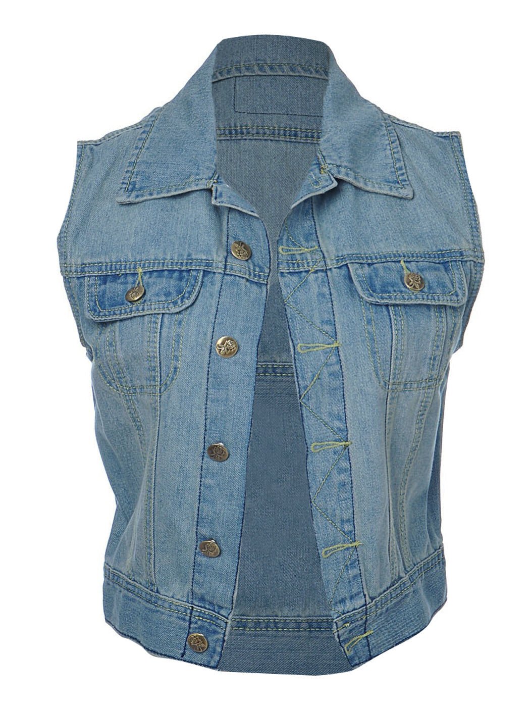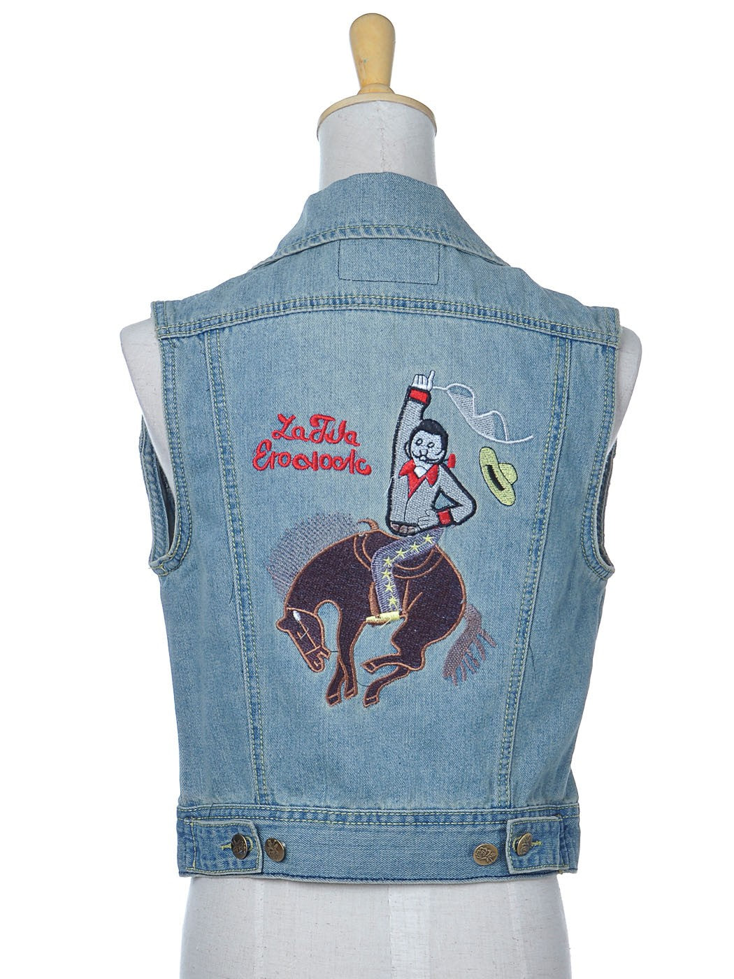 Chaleco corto de mezclilla azul arenado con corte S/M y vaquero de montar en la espalda