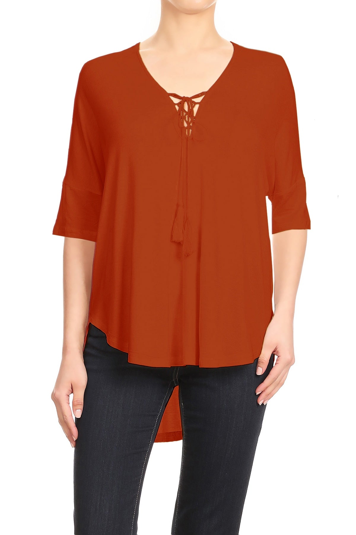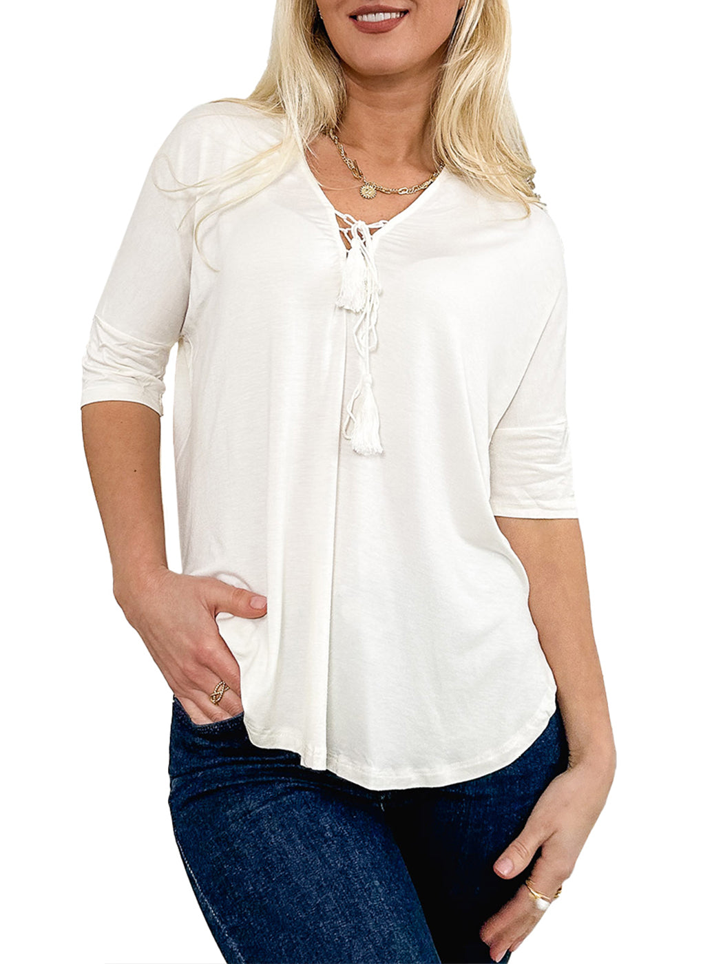 Blusa informal holgada con escote en V y cordones para mujer con mangas cortas estilo dolman