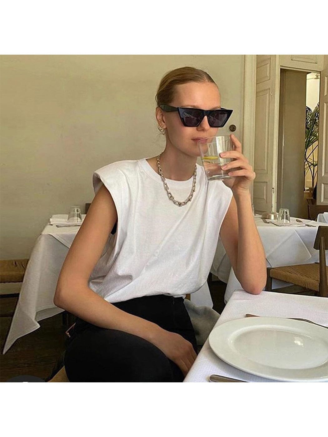 - Características. Está diseñada con hombreras que están de moda en verano. El cuello redondo y el estilo pulóver hacen que sea fácil de usar. Camisetas sin mangas de corte holgado.