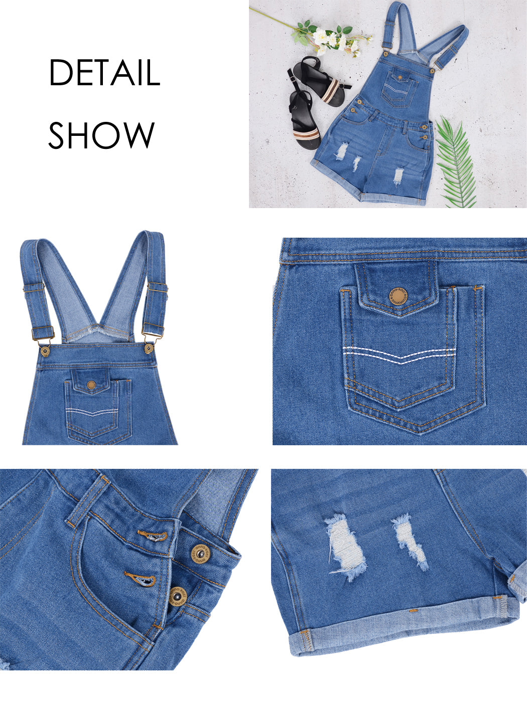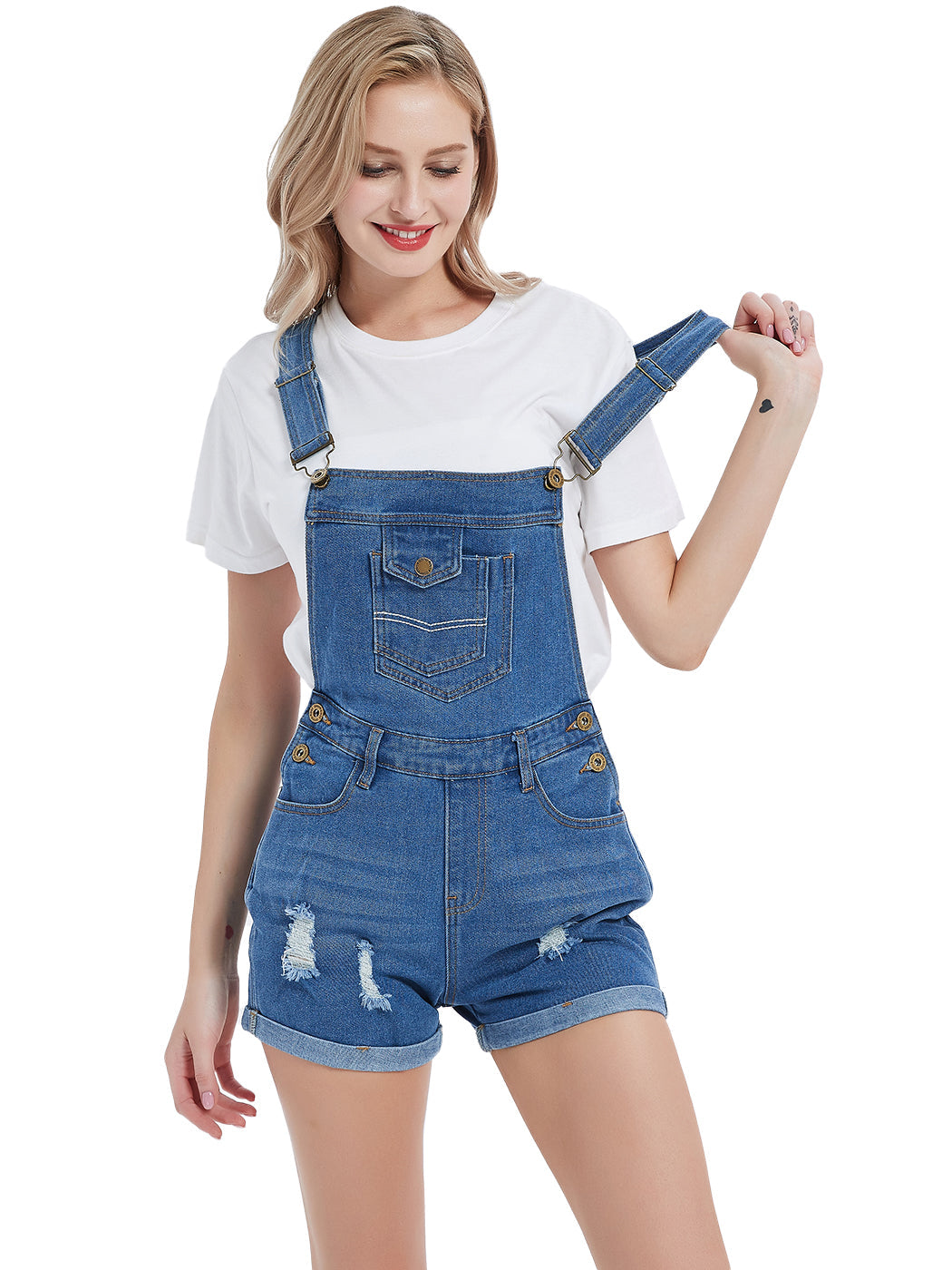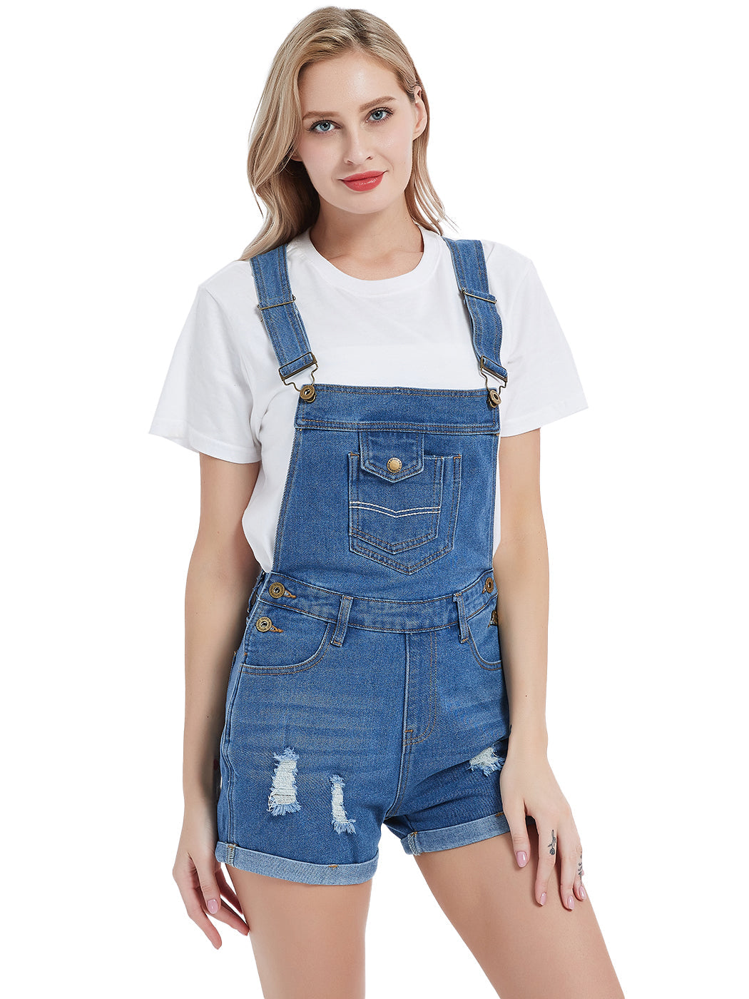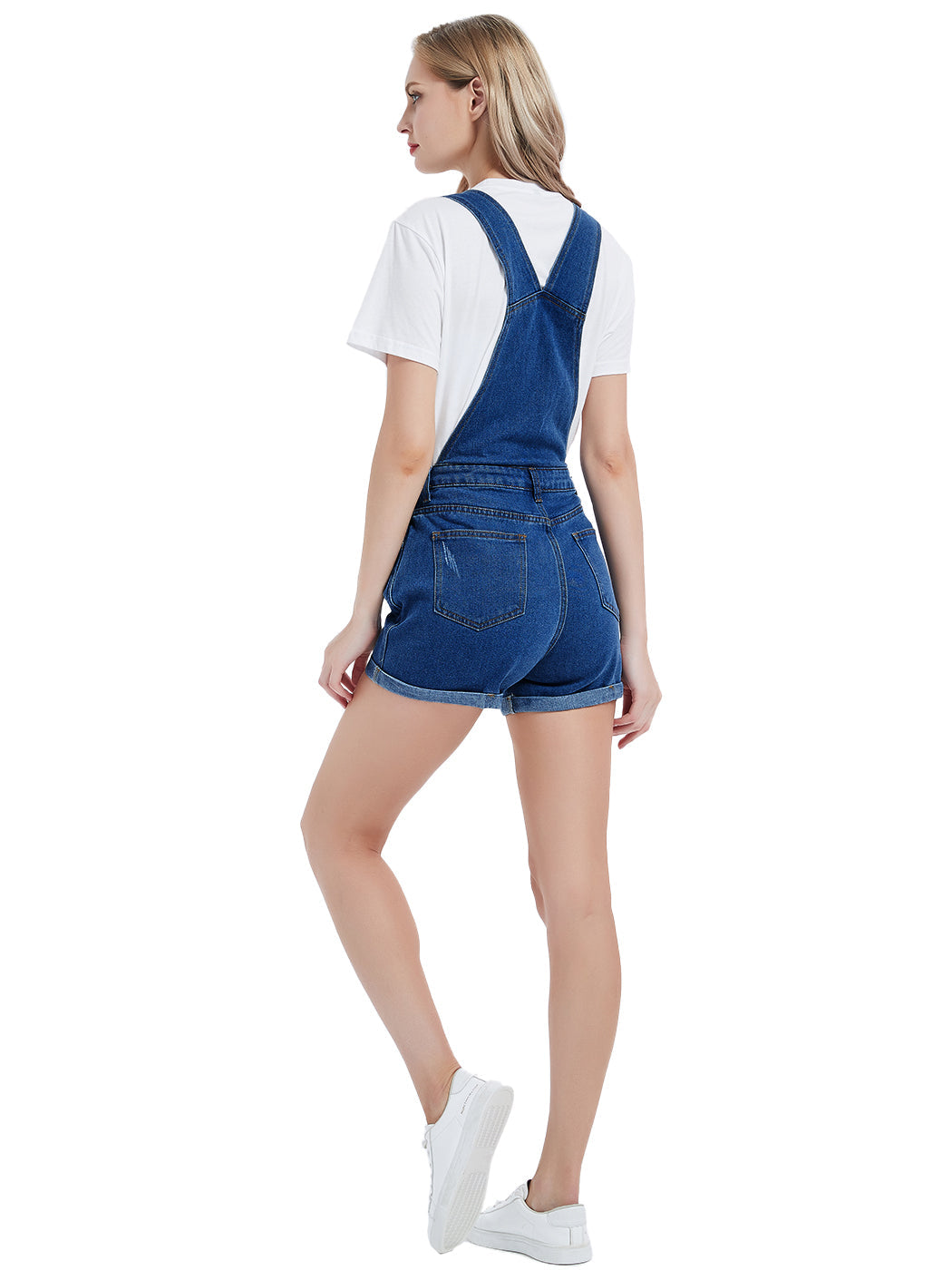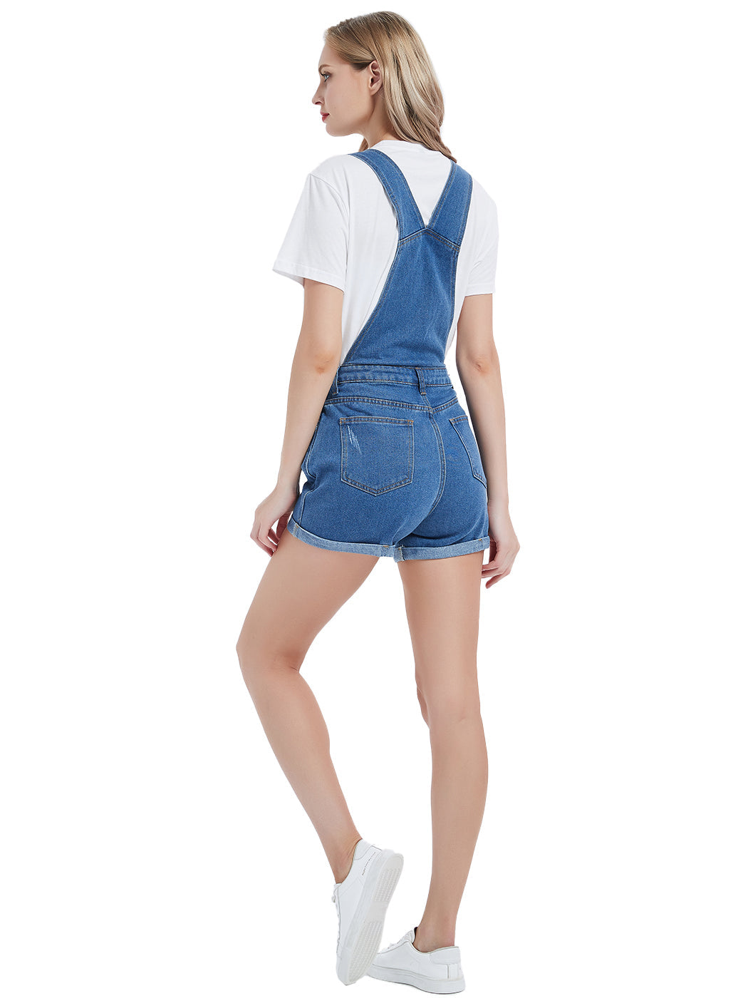 Mono corto desgastado de mujer Anna-Kaci, mono de mezclilla con pechera ajustable y puños enrollados