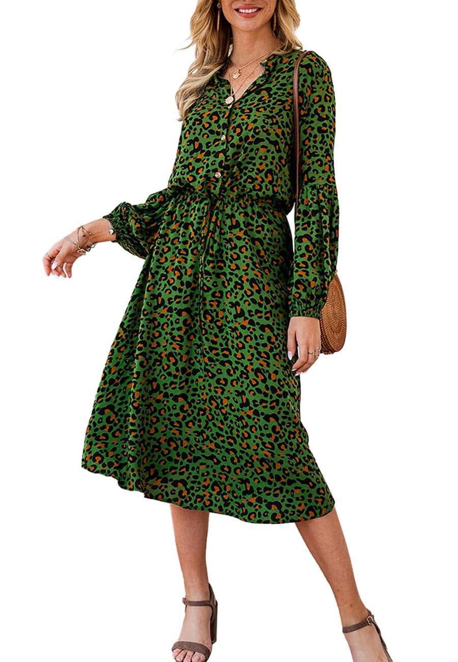- CARACTERÍSTICAS: Estampado de leopardo, escote en V, botones en el pecho, cintura alta, mangas farol, pulóver, mangas largas, vestido línea A.