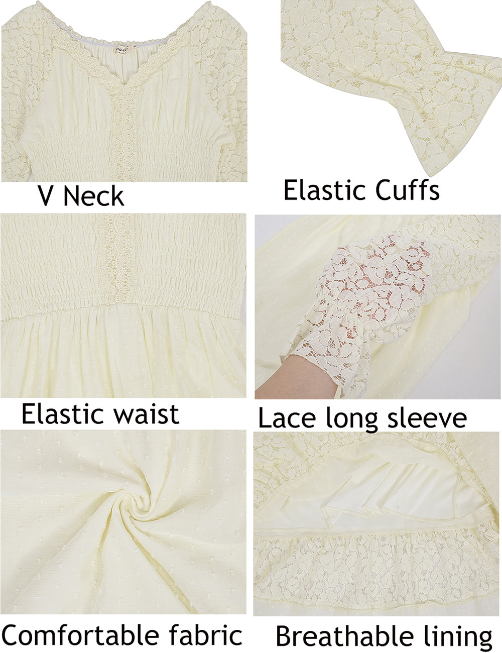 - Vestido de encaje de manga larga para mujer. Este hermoso vestido de hada de manga larga tiene cintura fruncida y detalles de encaje floral. Se puede usar con los hombros al descubierto o con los hombros descubiertos.