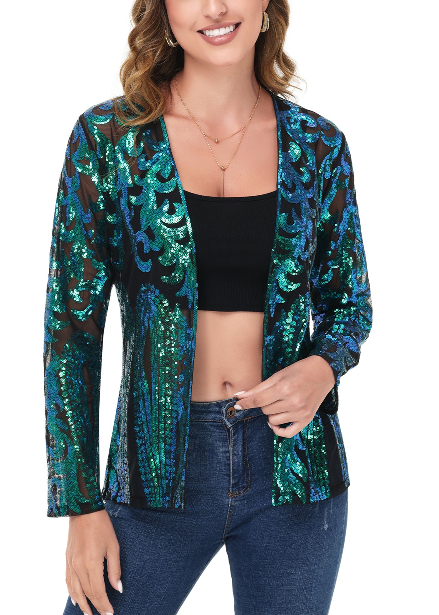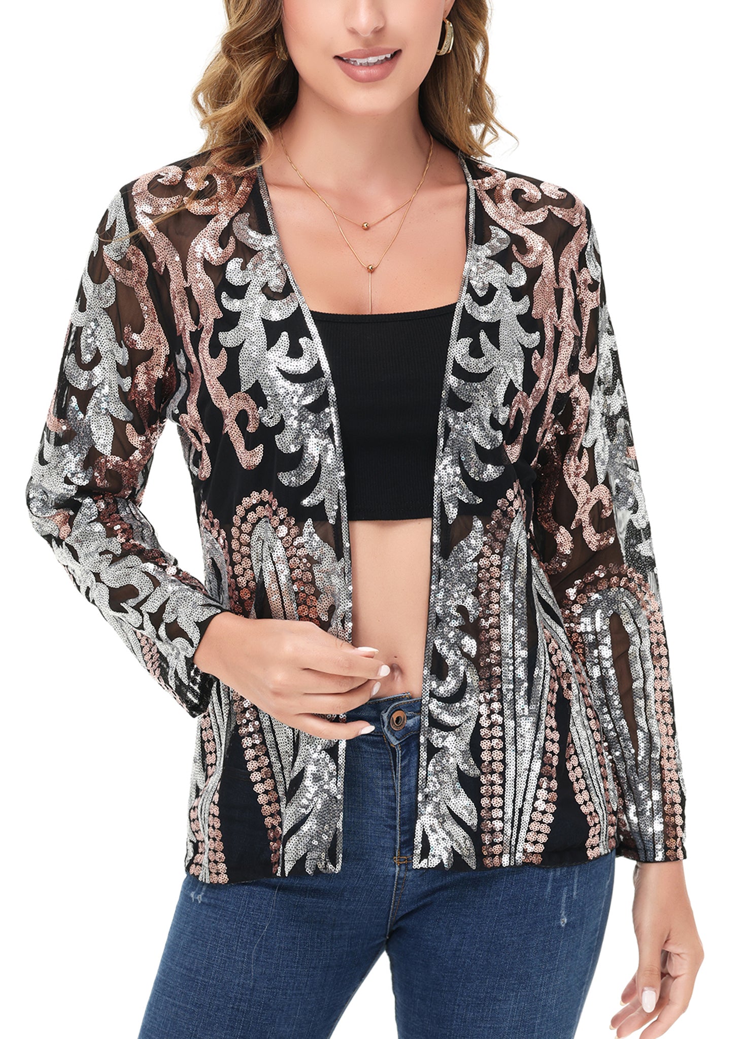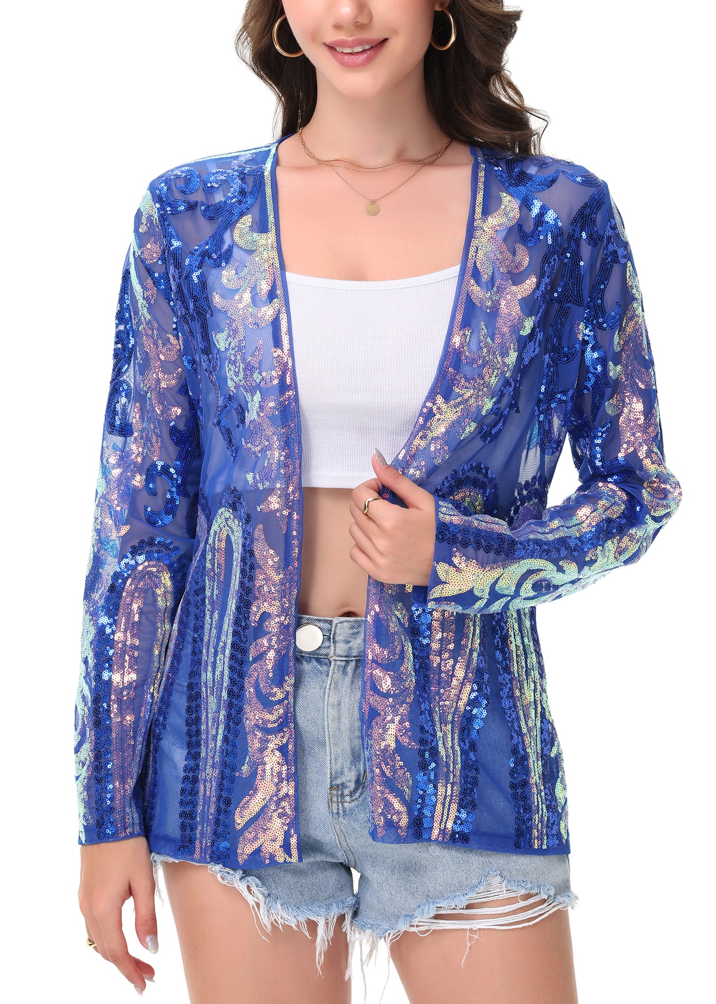 EYE-CATCHING DESIGN. The party evening jacket features sparkly sequins pattern, See Through, long sleeve, open front, standard length, and buttonless design, summer beach cover ups. Our coat is a cardigan without buttons, if you want to close it you can close it with a simple pin.
