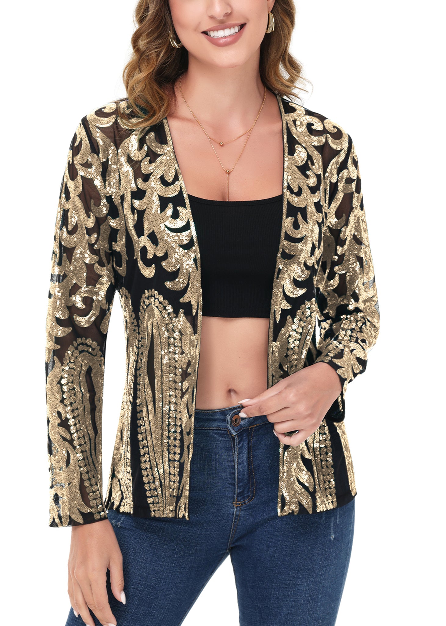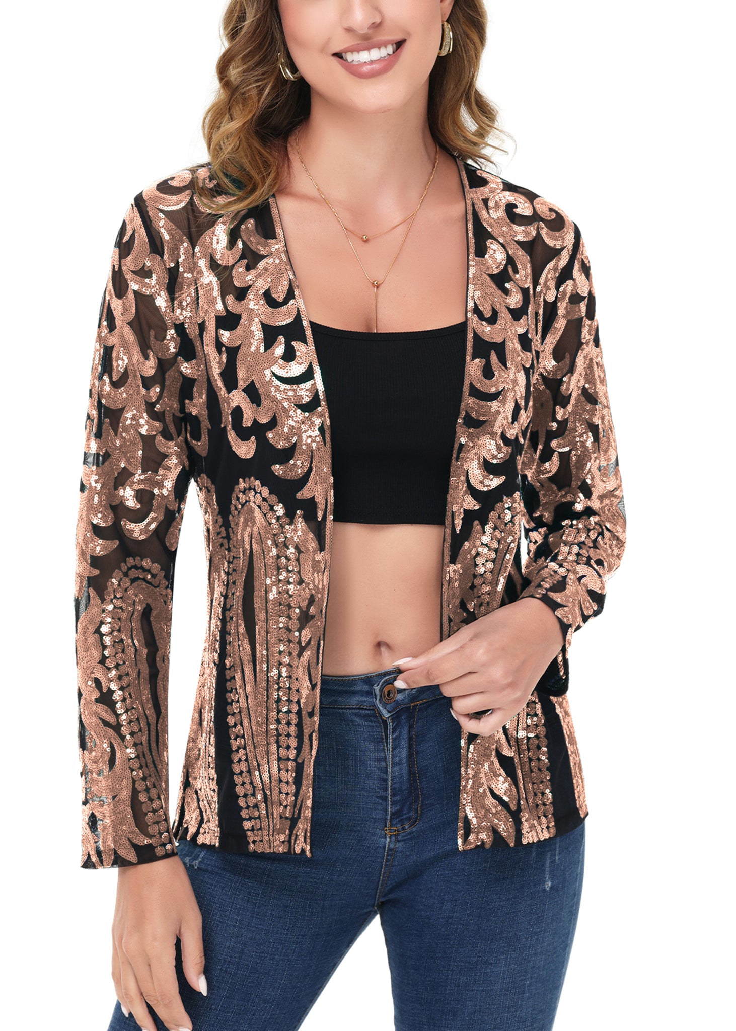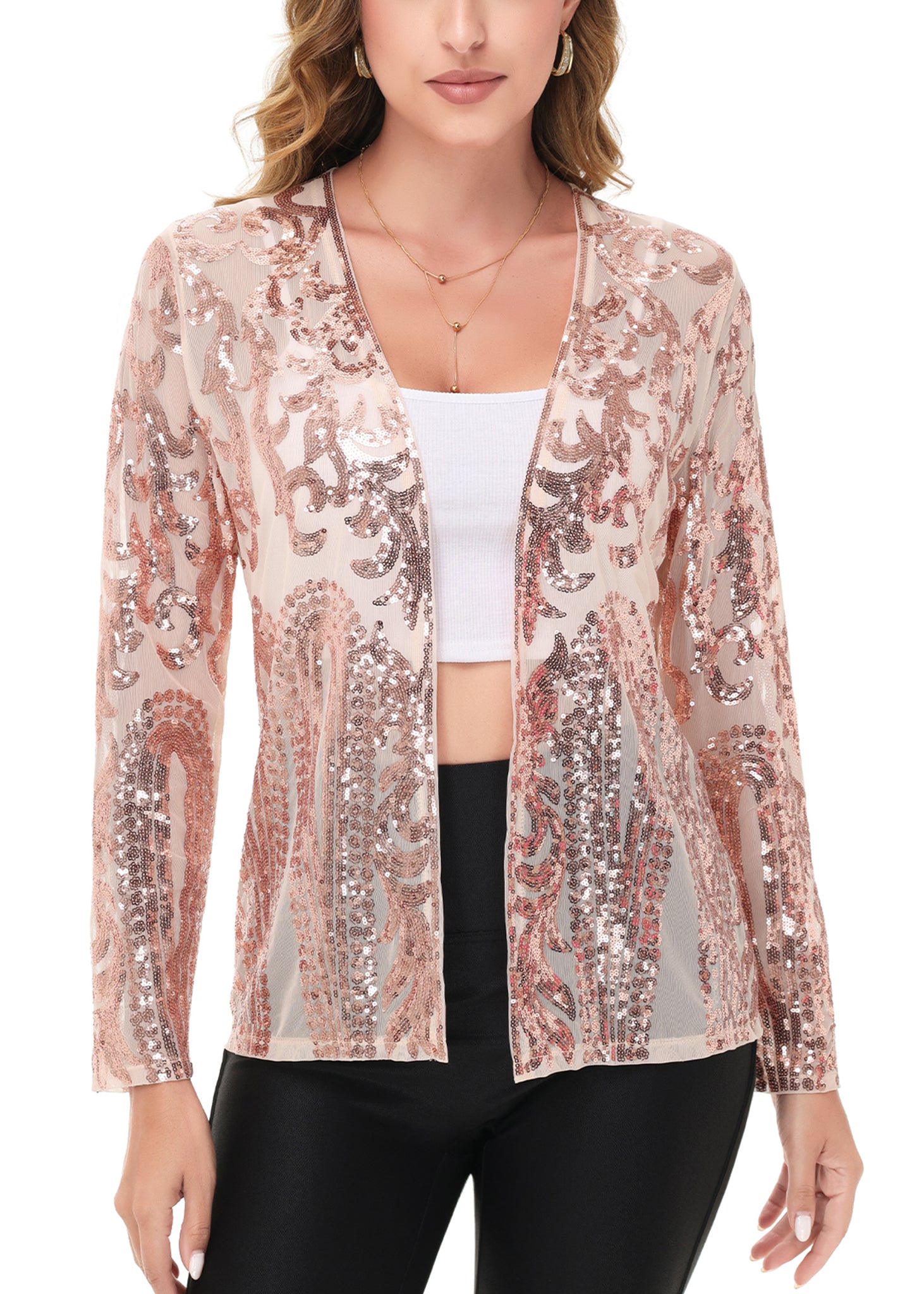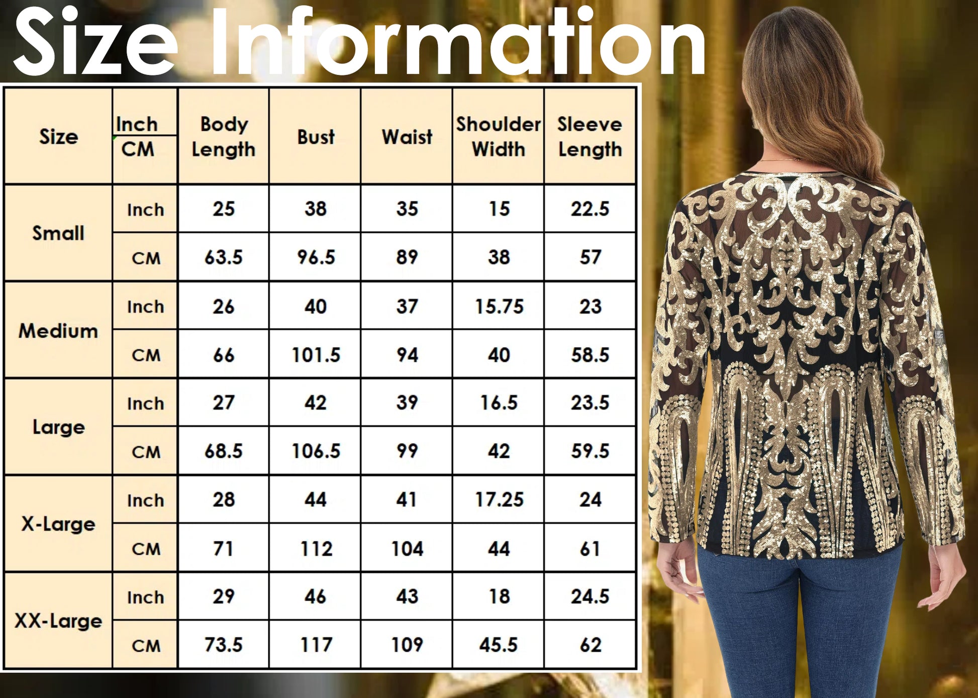 EYE-CATCHING DESIGN. The party evening jacket features sparkly sequins pattern, See Through, long sleeve, open front, standard length, and buttonless design, summer beach cover ups. Our coat is a cardigan without buttons, if you want to close it you can close it with a simple pin.