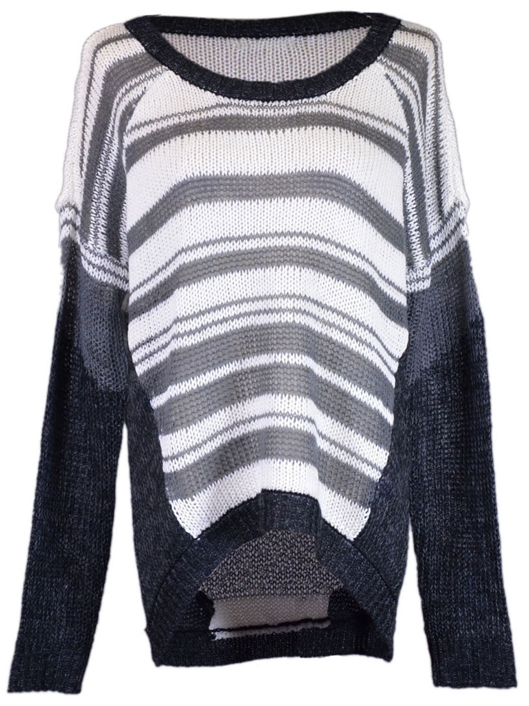 - Get ready for fall in this comfortable knit pullover sweater. A fun trendy striped pullover that is paired great with a pair of denim and sneakers. Details (Measured from SMALL)- SMALL, MEDIUM, LARGE- BUST: 40- ACROSS SHOULDER: 23- WAIST: 38- HIP: 37- FRONT BODY LENGTH: 18- BACK BODY LENGTH: 27- SLEEVE LENGTH: 18- COLOR: GREY/WHITE- MATERIAL: ACRYLIC