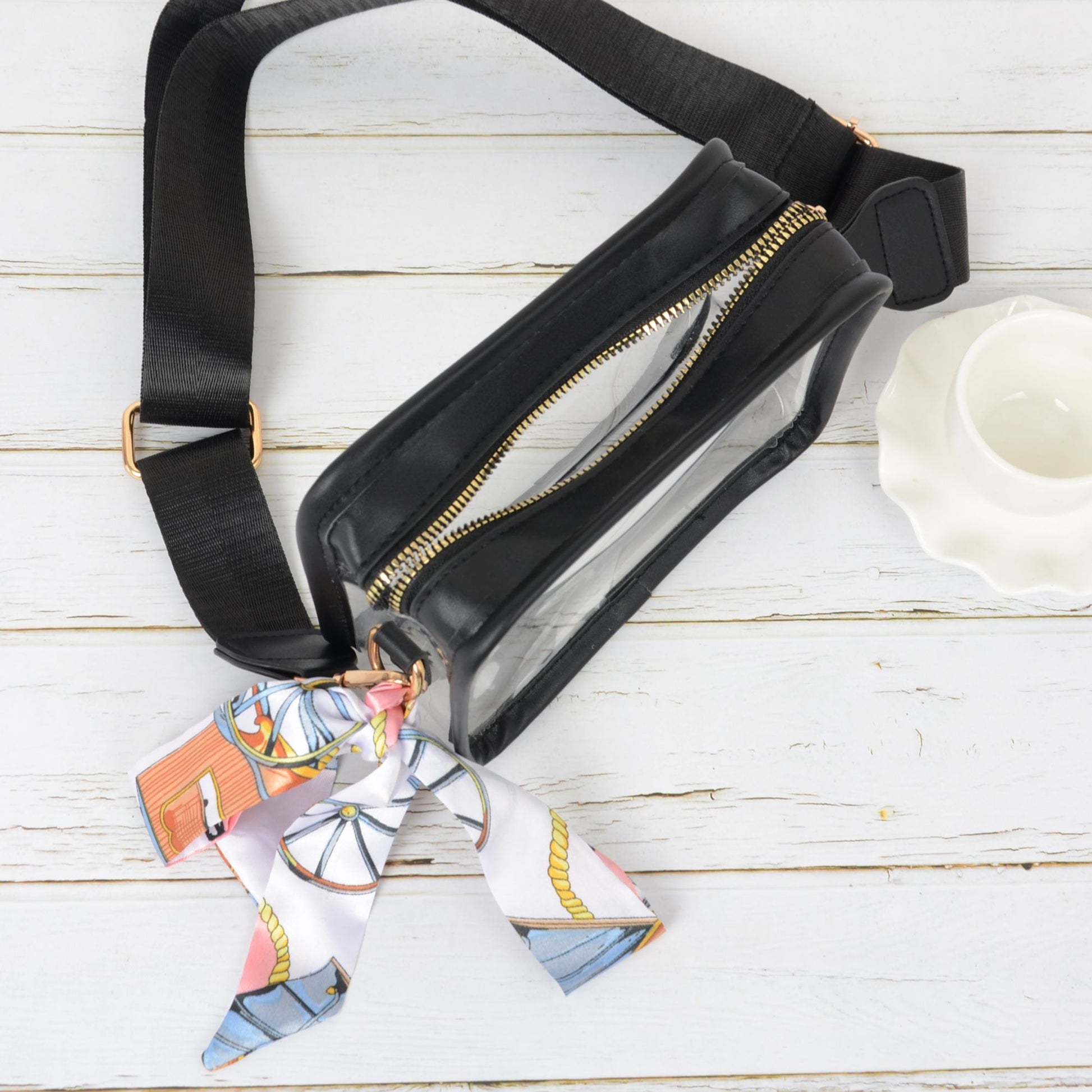 Elevate your style with our Chic Transparent Women's Shoulder Bag with Decorative Scarf. This bag combines functionality with fashion in a unique way. The transparent front panel not only gives it a modern, edgy look but also makes it convenient to locate your essentials without rummaging through the bag. Whether you're at a concert, sports event, or just running errands, you can easily access your items.