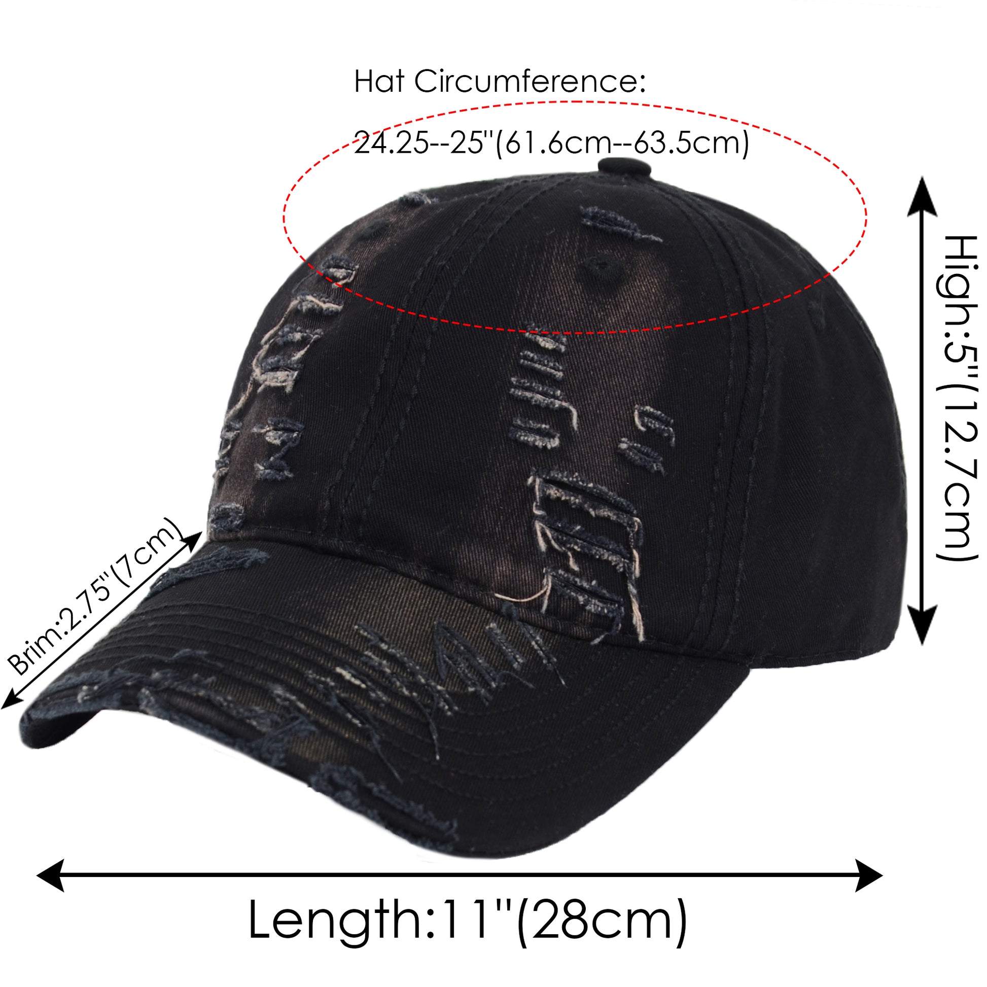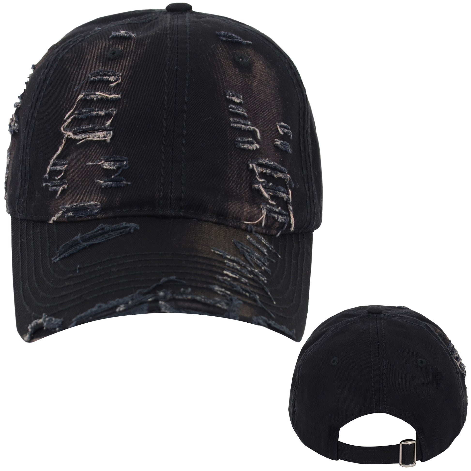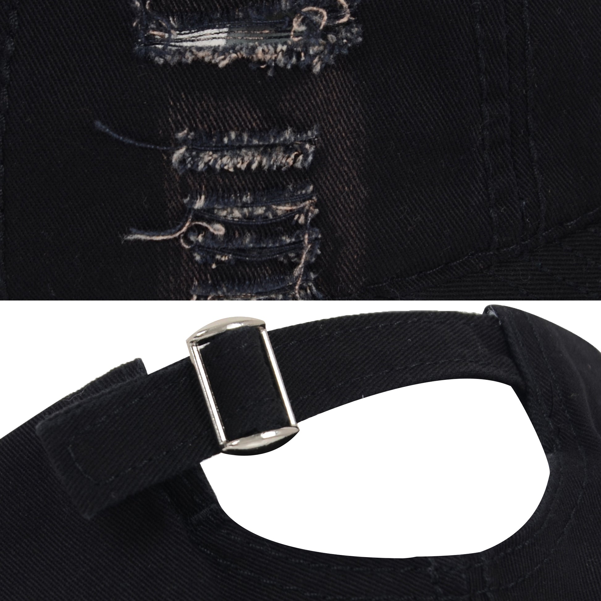 This edgy baseball cap features a distressed design with ripped detailing, adding a bold touch to any casual outfit. Made from durable, comfy cotton fabric, this cap offers both style and comfort, with an adjustable back strap for a customized fit.